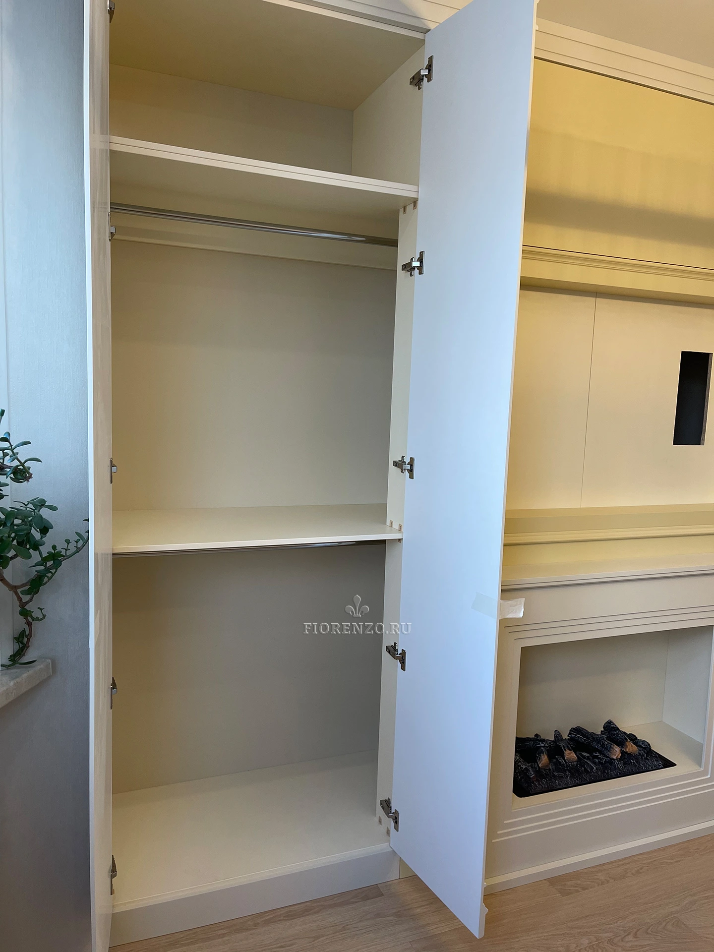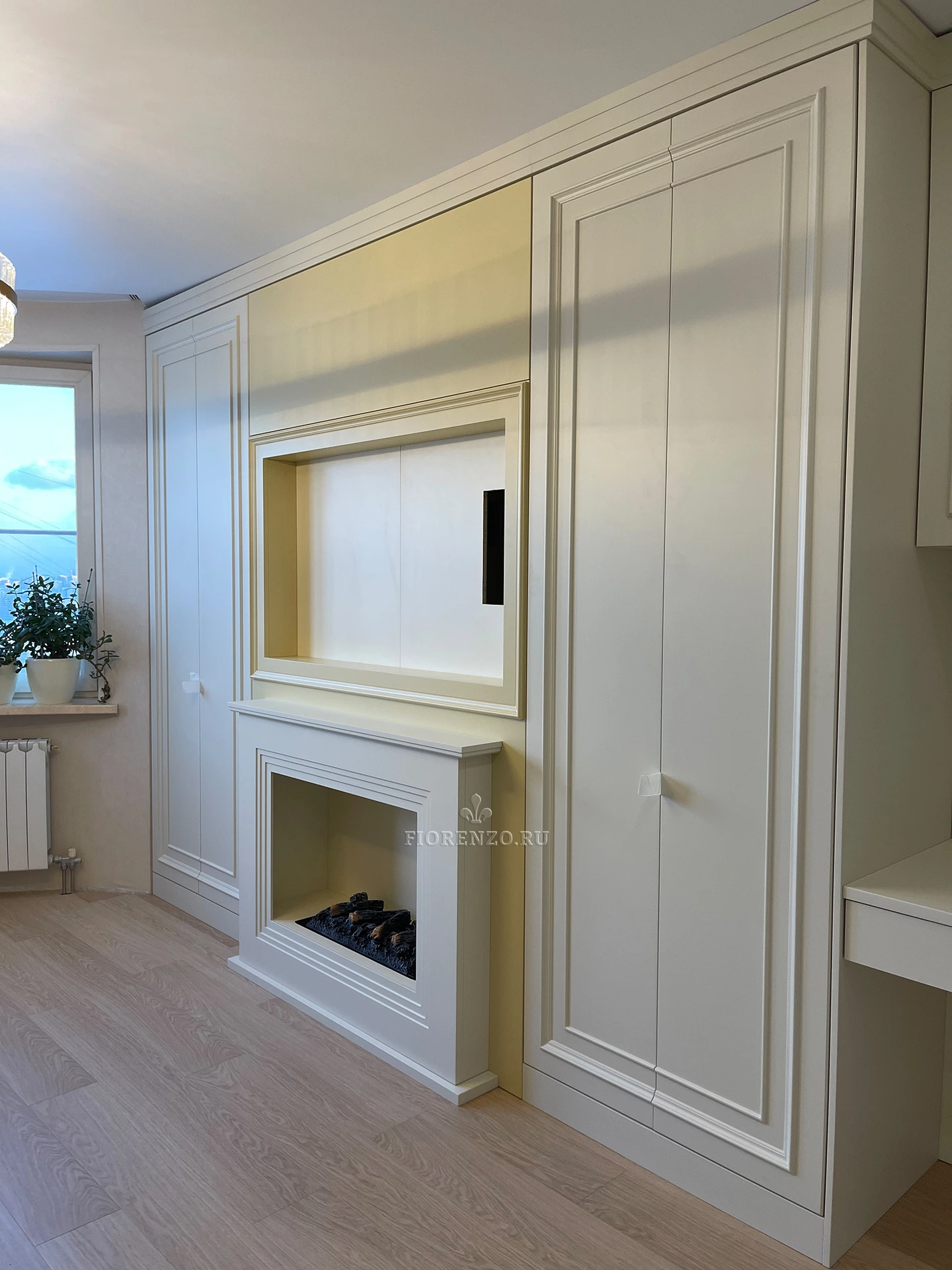 Мастерская «Фиорензо» предлагает вашему вниманию уникальные авторские проекты для разных помещений. Тут вы найдете встроенную, корпусную мебель из импортных материалов. Изготовление по замерам ниши позволяет встраивать шкафы в имеющееся пространство, экономить каждый сантиметр площади. Шкаф «Ирбис» с нишей под ТВ в гостиной – это готовый гарнитур, в нем есть все необходимое. Основные составляющие – два закрытых шкафа с распашными створками, стол, ниша по телевизор. Есть подвесной шкафчик с дверками со стеклянными вставками (стекло матовое). Акцентным элементом будет декоративный камин.