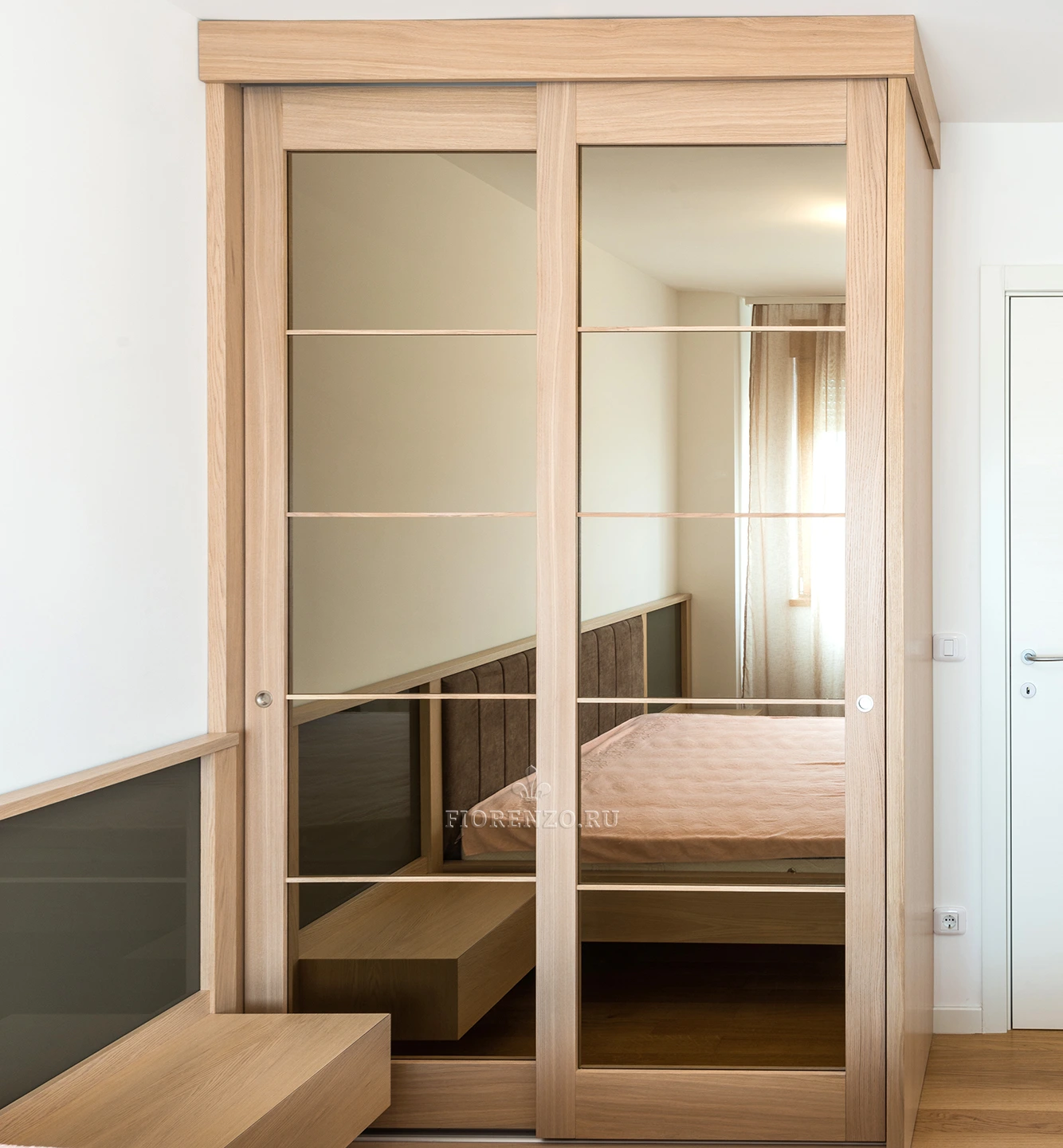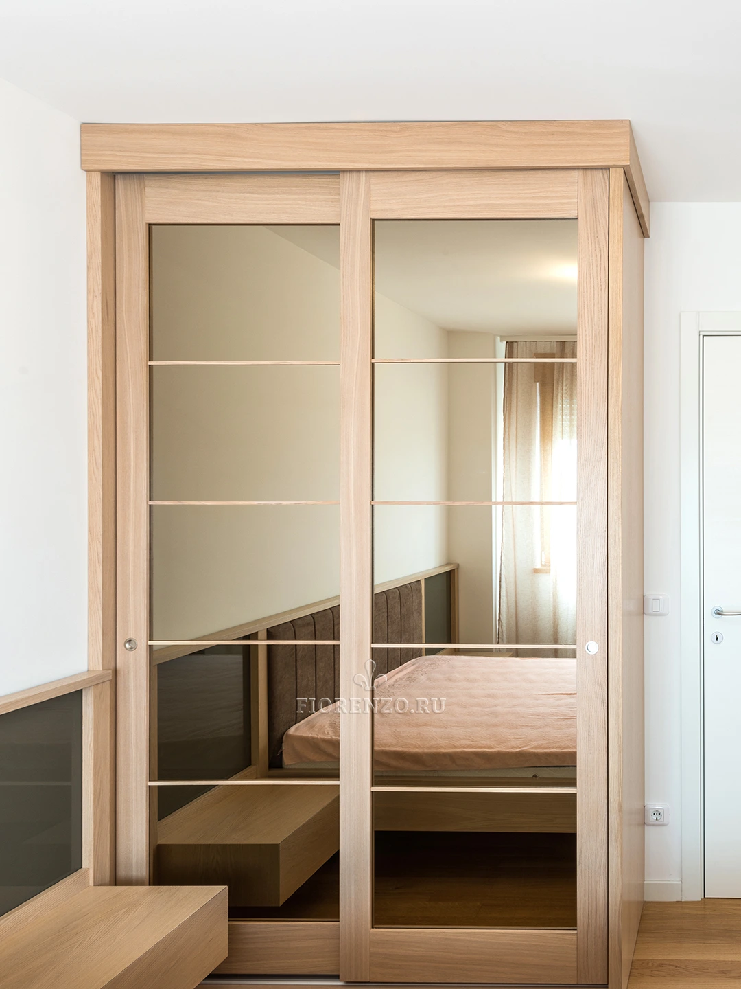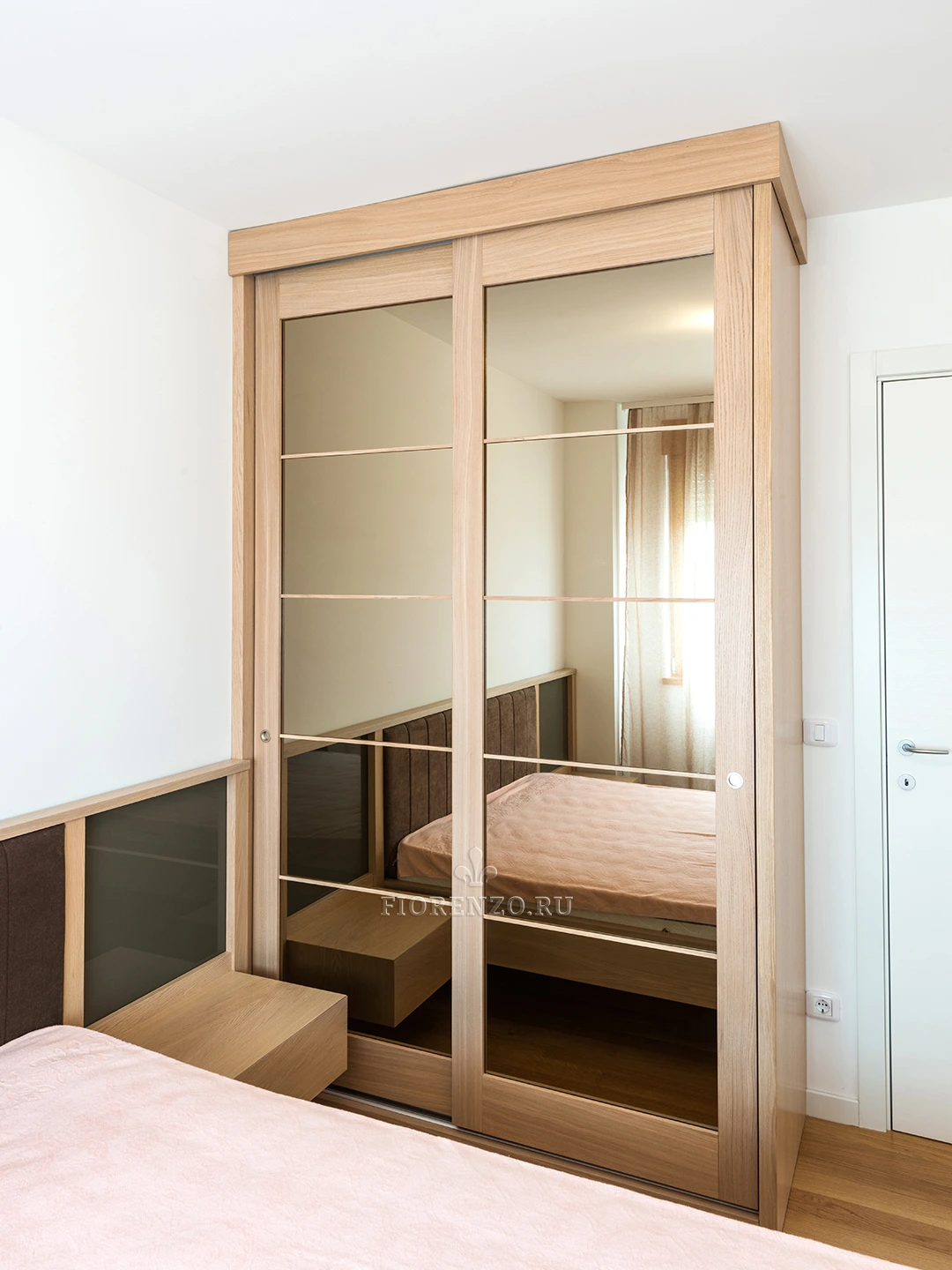 Все элементы шкафа-купе в спальню изготовлены из МДФ, покрытого шпоном натурального дуба. На зеркалах сзади наклеена специальная противоударная пленка, предотвращающая их высыпание в случае разбития. Установлена фурнитура австрийской компании Blum.
