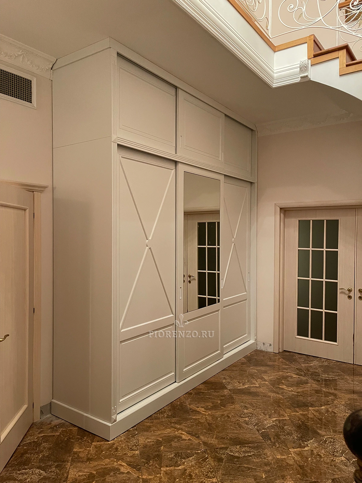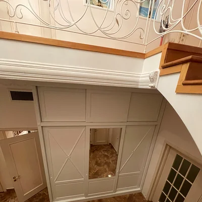 Элегантный шкаф-купе для холла с зеркальной вставкой и декоративной фрезеровкой. Высокая конструкция до потолка обеспечивает максимальную вместительность, а светлый оттенок фасадов визуально расширяет пространство. Идеально вписывается в классический интерьер, подчеркивая статус и стиль владельца.