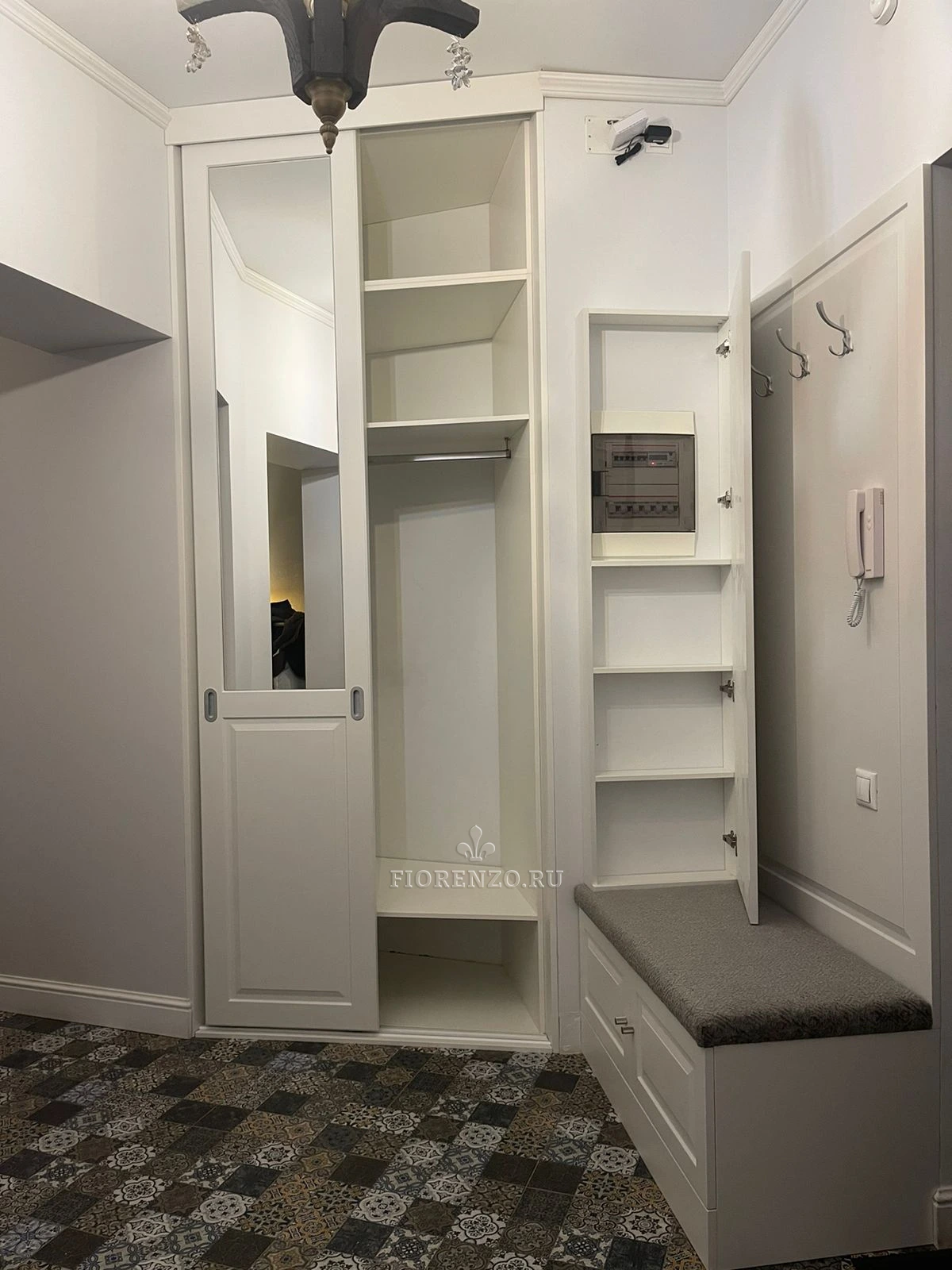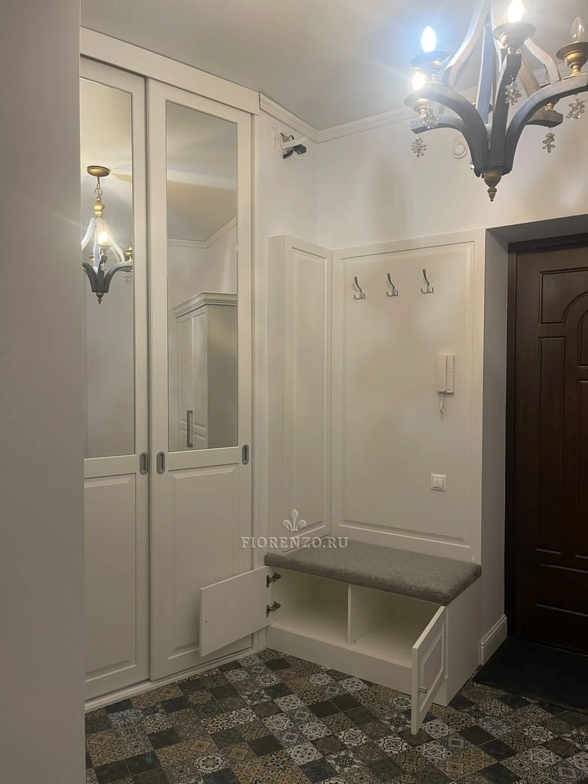 Элегантный встроенный шкаф-купе в прихожую, выполнен в классическом стиле с зеркальными вставками и филёнчатыми фасадами. Идеален для хранения верхней одежды и обуви, экономит пространство коридора и визуально увеличивает помещение.