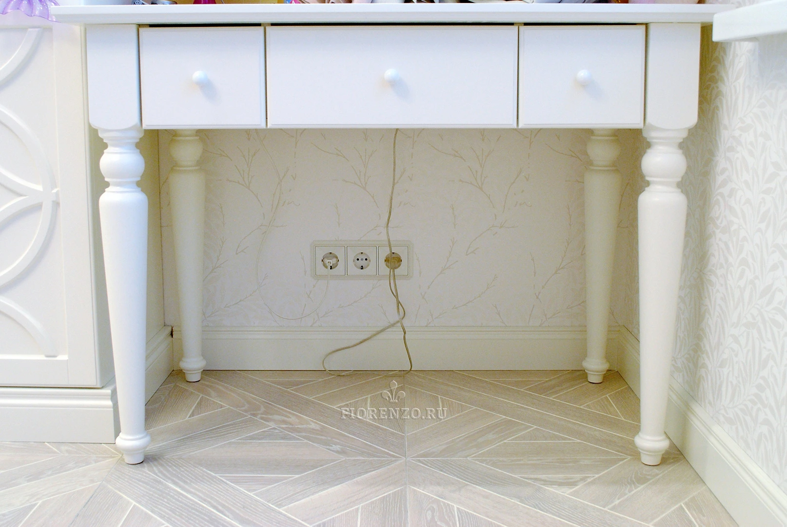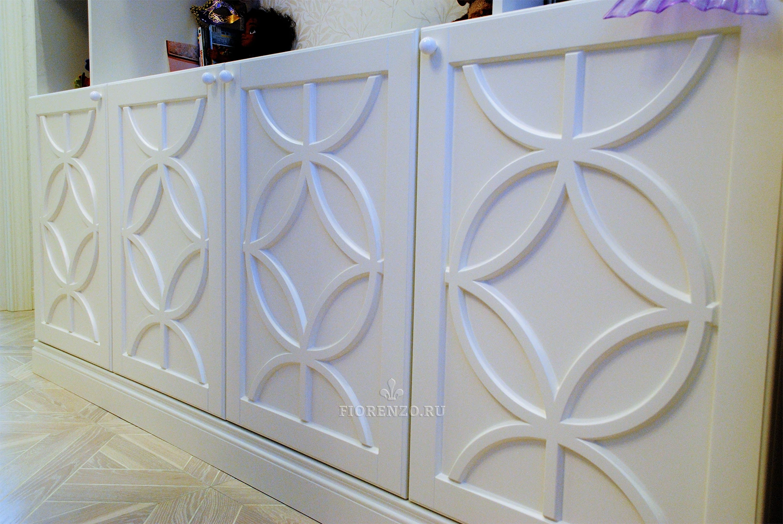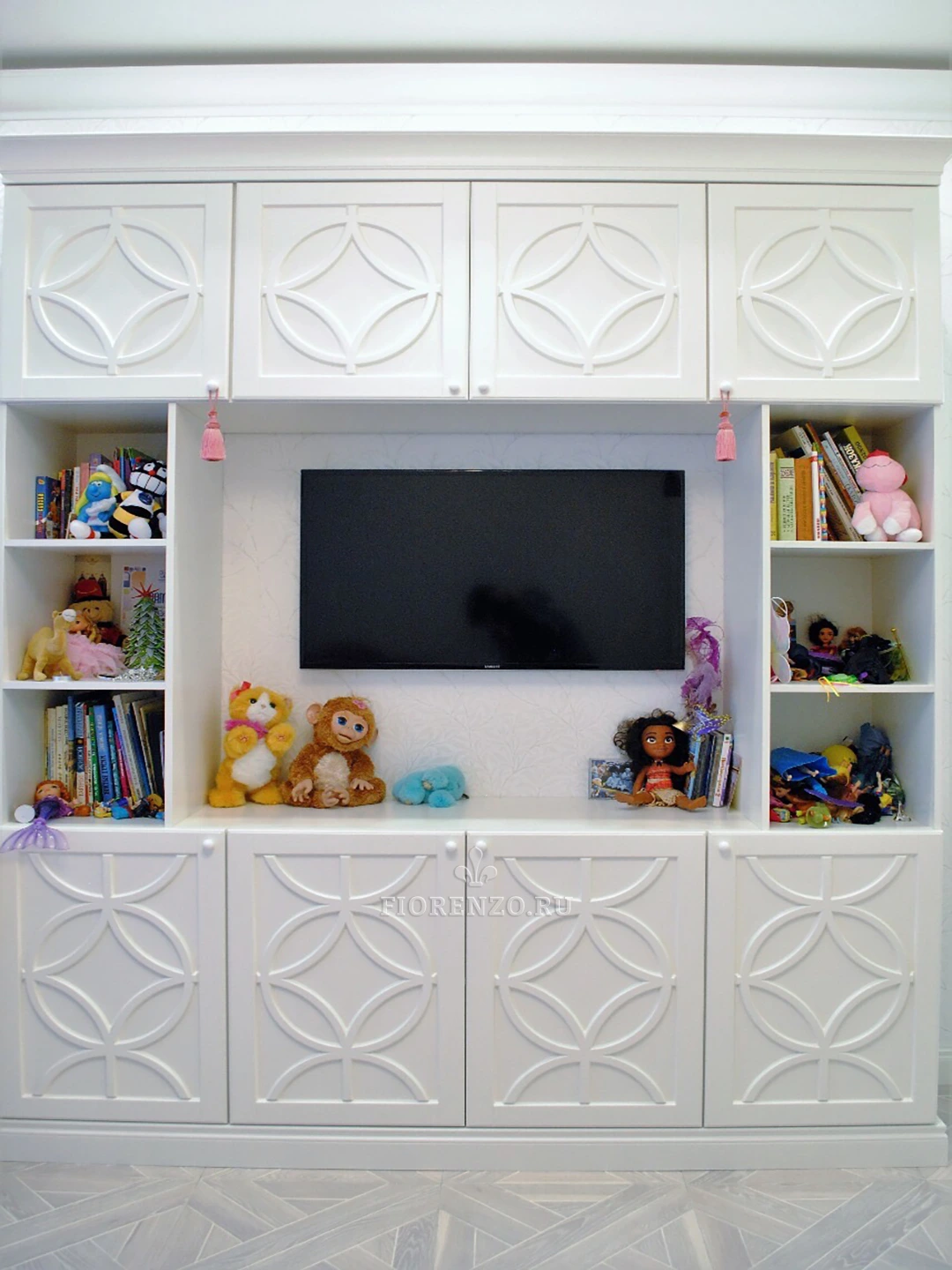 Шкаф с зоной под ТВ в гостиную «Альгеро» , с индивидуальной 3д фрезеровкой на фасадах. Изготовлена мебель по индивидуальному дизайн проекту на собственном производстве «Фиорензо Мебель». В качестве материалов корпуса шкафа использовался ЛДСП Egger класса экологичности E1. Фасады изготовлены из МДФ с фрезеровкой на станке с программно-числовым управлением (ЧПУ). Ножки туалетного столика из массива бука, столешница МДФ, ящики BLUM с доводчиками.