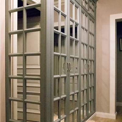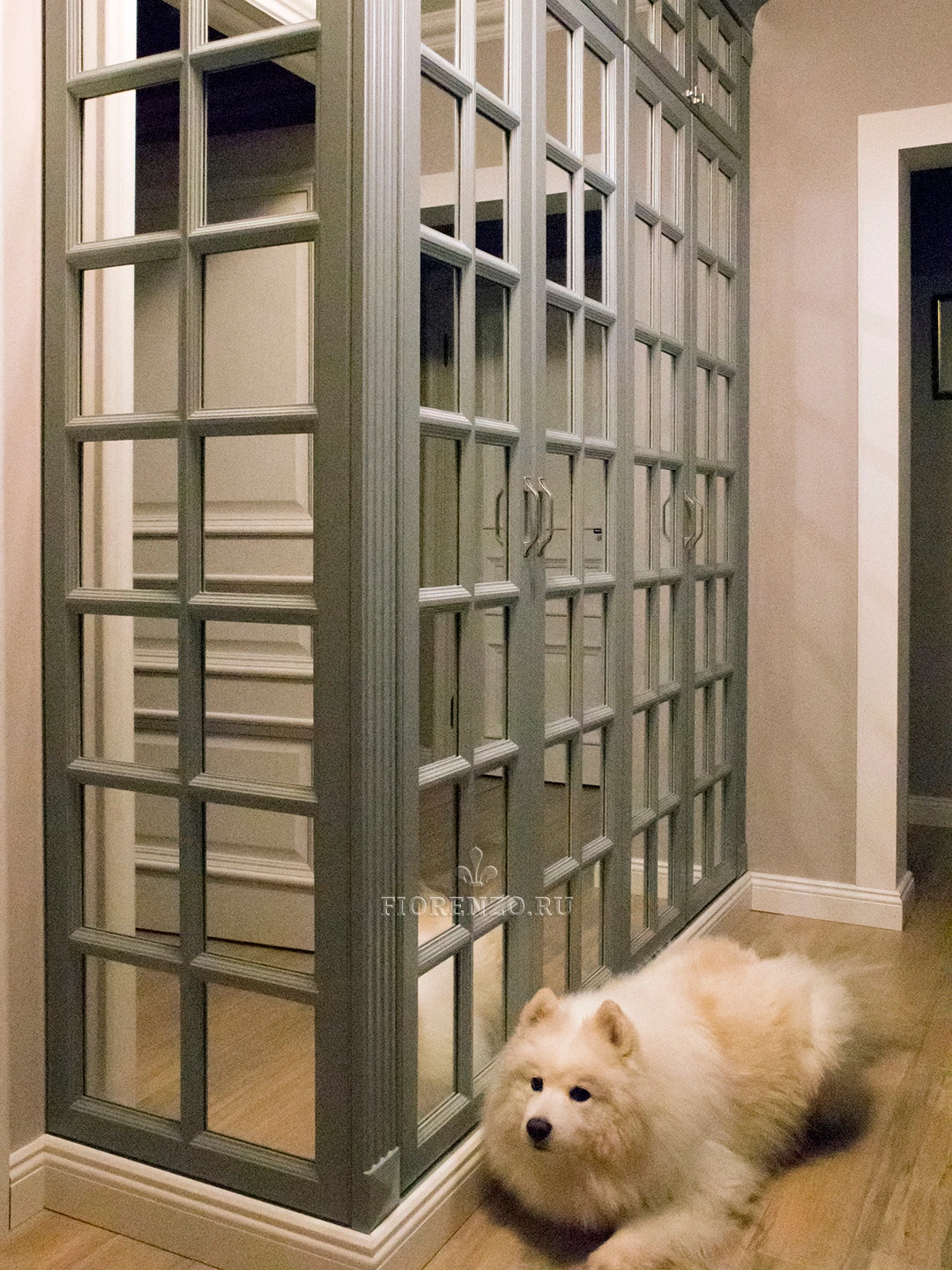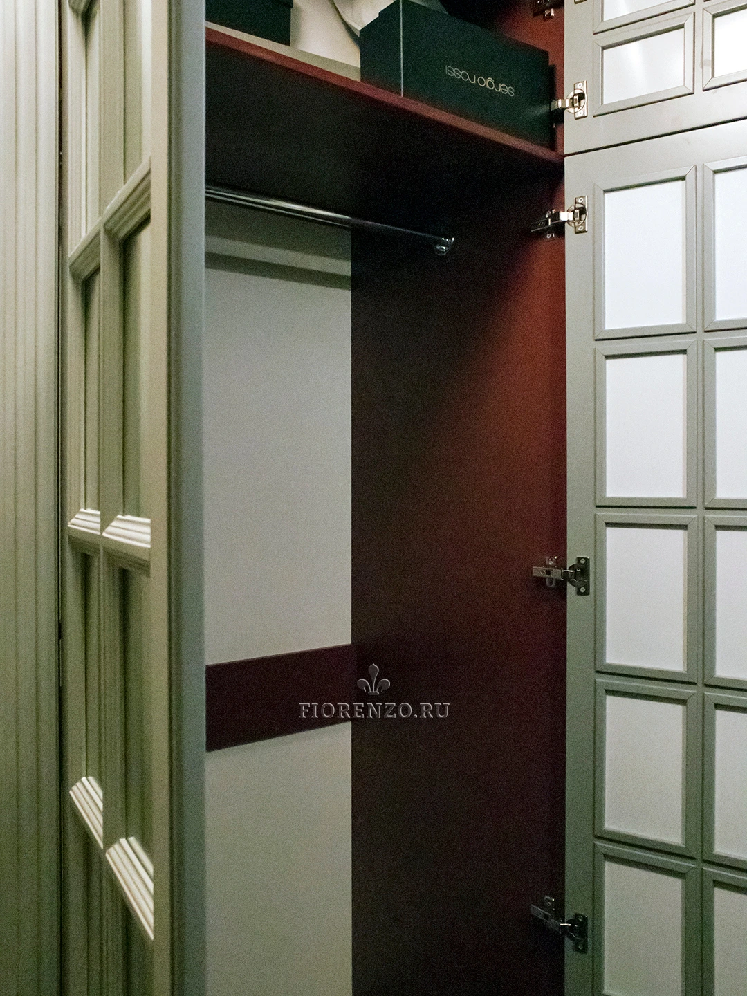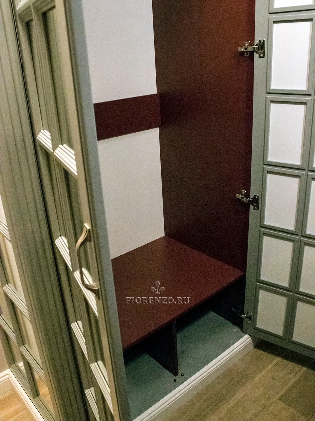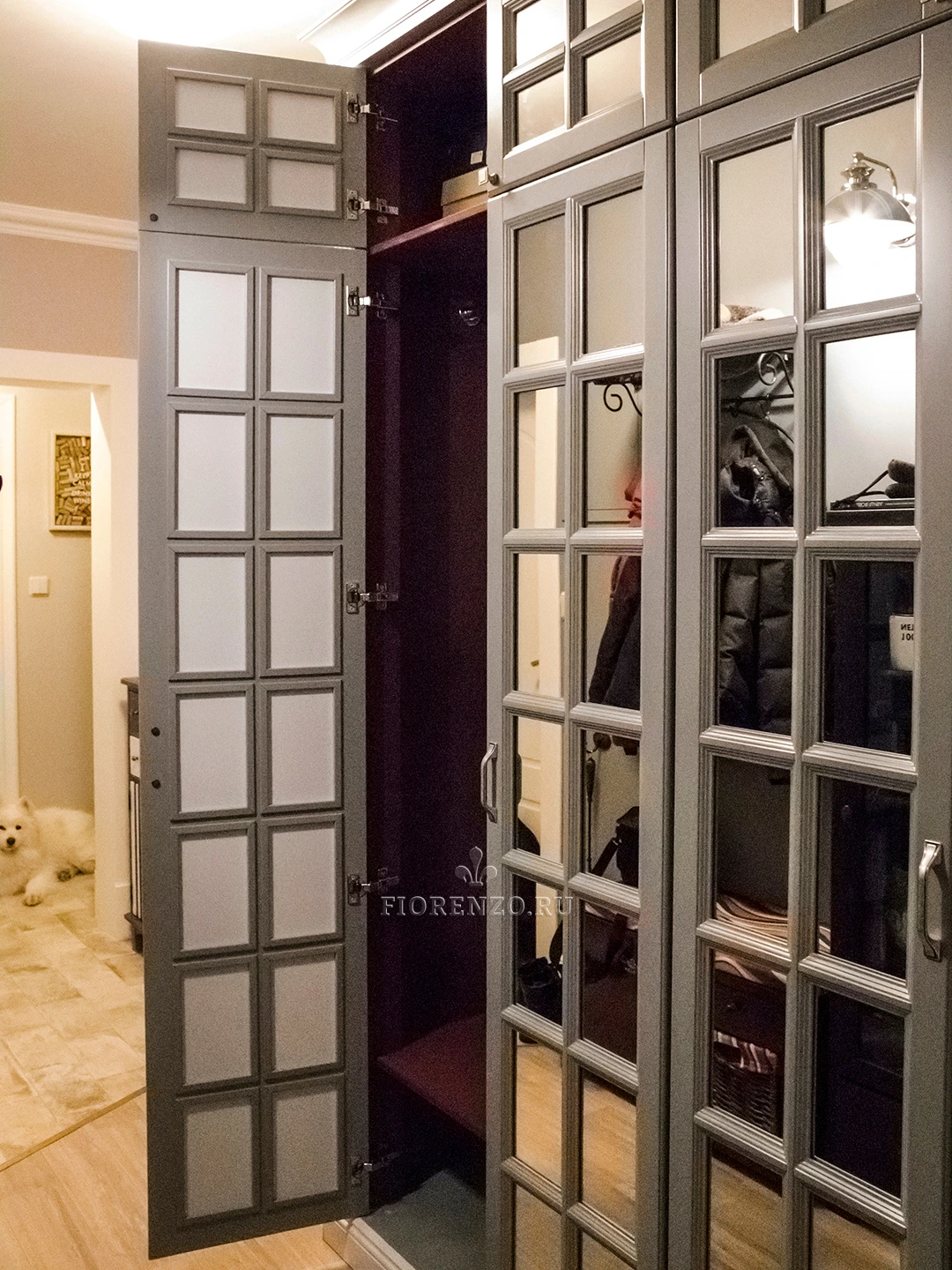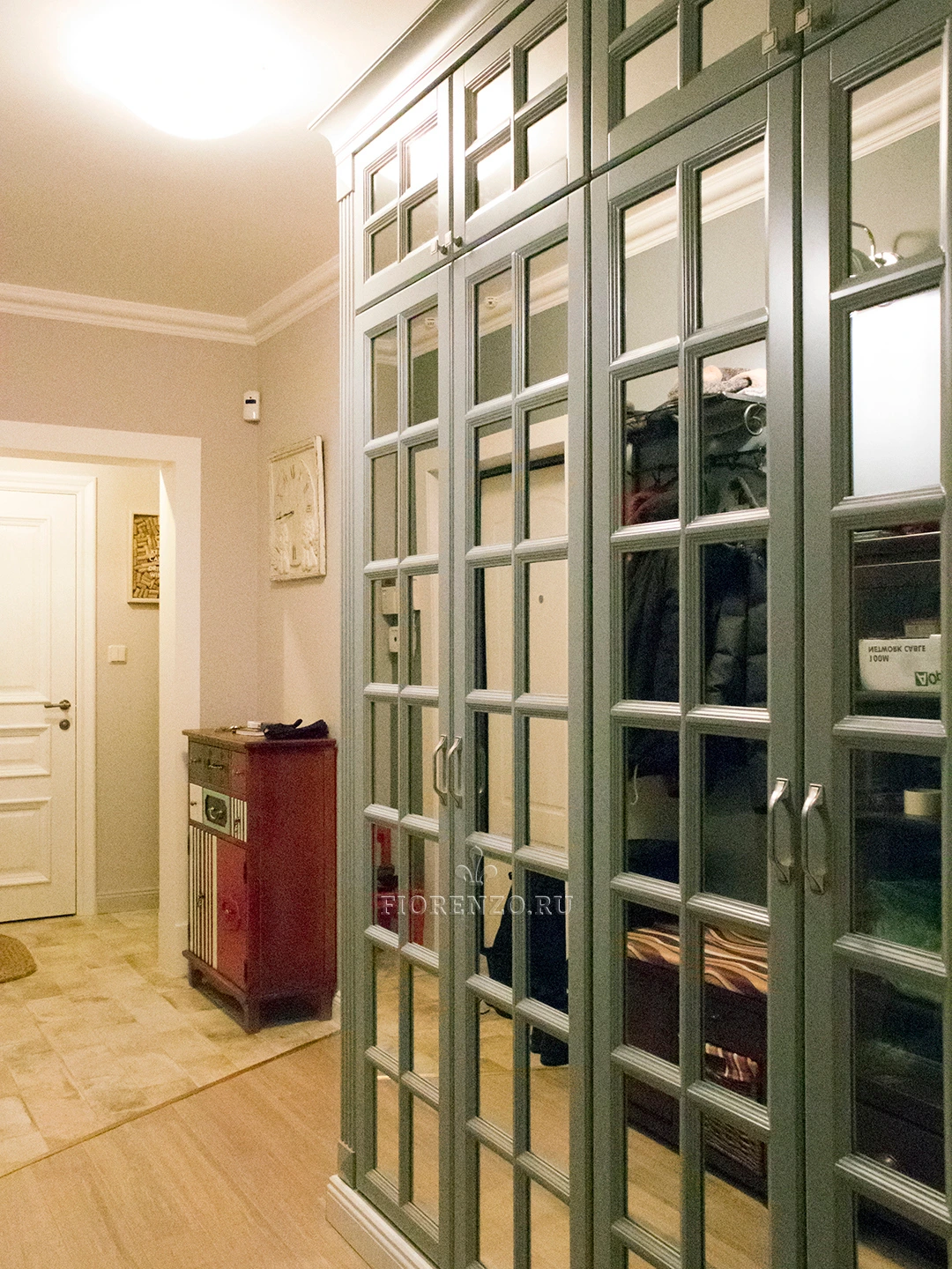 Дизайнеры «Фиорензо Мебель» при плотном сотрудничестве с заказчиками разработали проект зеркального шкафа «Регент» в коридор с декоративной раскладкой на фасадах. Оригинальный вид, высокая практичность и эргономичность, продуманный функционал – вот те параметры, которые уже успели оценить хозяева жилья. Мебель изготовлена в классическом стиле, основными отличиями которого являются филенчатые дверцы, наличие ручек «под старину», декоративные карниз и цоколь, пилястры на стойках. Можно изготовить похожий распашной зеркальный шкаф в прихожую по индивидуальным размерам, благодаря чему он максимально удовлетворит ваши требования, идеально впишется в любое помещение. Доступны варианты из ЛДСП Egger, МДФ, шпона и массива натурального дерева.