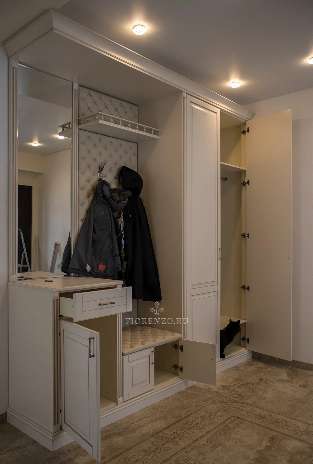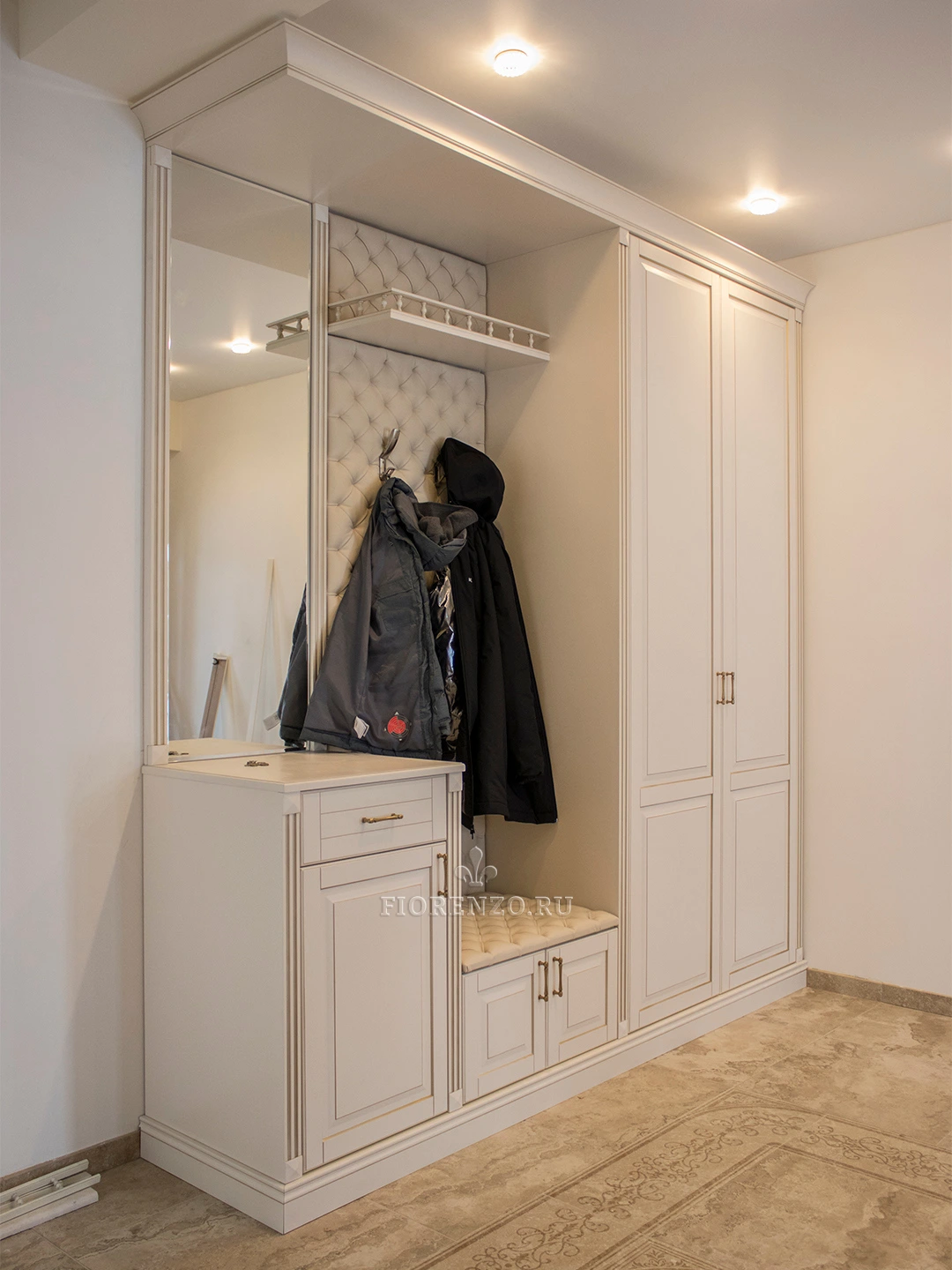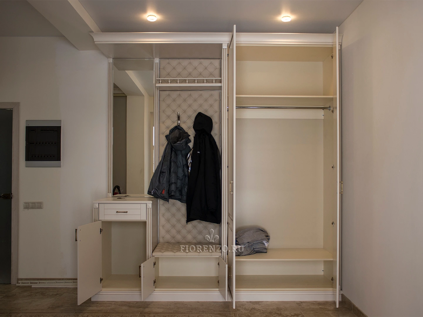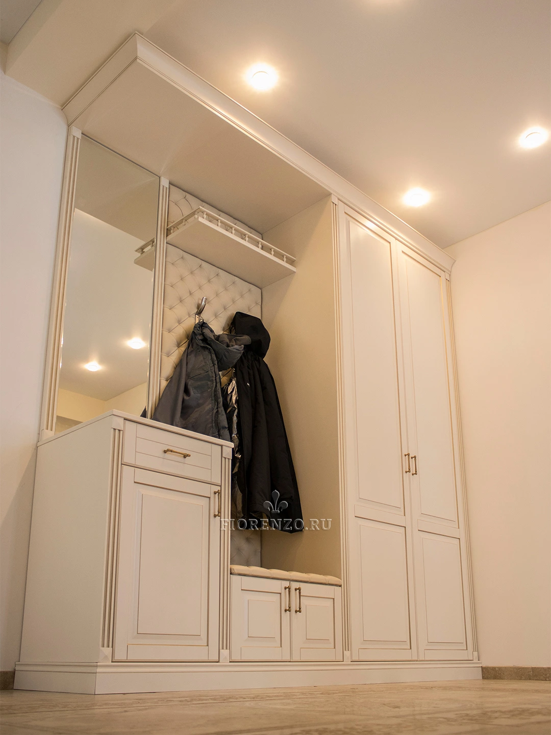 Стильный шкаф в прихожую «Локарно» с открытой вешалкой и зеркалом разработан дизайнерами «Фиорензо Мебель» при участии заказчика, что позволило воплотить в этом проекте все его требования и пожелания. Изделие состоит из различных модулей, каждый из которых выполняет определенные задачи. При этом они объединены общим декоративным карнизом и цоколем, делающим проект монолитным. Еще большей солидности мебели для прихожей под заказ придает эффект патирования и металлические ручки «под бронзу». Специалисты «Фиорензо Мебель» готовы создать подобный проект для вашего жилья, независимо от его типа и площади. Вы сами выберете для себя комплектацию изделия, его цвет и стиль. Можно заказать варианты из ЛДСП Egger, крашеного МДФ, массива, натурального шпона или их сочетания.