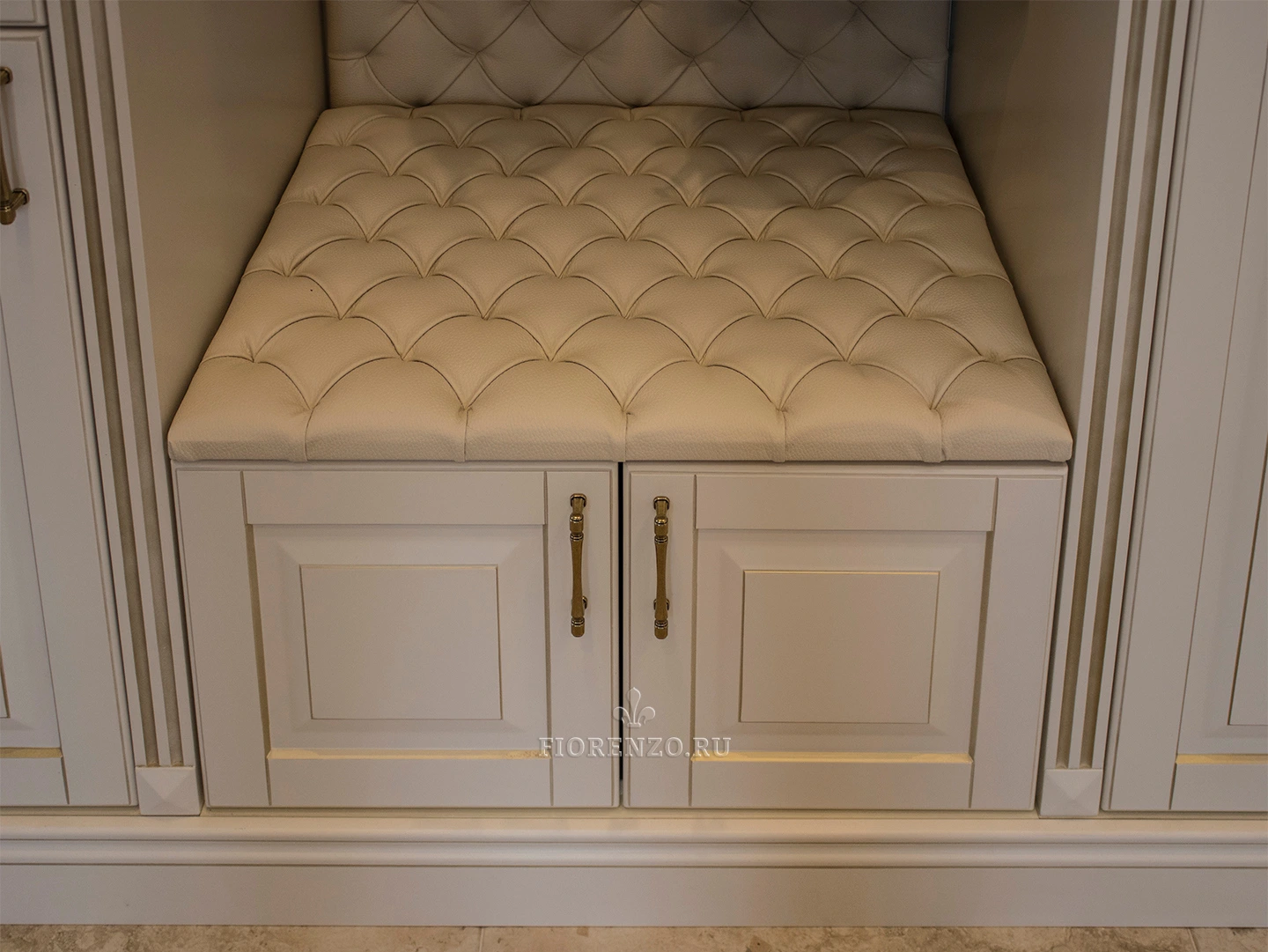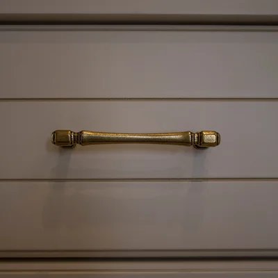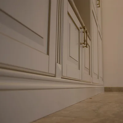 Для изготовления фасадов использовали МДФ, которое покрыто эмалью Sayerlack с патированием. Внутренности проекта – из ЛДСП фирмы Egger. Фурнитура – от производителя BLUM.