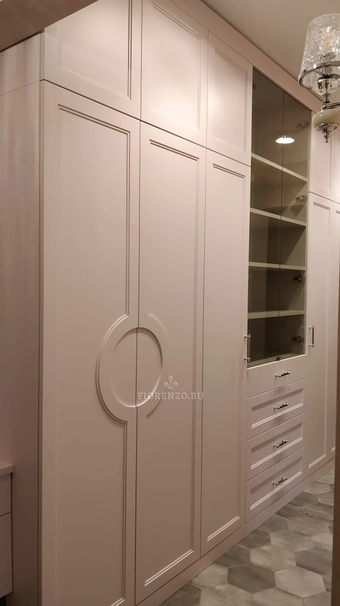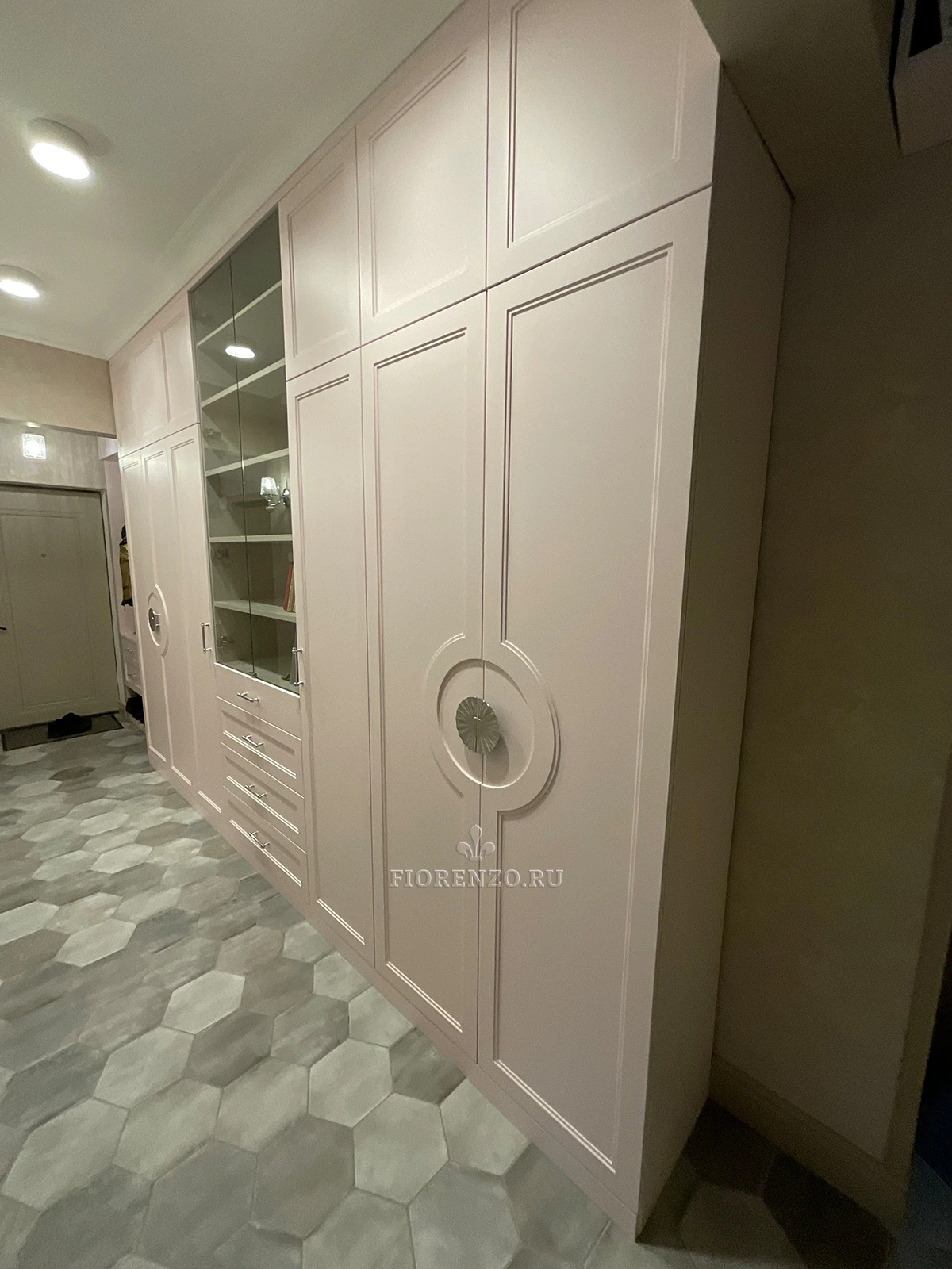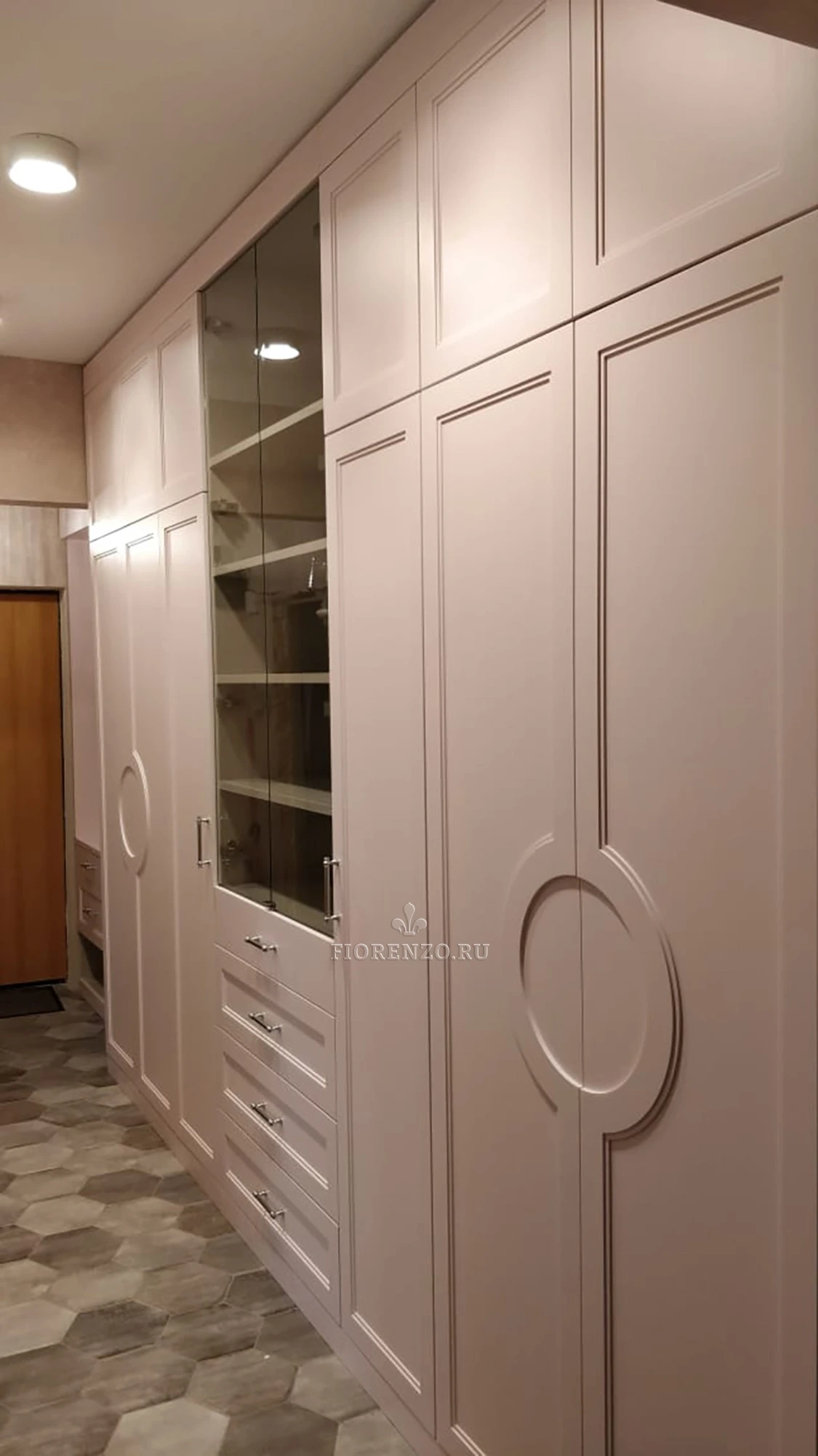 Шкаф в прихожую Osteria неоклассика – хороший выбор для просторных квартир. Проект достаточно габаритный, шкафы продуманные, эргономичные, вместительные. Наполнение корректирует покупатель – это могут быть полки, ящики, штанги, пр. Фасады комбинированные – это классические распашные шкафы, отсек с остекленной витриной наверху и выдвижными ящиками в нижней части.