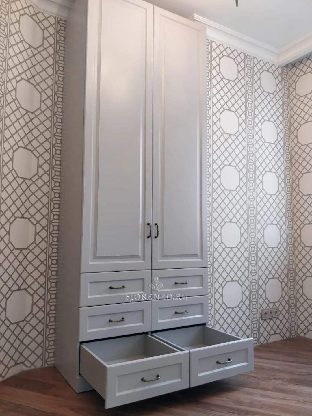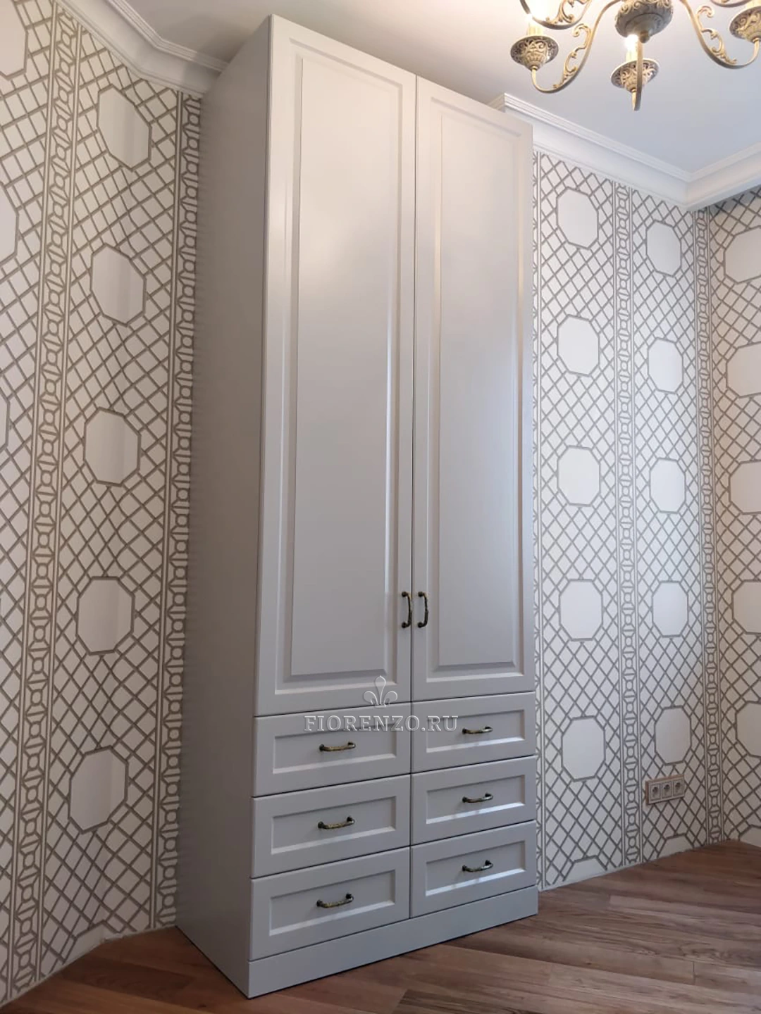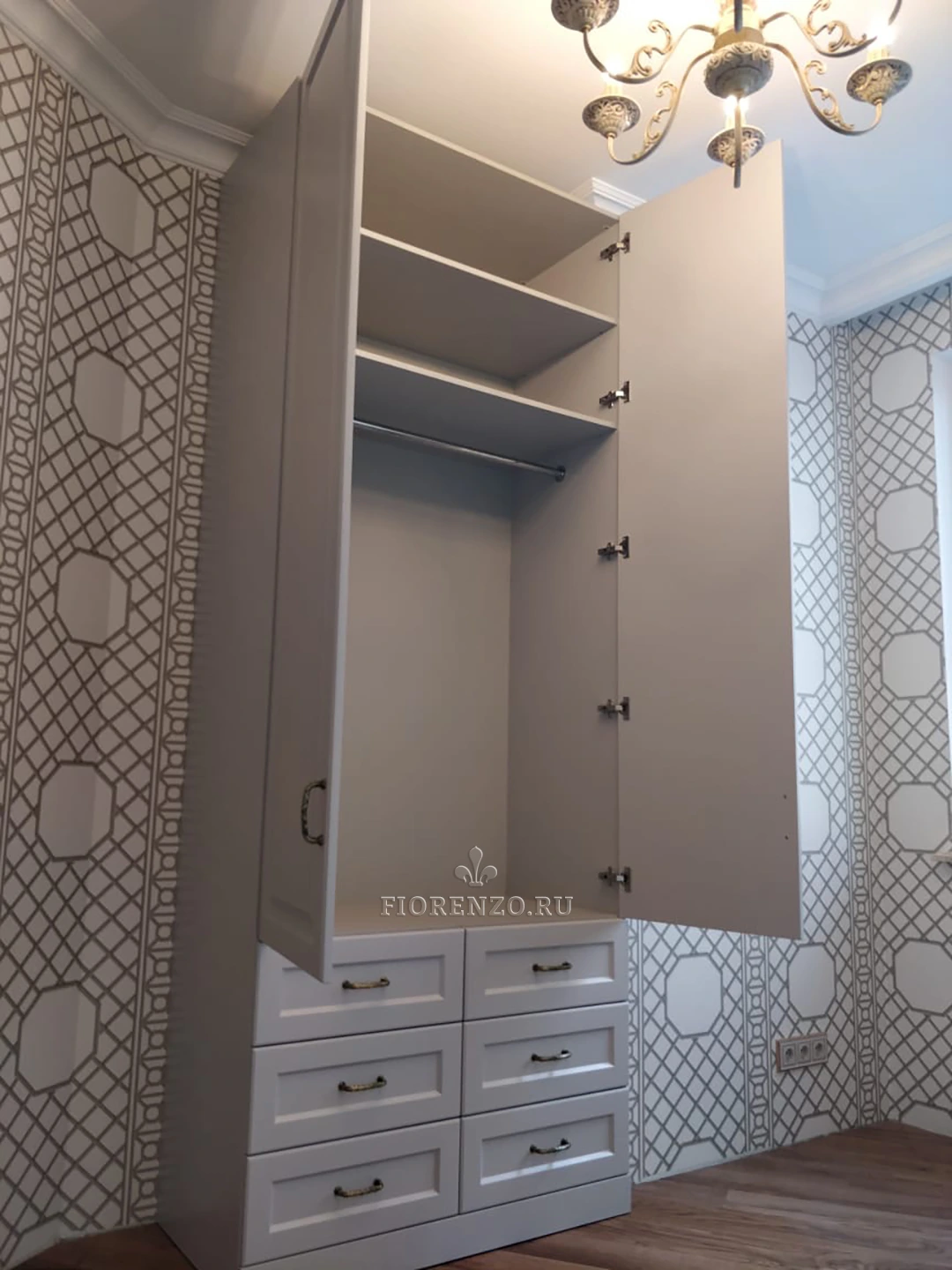 Мебельная мастерская FIORENZO изготавливает качественную, красивую, современную мебель. Шкаф «Эллон» в стиле неоклассик в спальню подойдет для хранения домашнего текстиля, одежды, он идет с полками, штангой для вещей, набором выдвижных ящиков. Универсальная стилистика исполнения делает модель уместной в любых помещениях. Размеры компактные, вместительность достигается за счет высоты – модель идет в потолок. На верхних полках удобно хранить вещи, которыми вы пользуетесь редко.