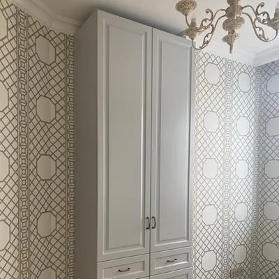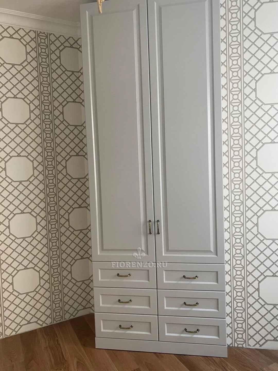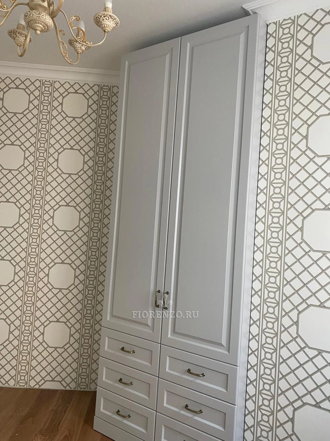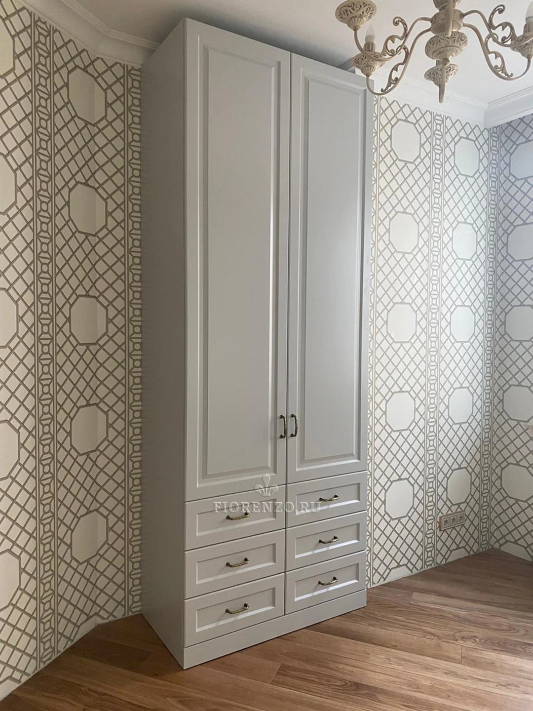 Мебельная мастерская FIORENZO изготавливает качественную, красивую, современную мебель. Шкаф «Эллон» в стиле неоклассик в спальню подойдет для хранения домашнего текстиля, одежды, он идет с полками, штангой для вещей, набором выдвижных ящиков. Универсальная стилистика исполнения делает модель уместной в любых помещениях. Размеры компактные, вместительность достигается за счет высоты – модель идет в потолок. На верхних полках удобно хранить вещи, которыми вы пользуетесь редко.
