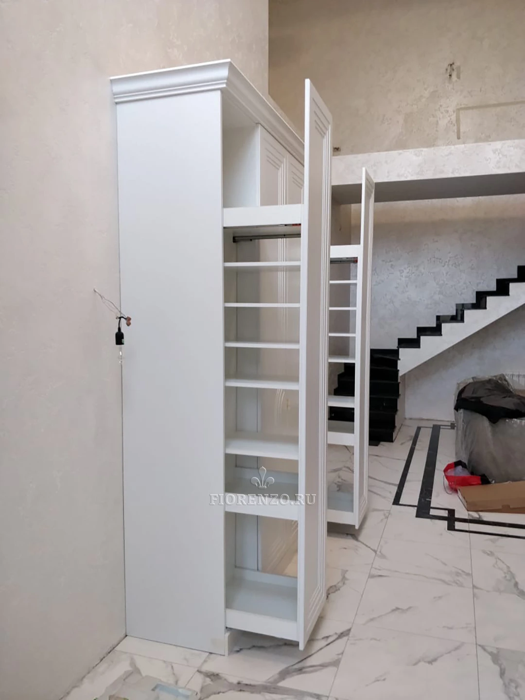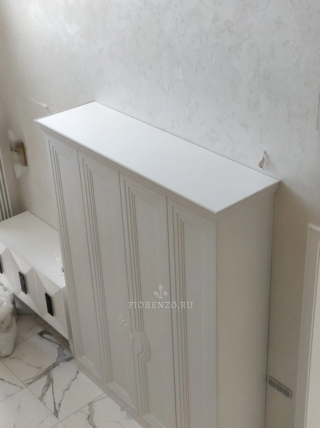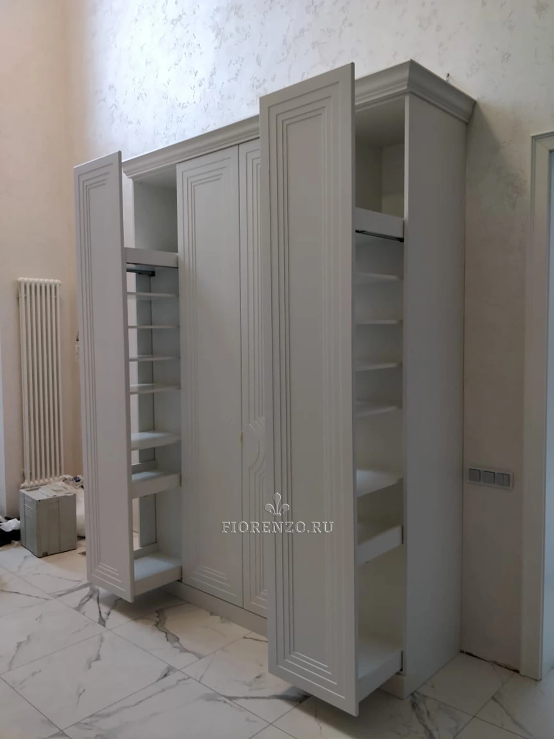 Компания «Фиорензо» реализует оригинальные решения для уютных интерьеров. Такой шкаф для прихожей будет универсальным выбором для помещений разных стилей. Он имеет несколько секций и максимальную высоту. Боковые секции сделаны выдвигающимися, идут с внутренними полками для обуви.
