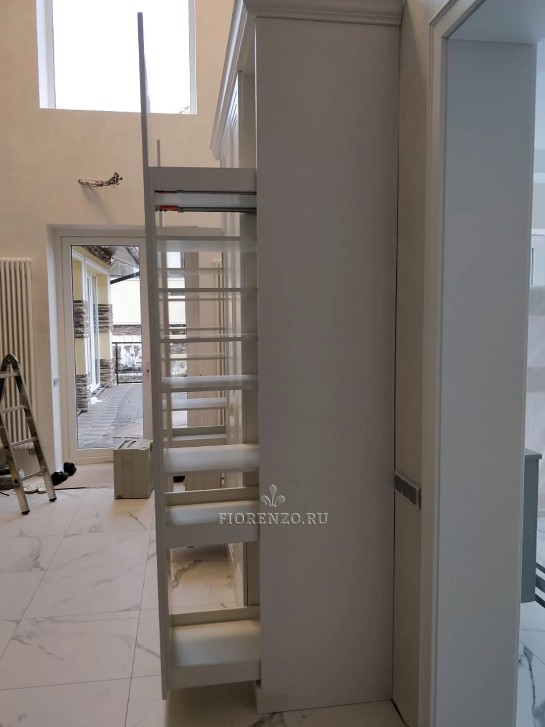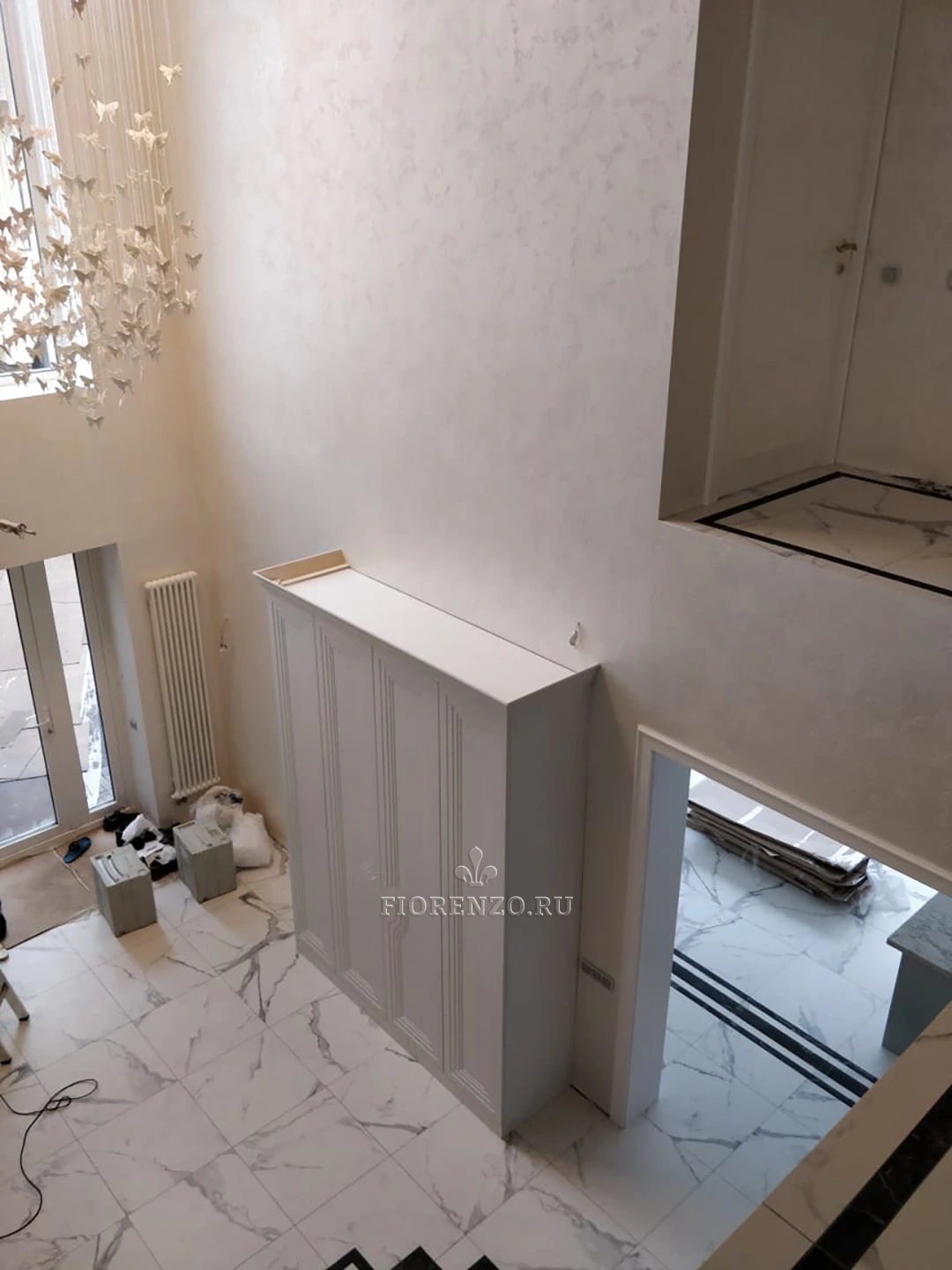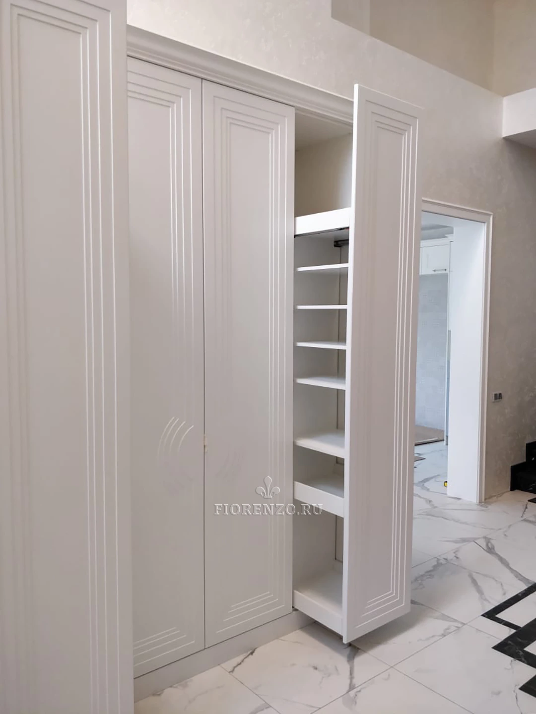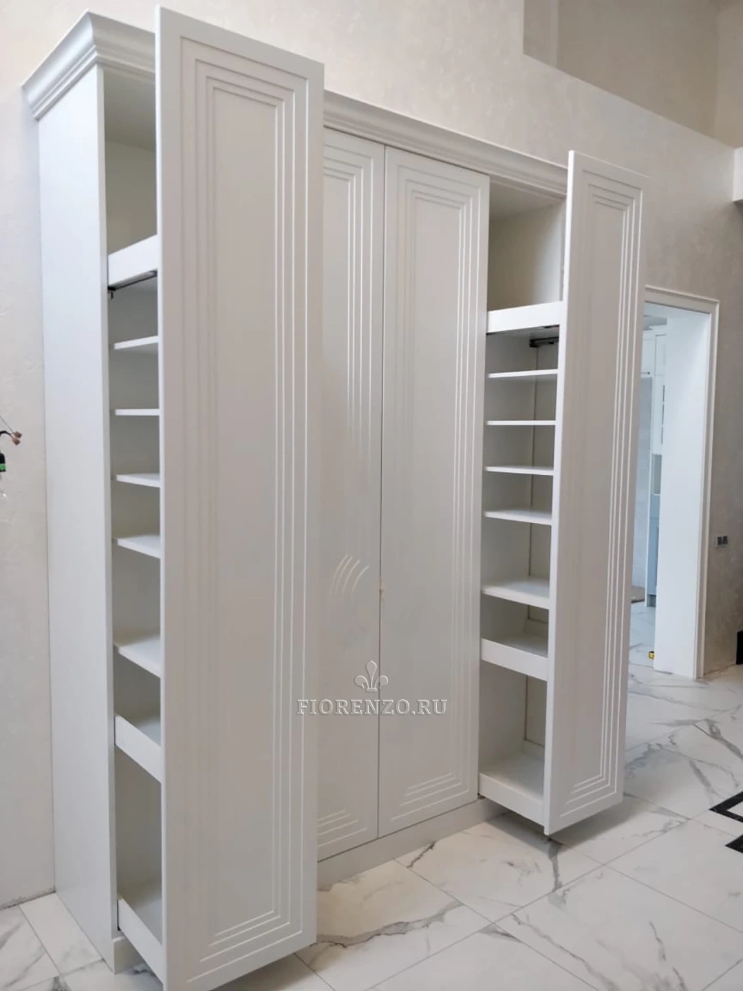 Компания «Фиорензо» реализует оригинальные решения для уютных интерьеров. Такой шкаф для прихожей будет универсальным выбором для помещений разных стилей. Он имеет несколько секций и максимальную высоту. Боковые секции сделаны выдвигающимися, идут с внутренними полками для обуви.