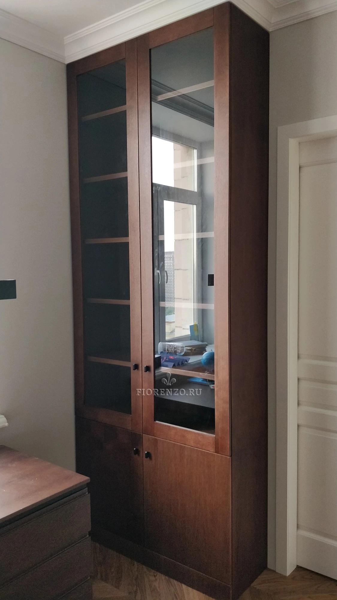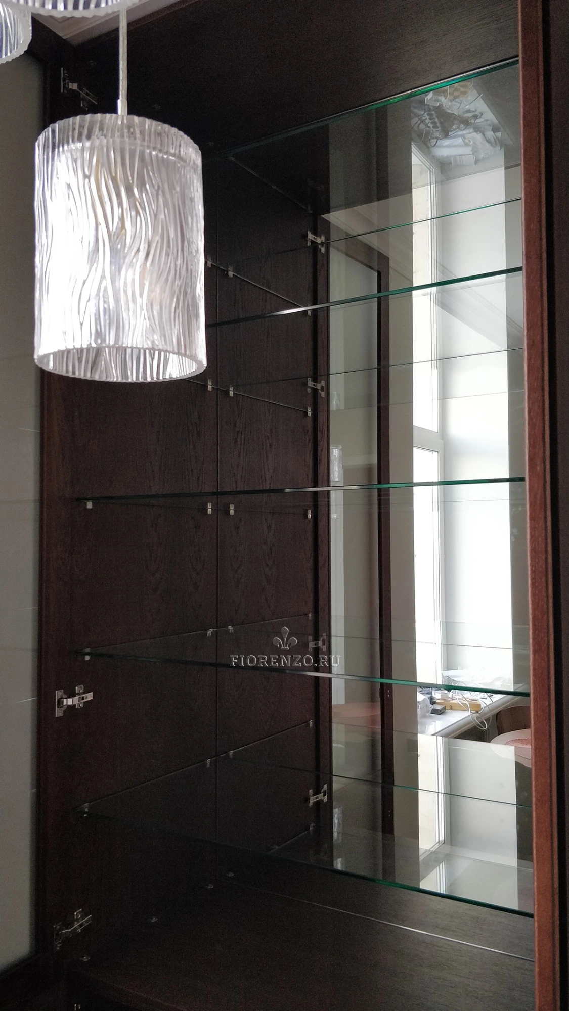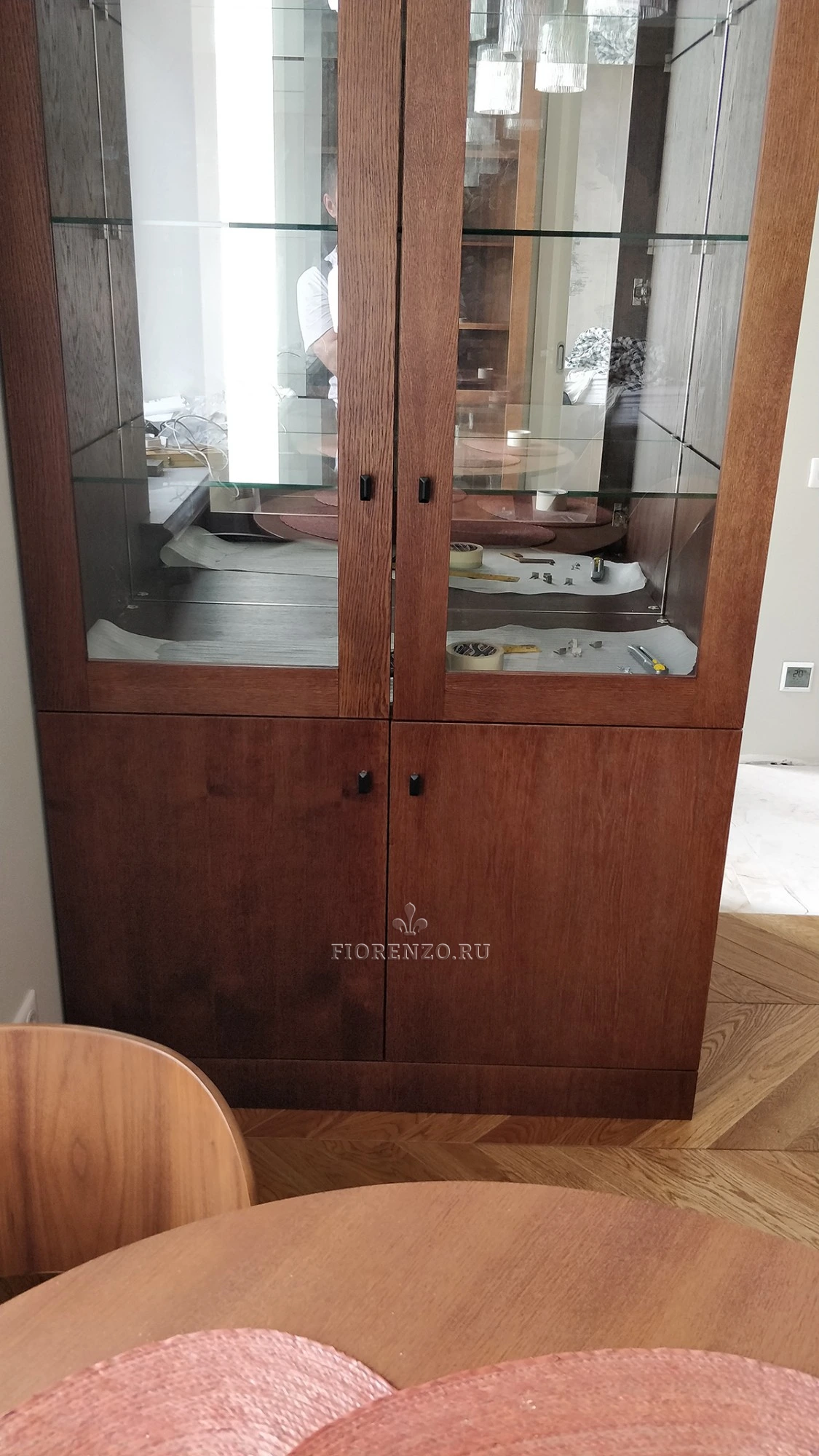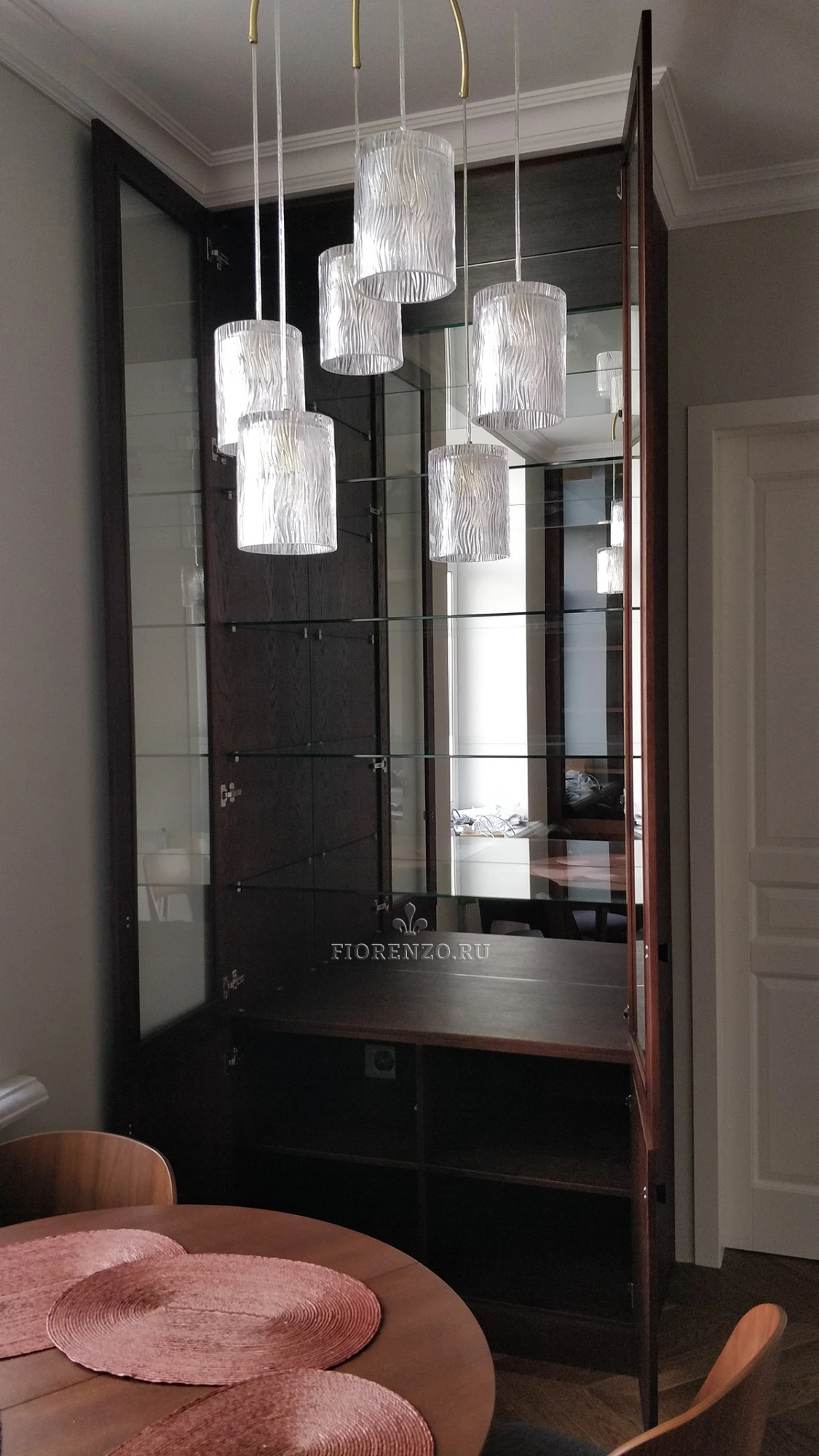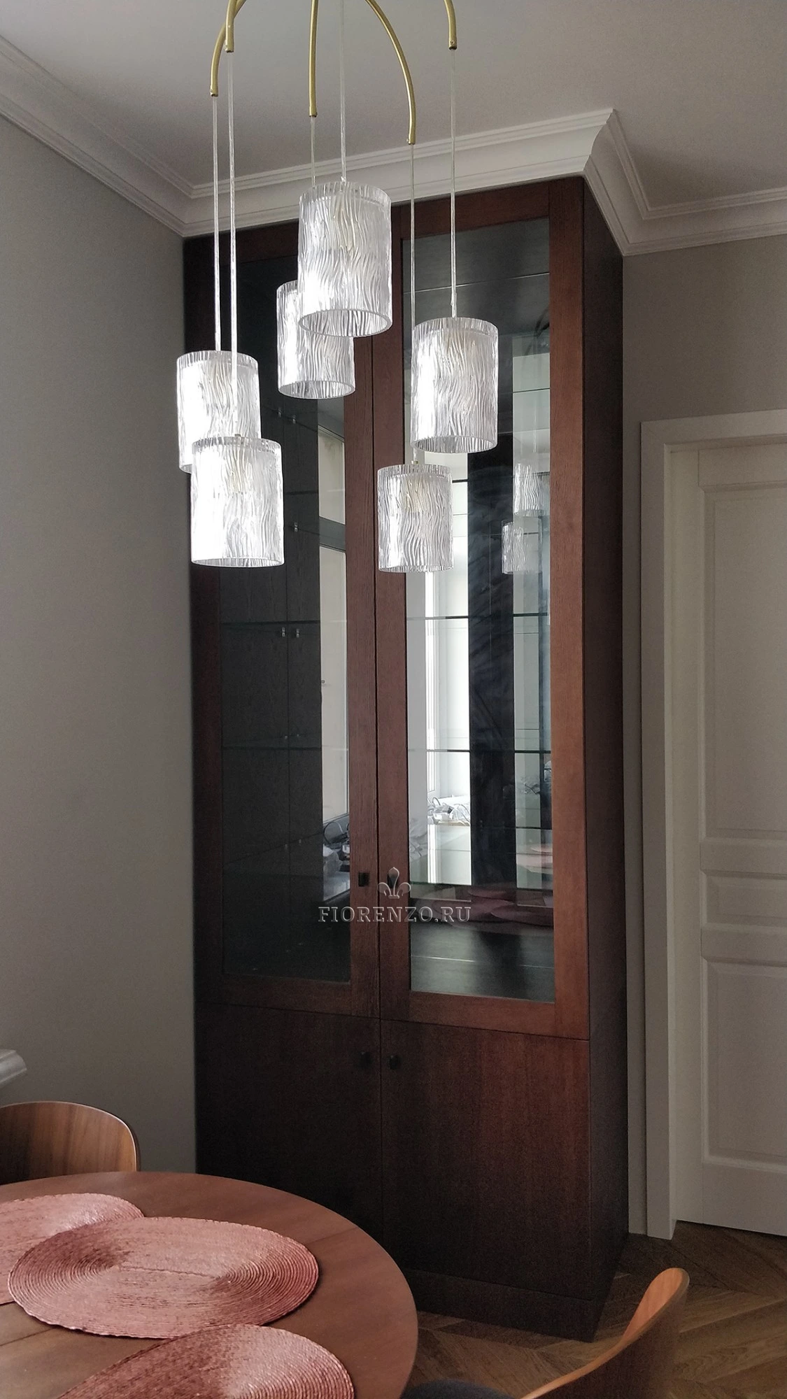 Мастерская «Фиорензо» реализует классические и современные мебельные проекты. Небольшой сервант-витрина дополнит интерьер столовой или гостиной, идеален для размещения, хранения посуды. Материал – натуральный шпон, вставки сделаны из стекла.