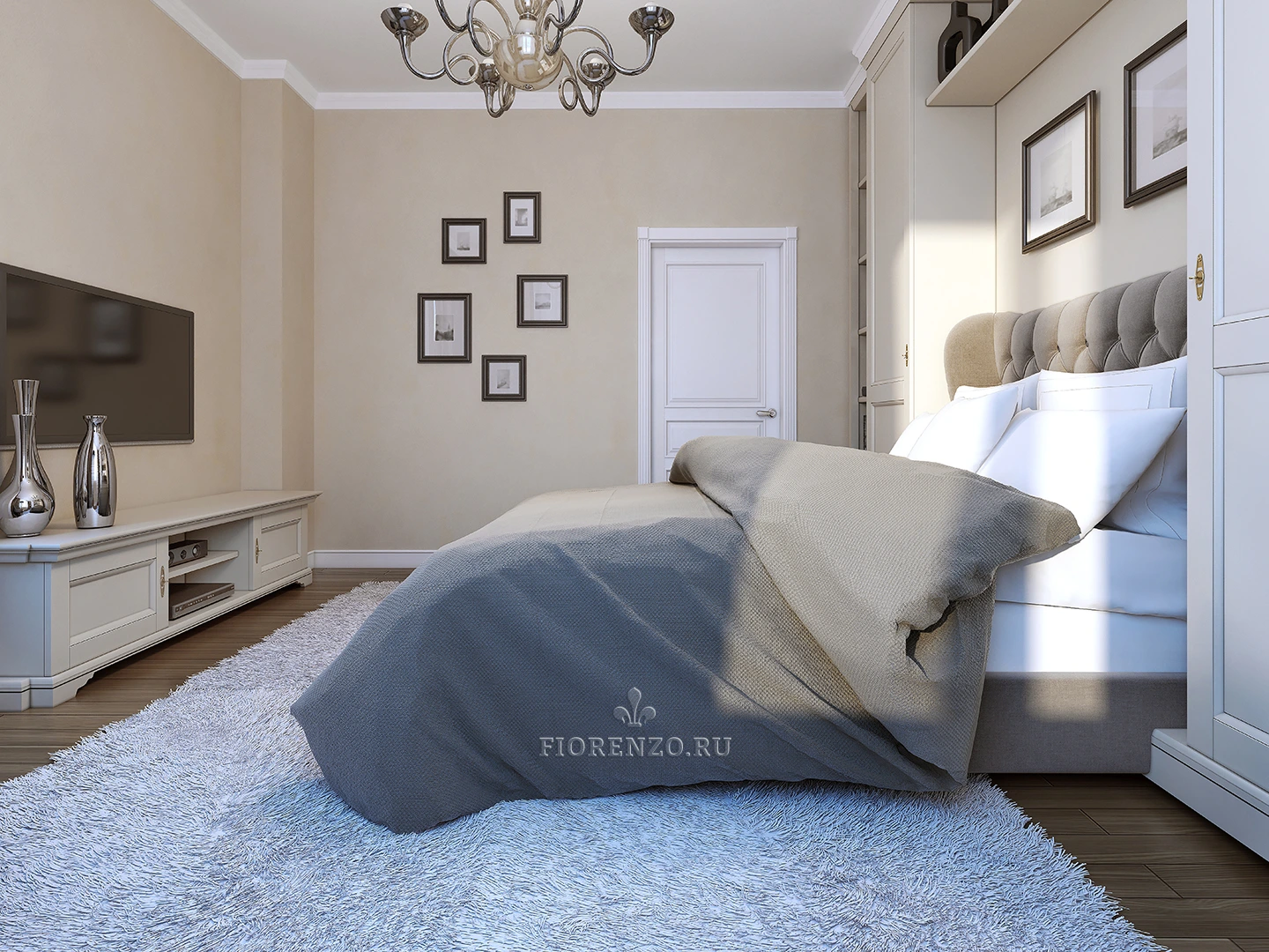 В качестве материала для изготовления классической спальни под заказ использован МДФ, окрашенный эмалью Sayerlack по палитре RAL. Для фасадов использовались петли с доводчиками от австрийской компании Blum.
