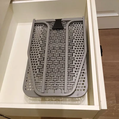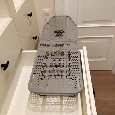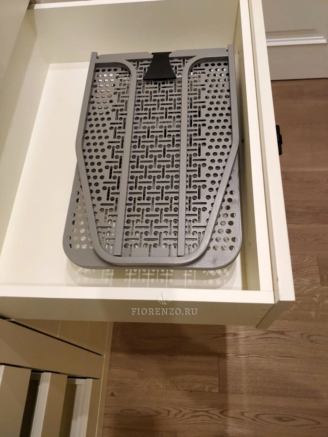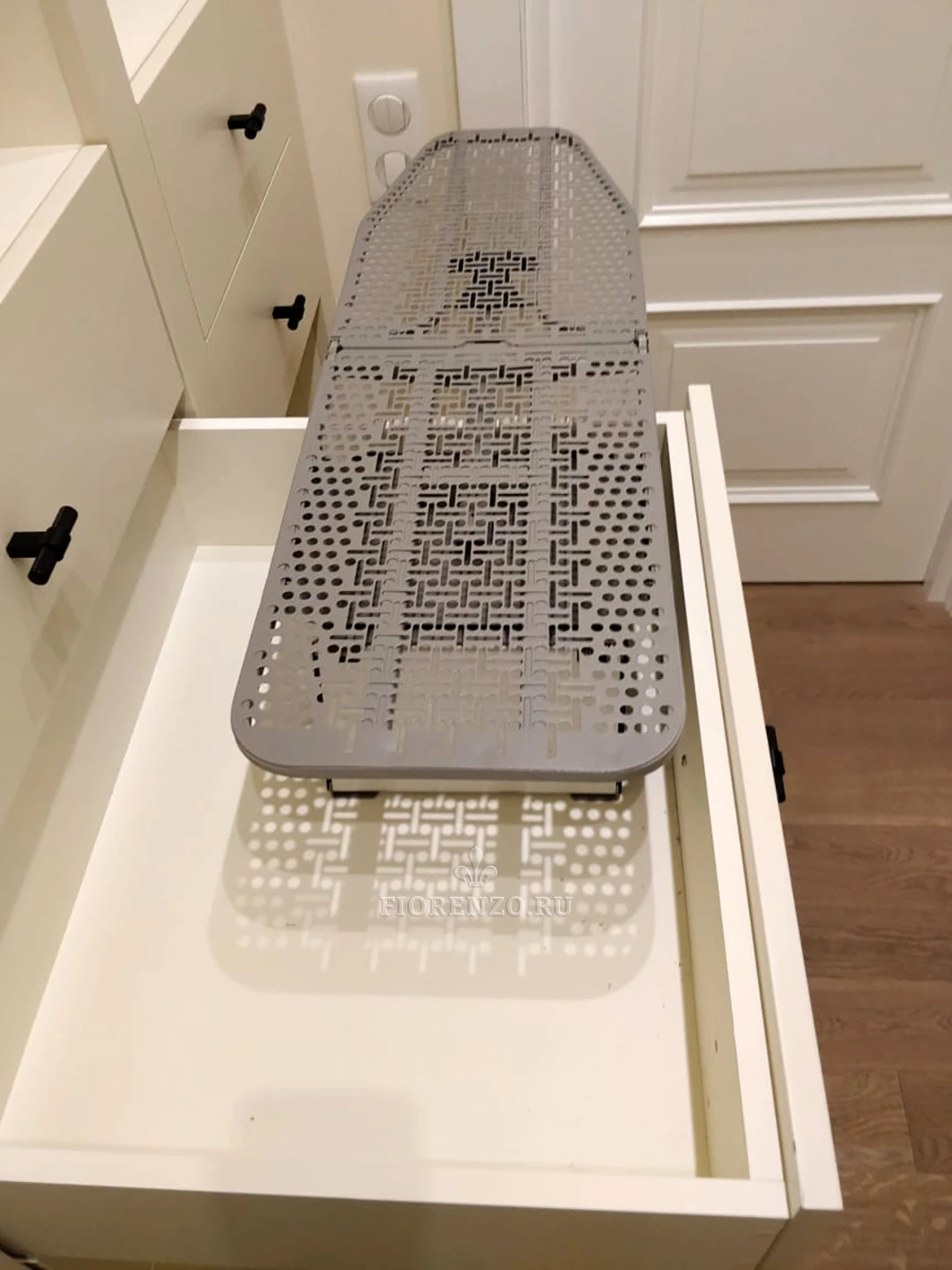 Материалы изготовления фасадов – МДФ и ЛДСП. Фурнитура импортная, надежная, в этом гардеробе она подобрана на контрастах и стильно, необычно выделяется на фоне ящиков. Цвет можете выбрать другой. В данной гардеробной также есть еще один не маловажный элемент – складная гладильная доска спрятанная в ящик!