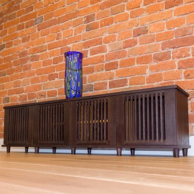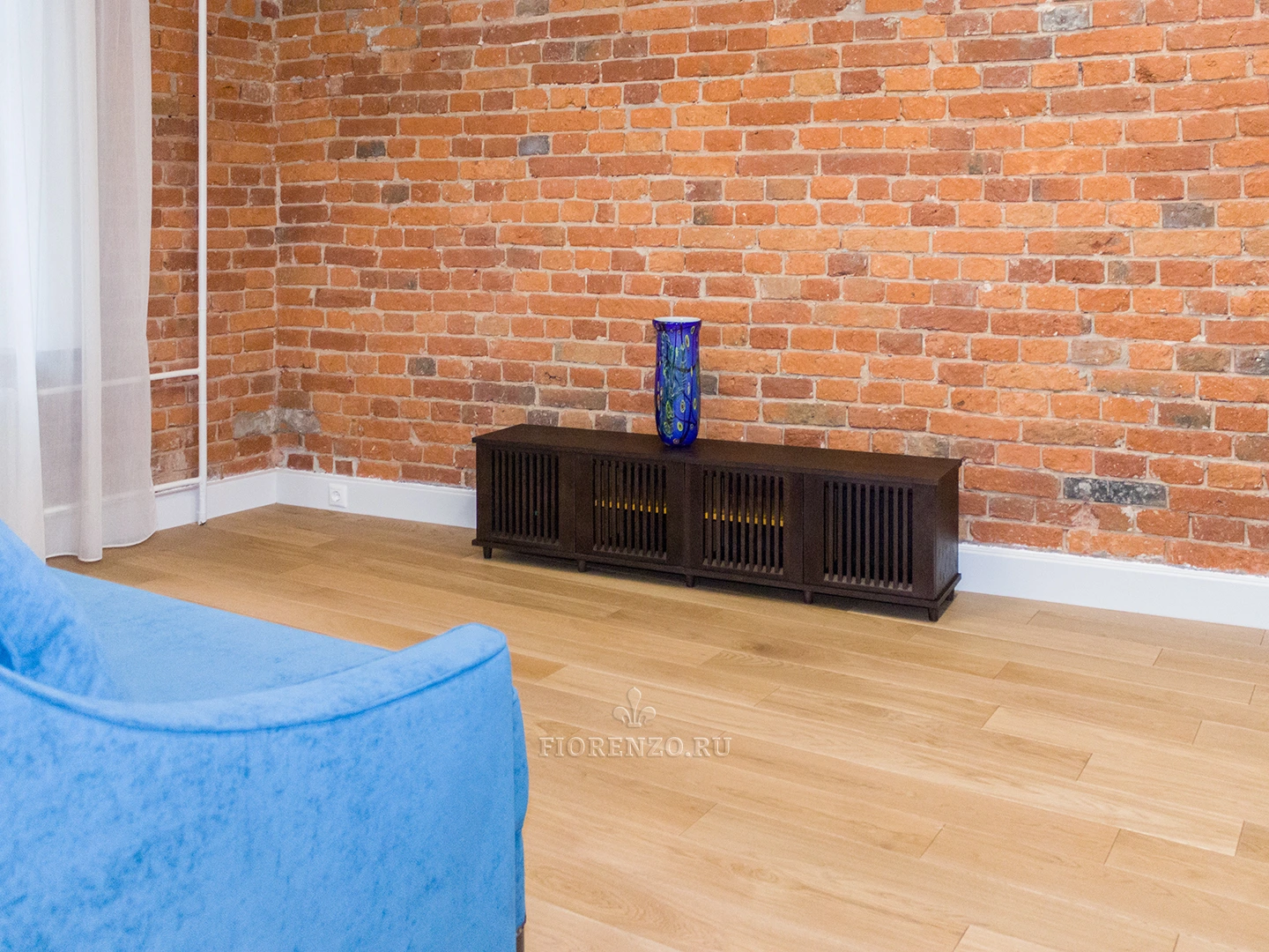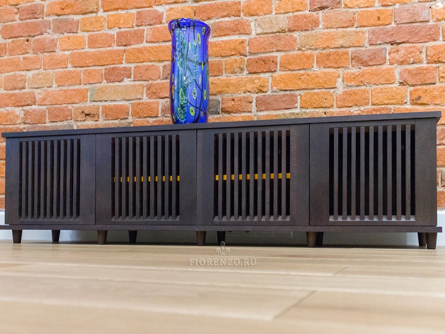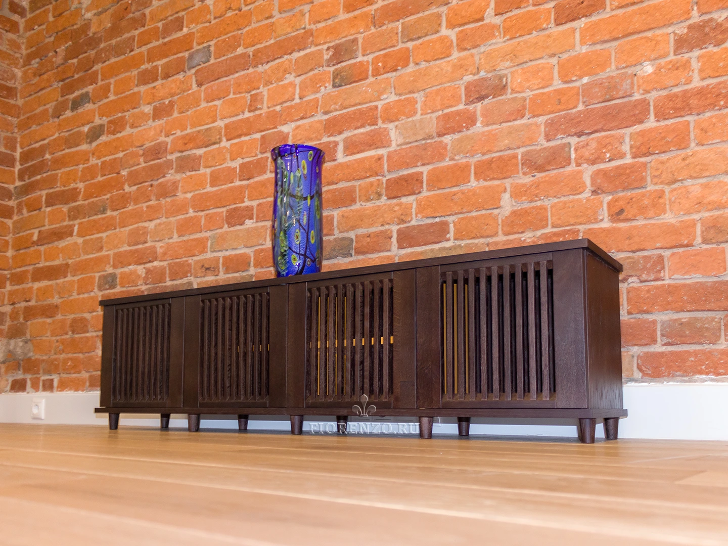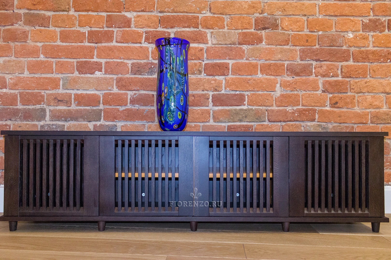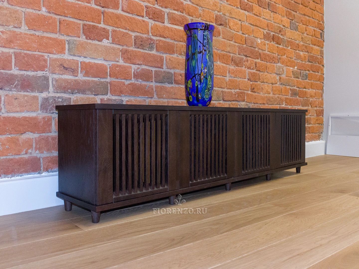 Интересный вариант тумбы для телевизора в гостиную из шпона дуба. Изготовлено изделие на заказ под стилистику комнаты – сочетание кирпичной кладки и древесной фактуры очень популярное решение у дизайнеров и архитекторов.