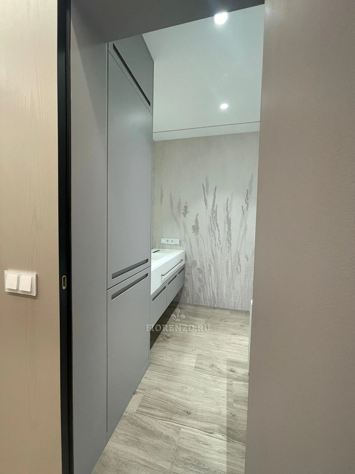 Комплект для ванной: подвесная тумба с тремя выдвижными ящиками и высокий пенал до потолка. Лаконичный современный фасад в матовом сером цвете с интегрированными ручками обеспечивает аккуратный внешний вид и удобство.