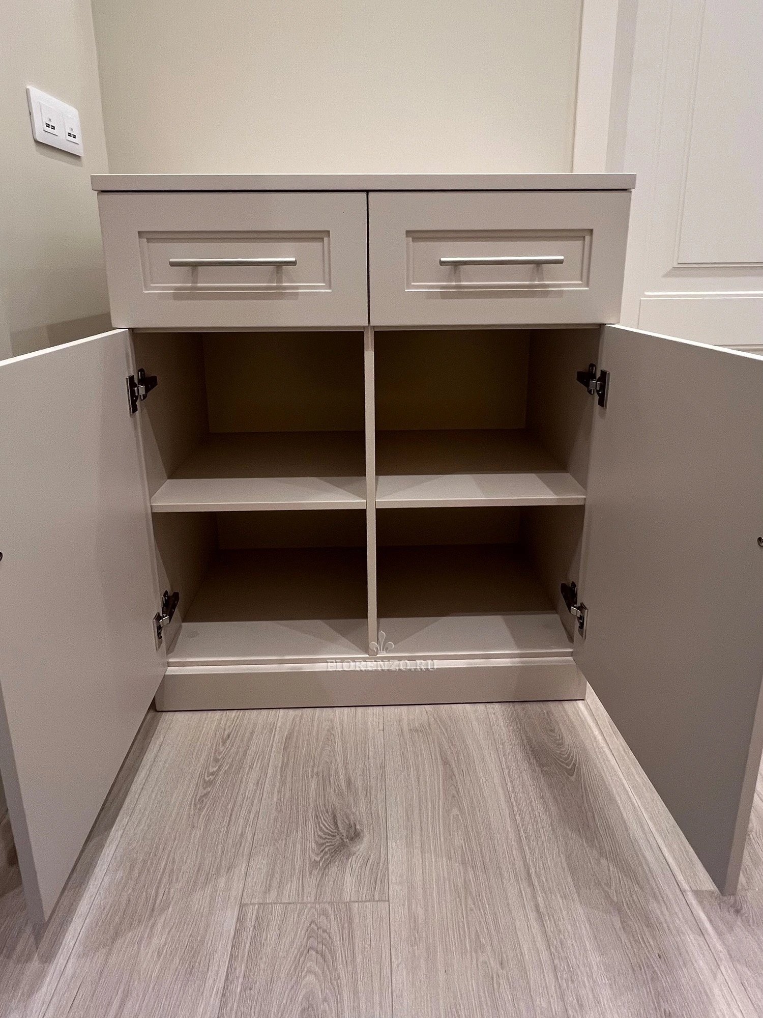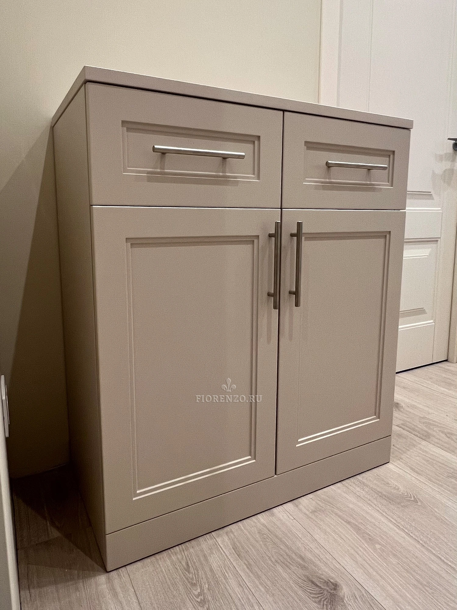 Универсальная тумба премиум-класса, изготовленная под индивидуальный размер. Корпус и фасады — МДФ с эмалевым матовым покрытием, классический фрезерованный фасад с аккуратными ручками из нержавеющей стали.