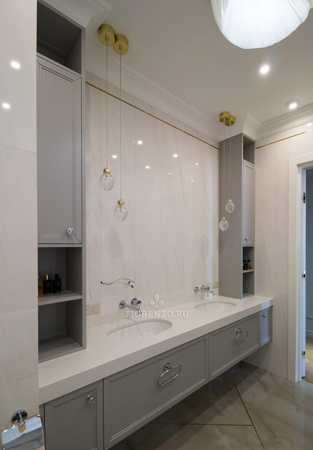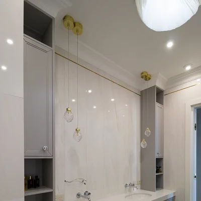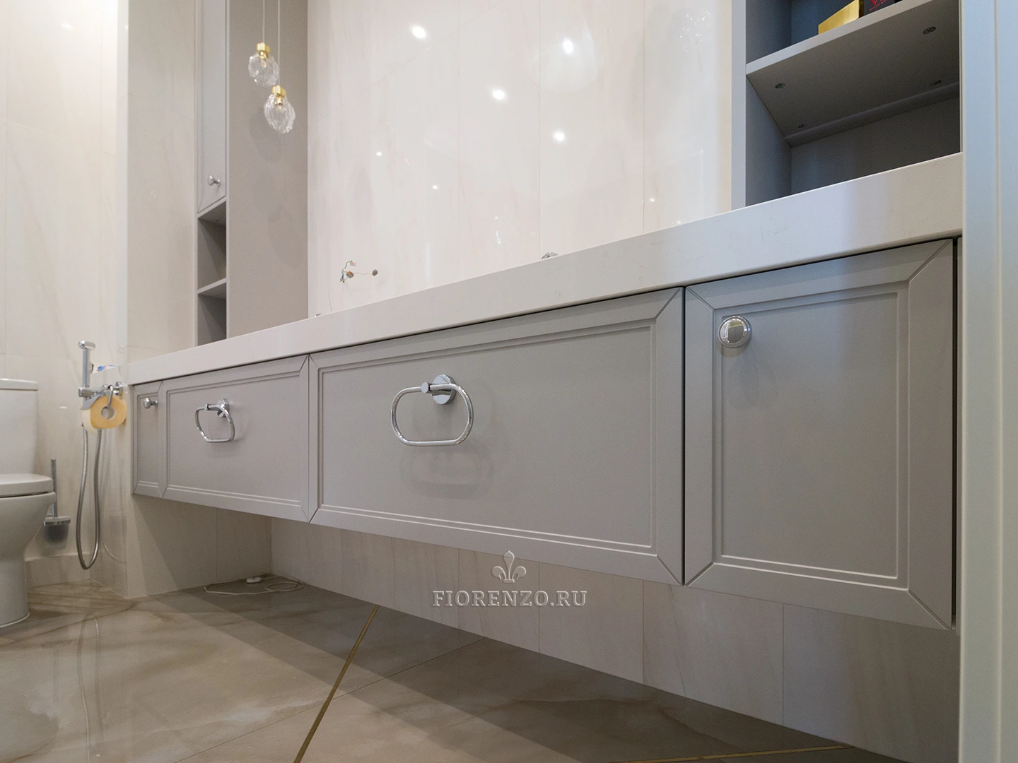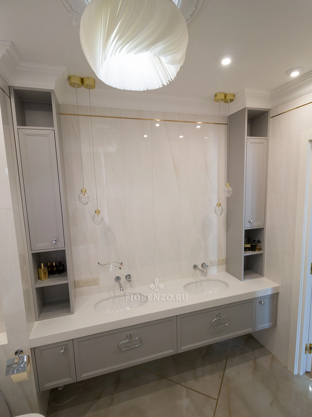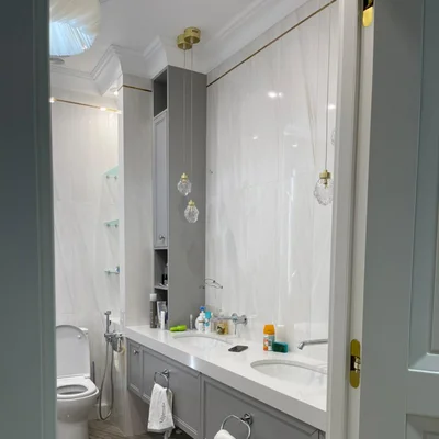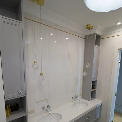 Тумба под раковину в ванной комнате, изготовлена на заказ по индивидуальным размерам. Стиль неоклассика с индивидуальной фрезеровкой из крашеного МДФ. Над столешницей установлены два шкафа пенала. Удобно и не занимают много места. Основная сложность с установкой такой тумбы возникли из-за её габаритов и отсутствия ножек. Чтобы изготовить такую массивную конструкция в подвесном варианте.