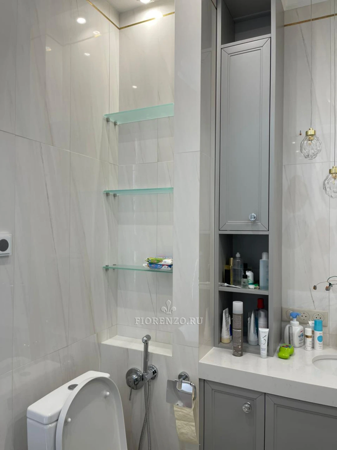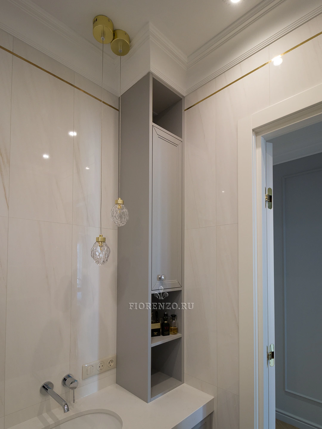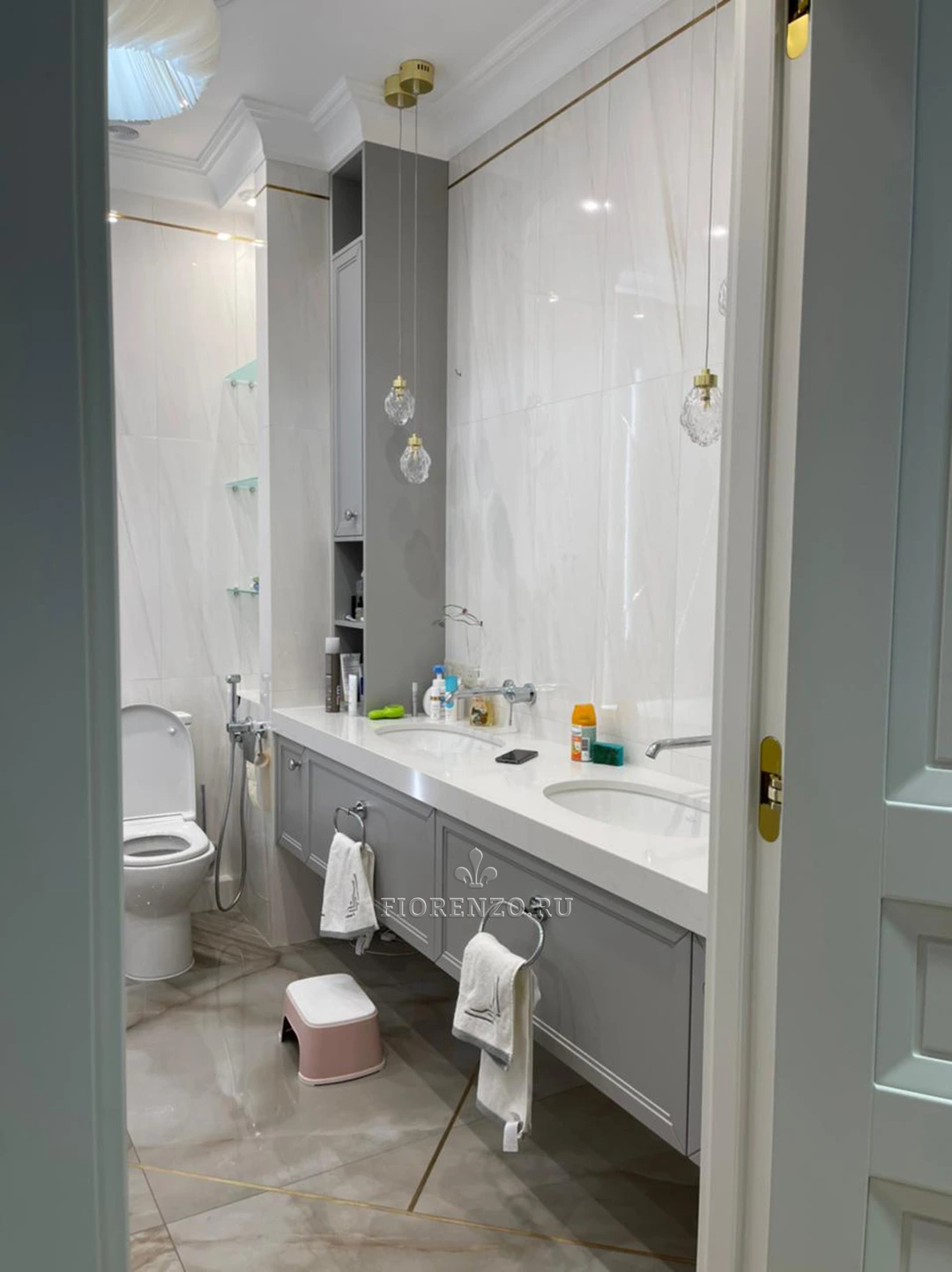 Тумба под раковину в ванной комнате, изготовлена на заказ по индивидуальным размерам. Стиль неоклассика с индивидуальной фрезеровкой из крашеного МДФ. Над столешницей установлены два шкафа пенала. Удобно и не занимают много места. Основная сложность с установкой такой тумбы возникли из-за её габаритов и отсутствия ножек. Чтобы изготовить такую массивную конструкция в подвесном варианте.