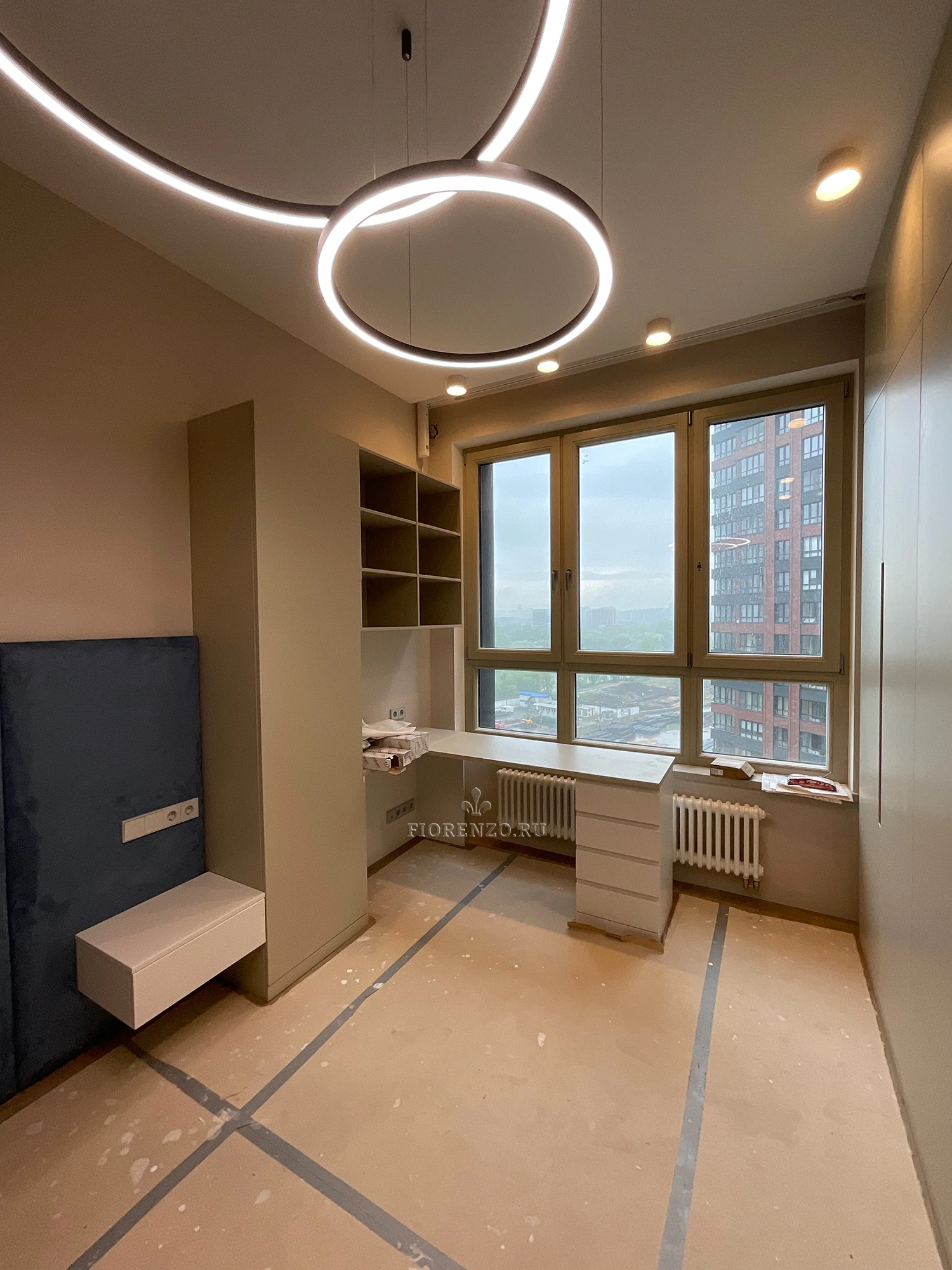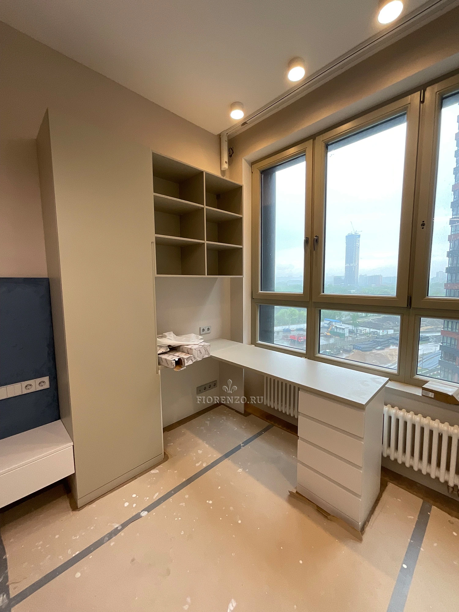 Индивидуальная встроенная мебель премиум-класса для спальни. Комплекс включает высокий встроенный шкаф до потолка, рабочую зону под окном и навесные тумбы. Выполнено в матовой фактуре с интегрированными ручками, аккуратными линиями и продуманной внутренней организацией.