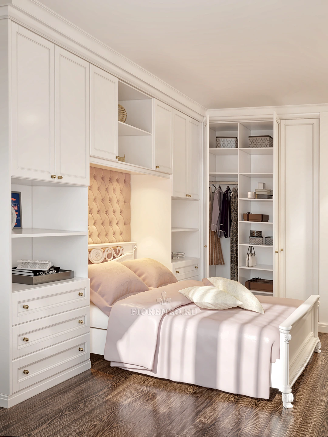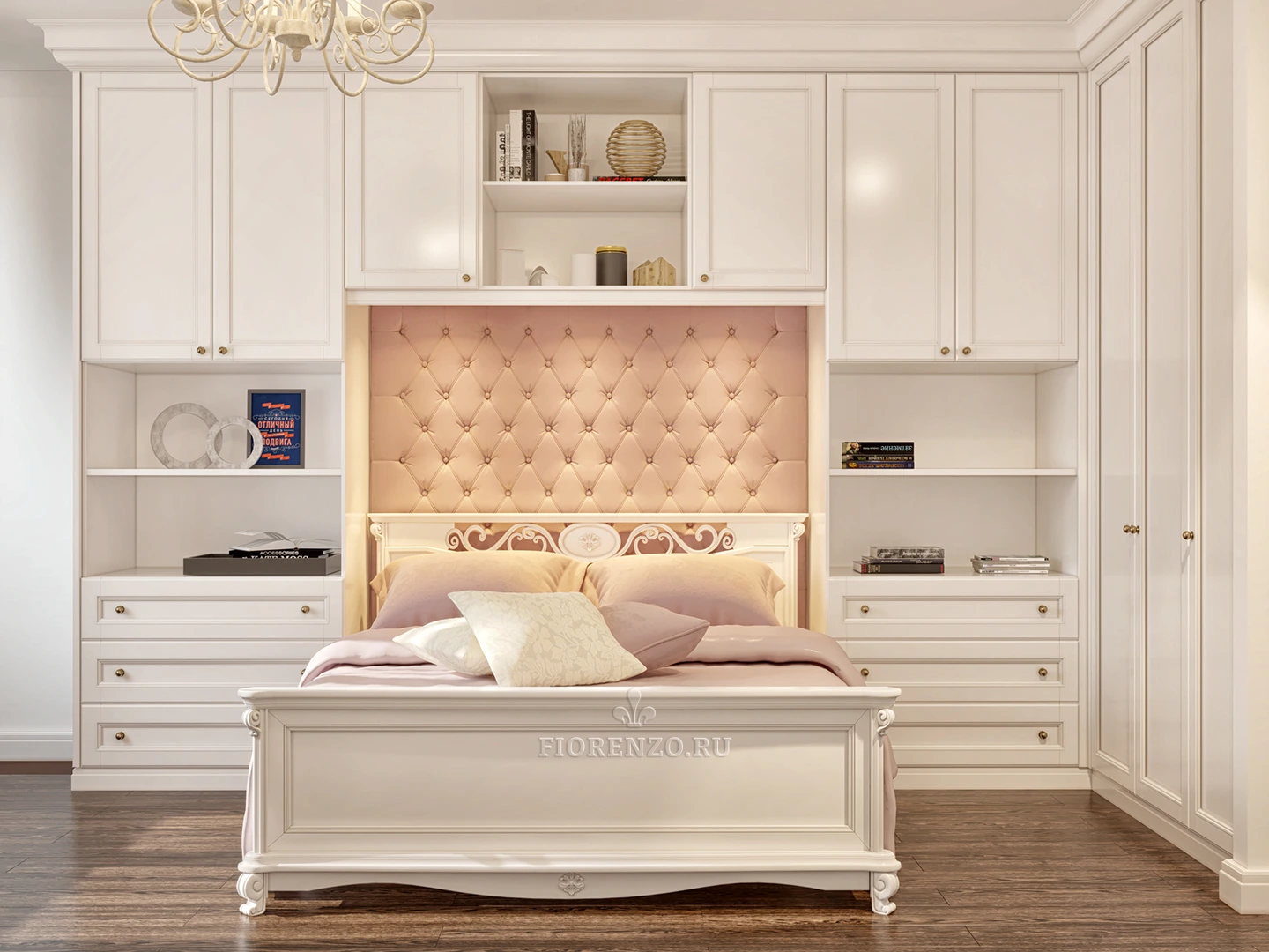 Для изготовления фасадов, карнизов, стенок кровати и прочих резных элементов классической спальни применялся крашеный МДФ по палитре RAL. Корпуса и внутренние детали – из немецкого ЛДСП Egger. Фурнитура на мебели для спальни от австрийского производителя компании Blum.
