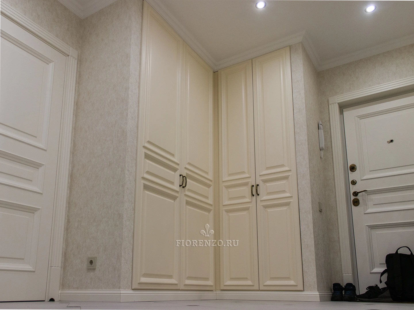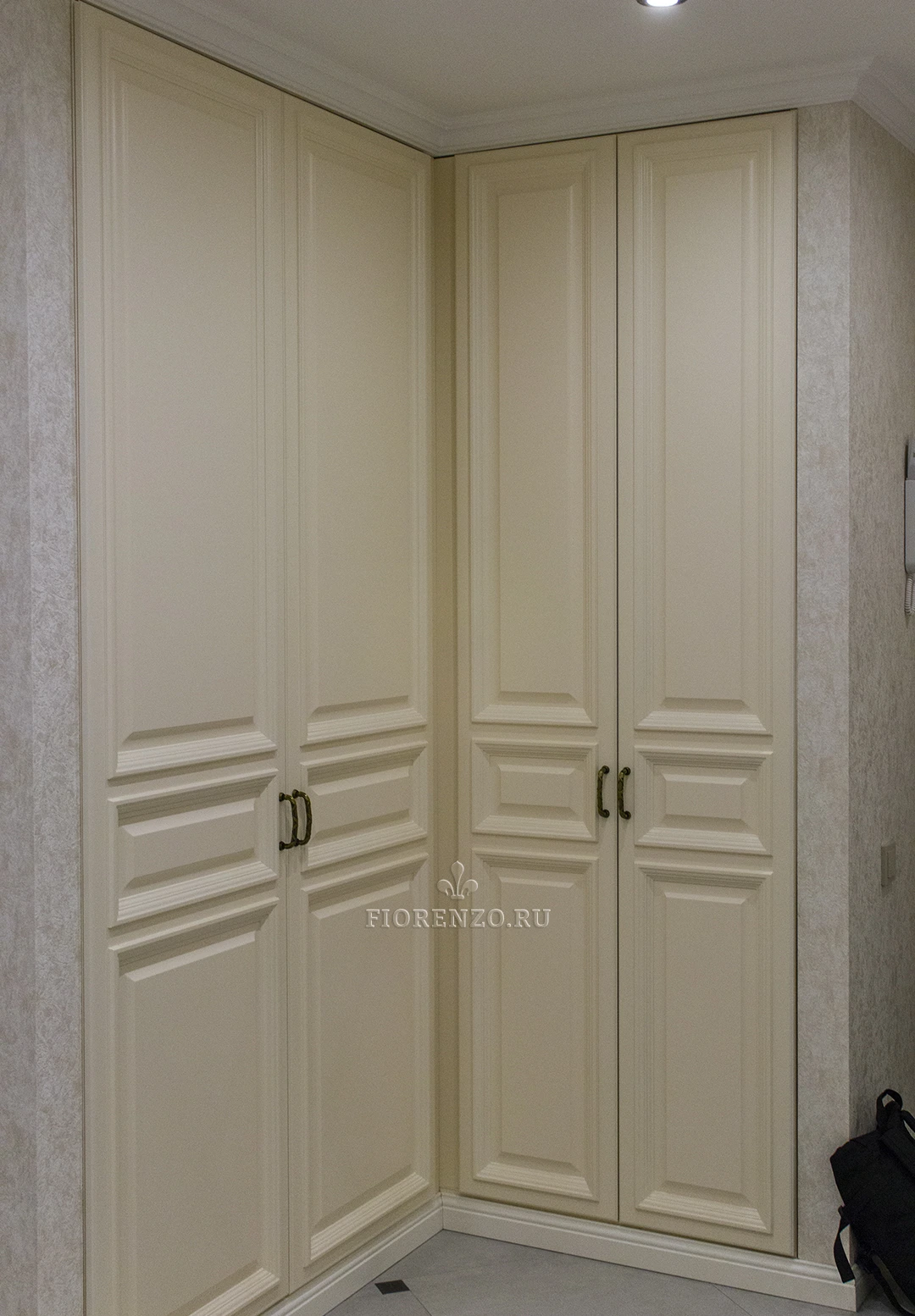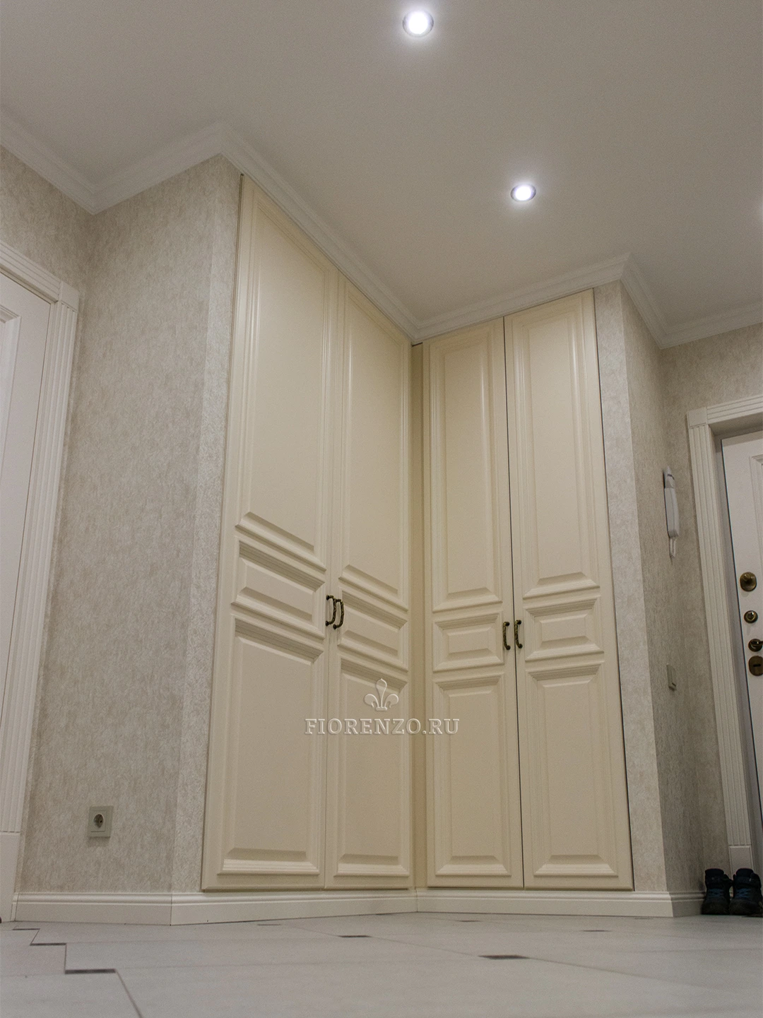 Сотрудники нашей компании создали проект и изготовили угловой встроенный шкаф «Барди» в прихожую по размерам клиента. Мебель установлена в специально подготовленные ниши на входе в жилье, выполнена в классическом стиле, который характеризуется прямыми линиями и светлыми оттенками. Фасадная часть с филенками, оснащена оригинальными ручками «под бронзу». Изделие смотрится в интерьере гармонично, не загромождает пространство, полностью выполняет возложенные на него функции – хранение вещей и одежды.