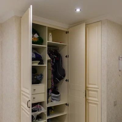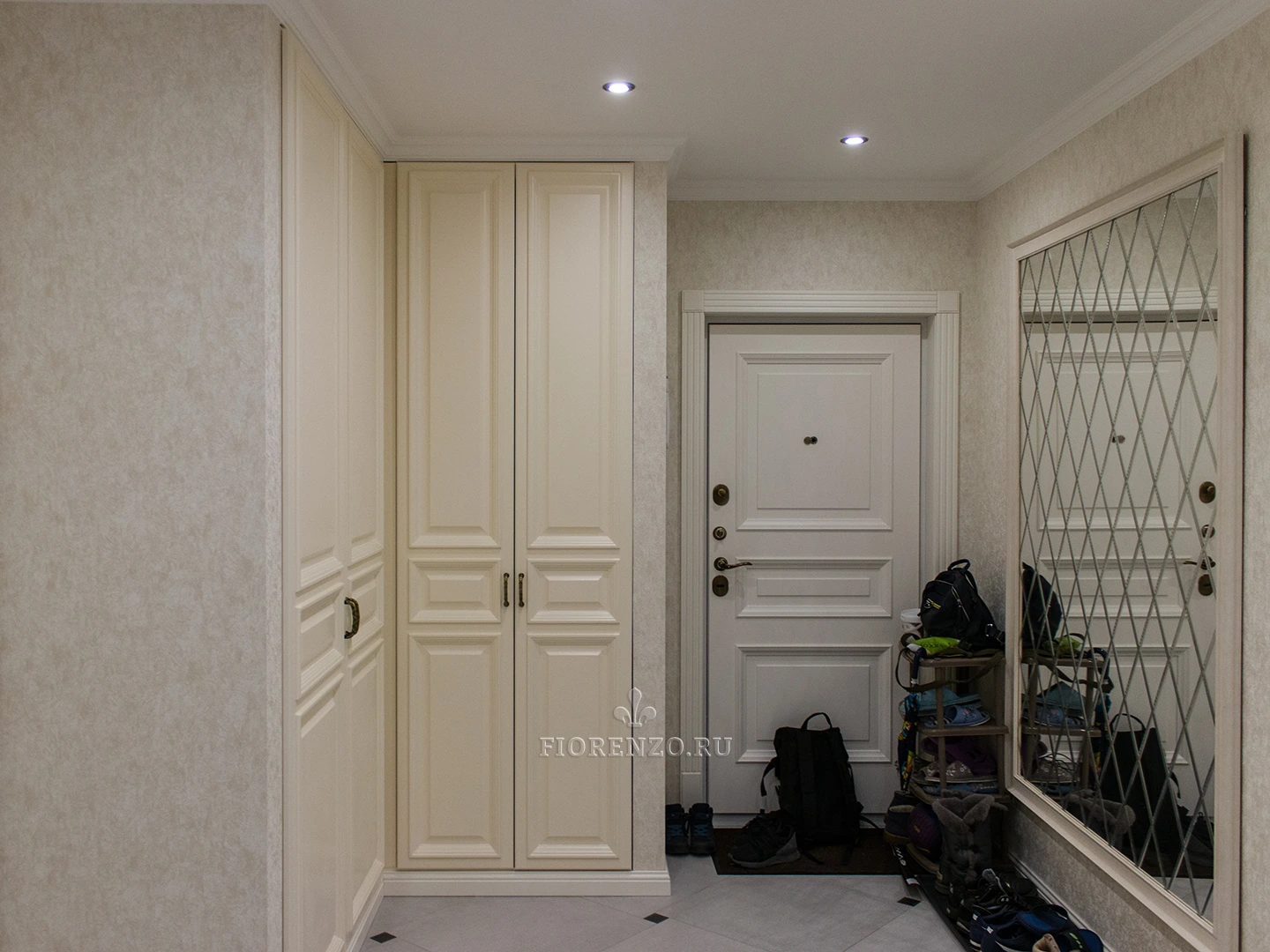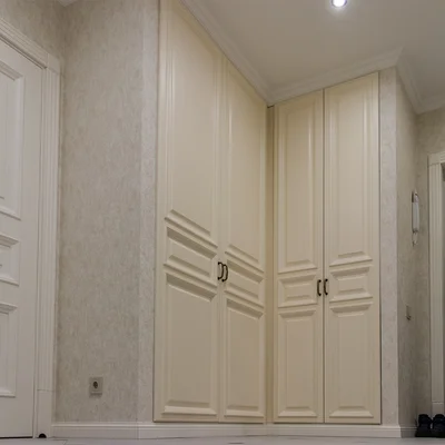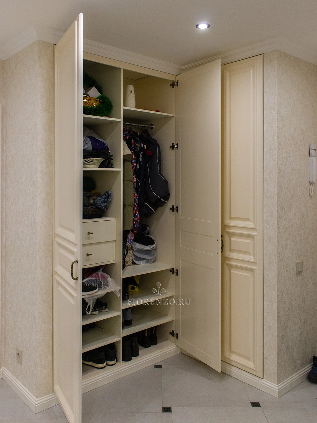 Сотрудники нашей компании создали проект и изготовили угловой встроенный шкаф «Барди» в прихожую по размерам клиента. Мебель установлена в специально подготовленные ниши на входе в жилье, выполнена в классическом стиле, который характеризуется прямыми линиями и светлыми оттенками. Фасадная часть с филенками, оснащена оригинальными ручками «под бронзу». Изделие смотрится в интерьере гармонично, не загромождает пространство, полностью выполняет возложенные на него функции – хранение вещей и одежды.