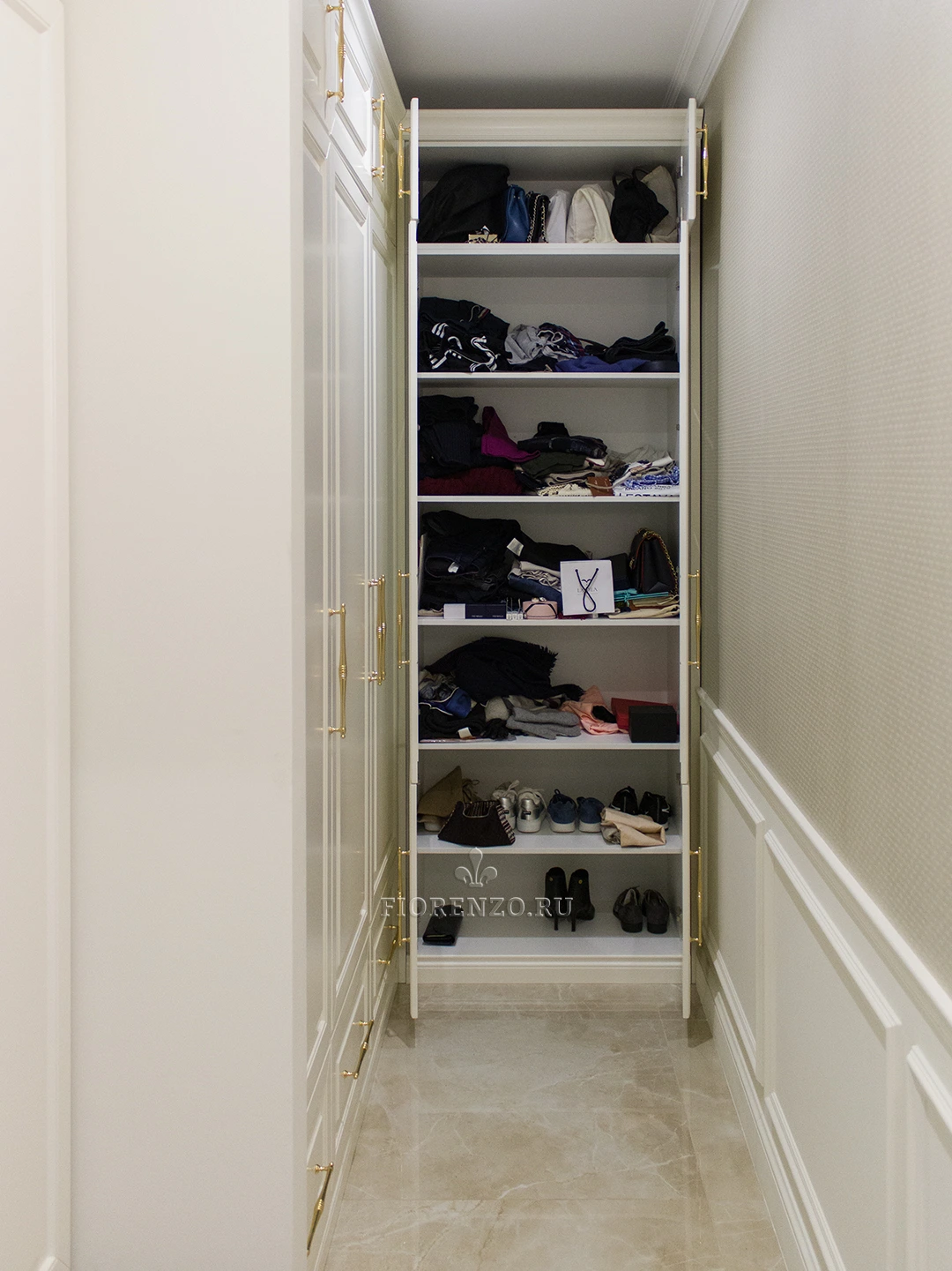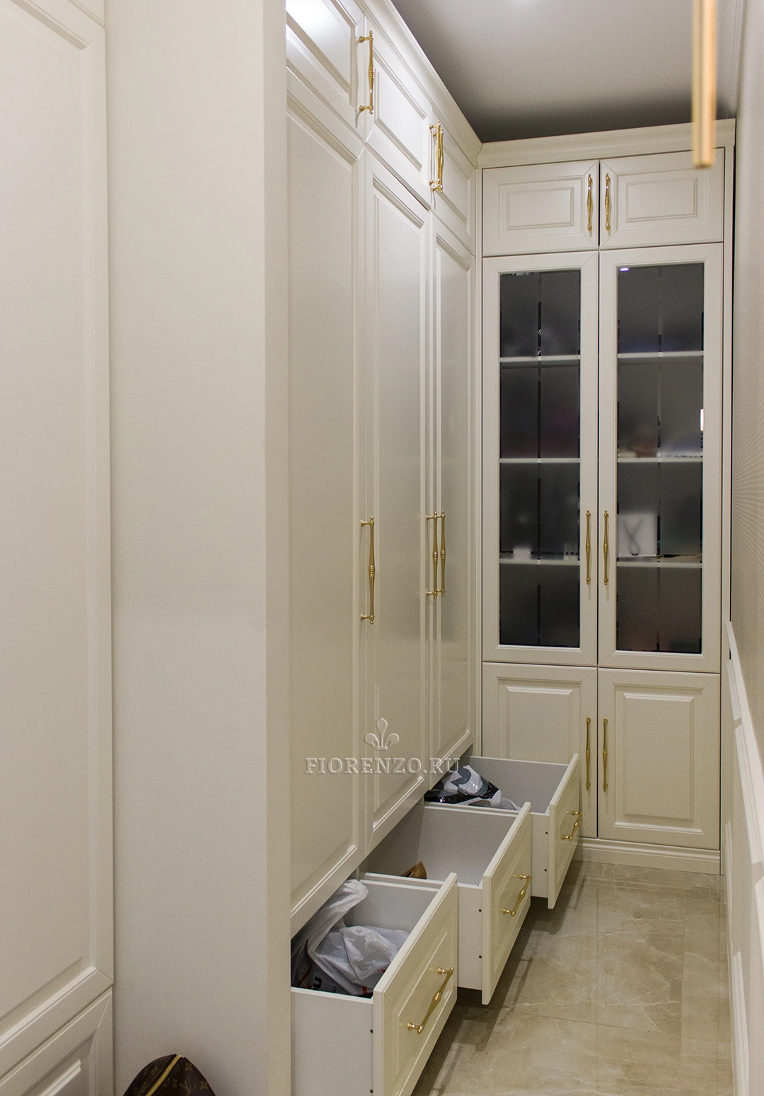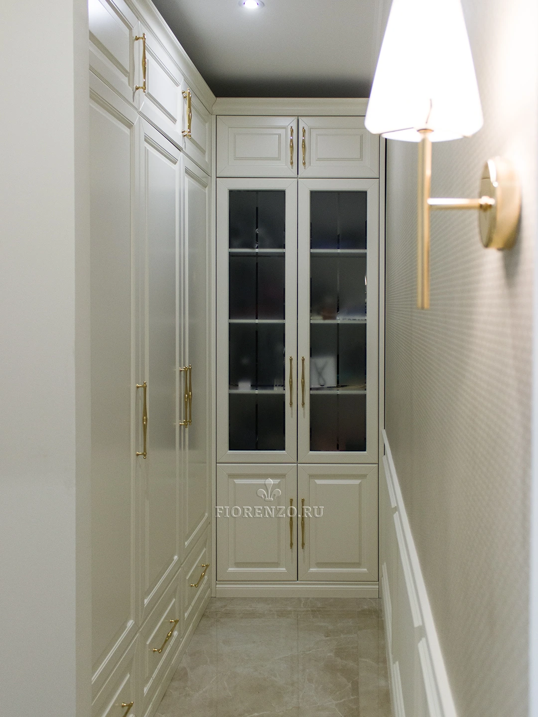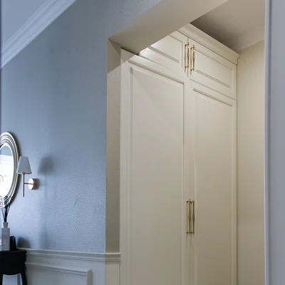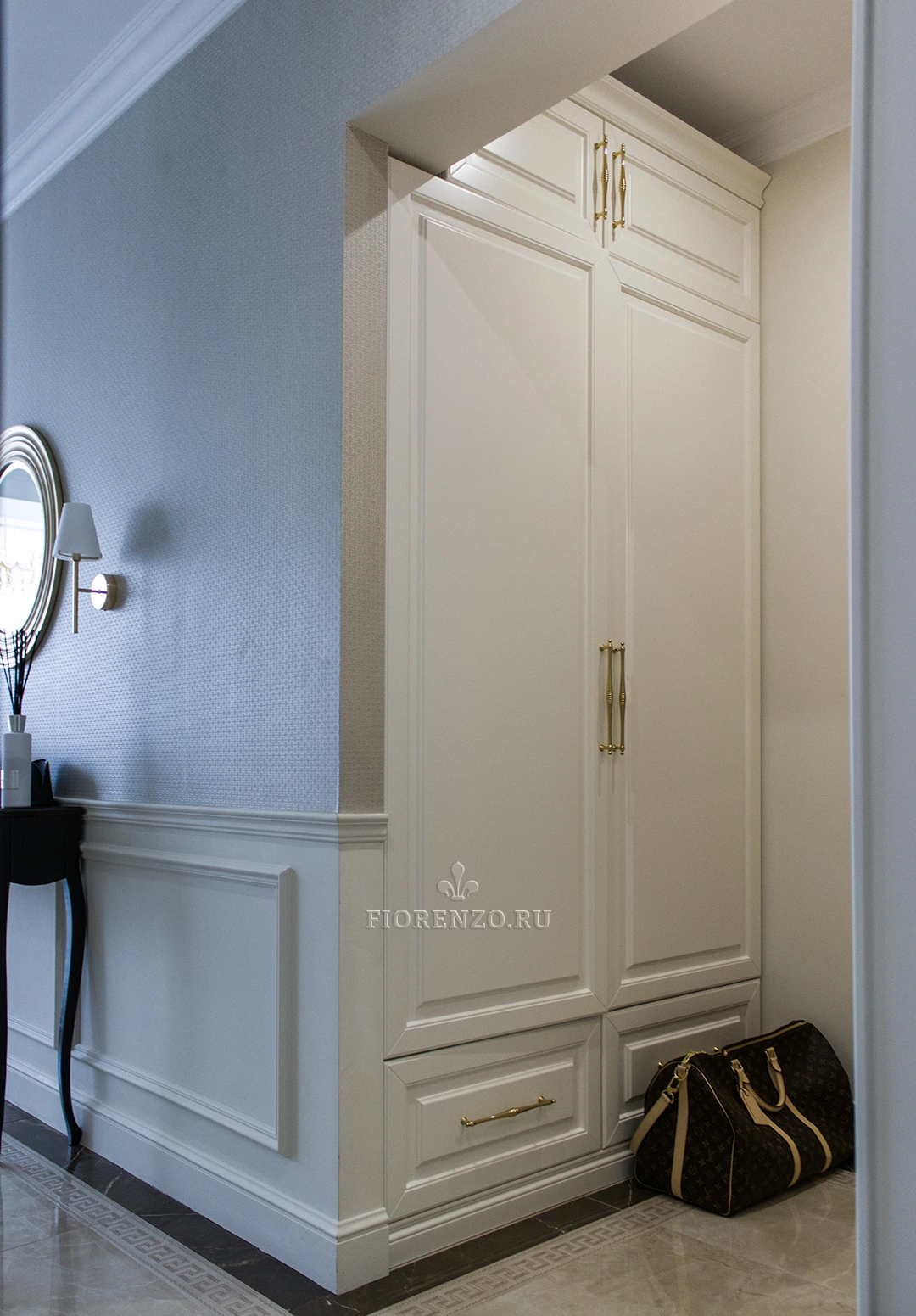 Мебельная компания Fiorenzo создала проект углового шкафа «Бари» в прихожую сложной планировки под заказ. Изделие выполнено в классическом стиле, декорировано цоколем и карнизом, филенчатыми фасадами и металлическими ручками «под золото». Г-образная форма идеально подходит для этого помещения, глубина рассчитана так, чтобы оставалось достаточно свободного места. На противоположной стене в нишу вмонтирован еще один шкаф, завершающий дизайн прихожей, делающий его законченным. Специалисты нашей компании могут создать похожий проект для вашего жилья с учетом его площади, оформления и личных пожеланий. Для визуального отображения мебели с разных ракурсов создается 3D-эскиз в специальных трехмерных программах.
