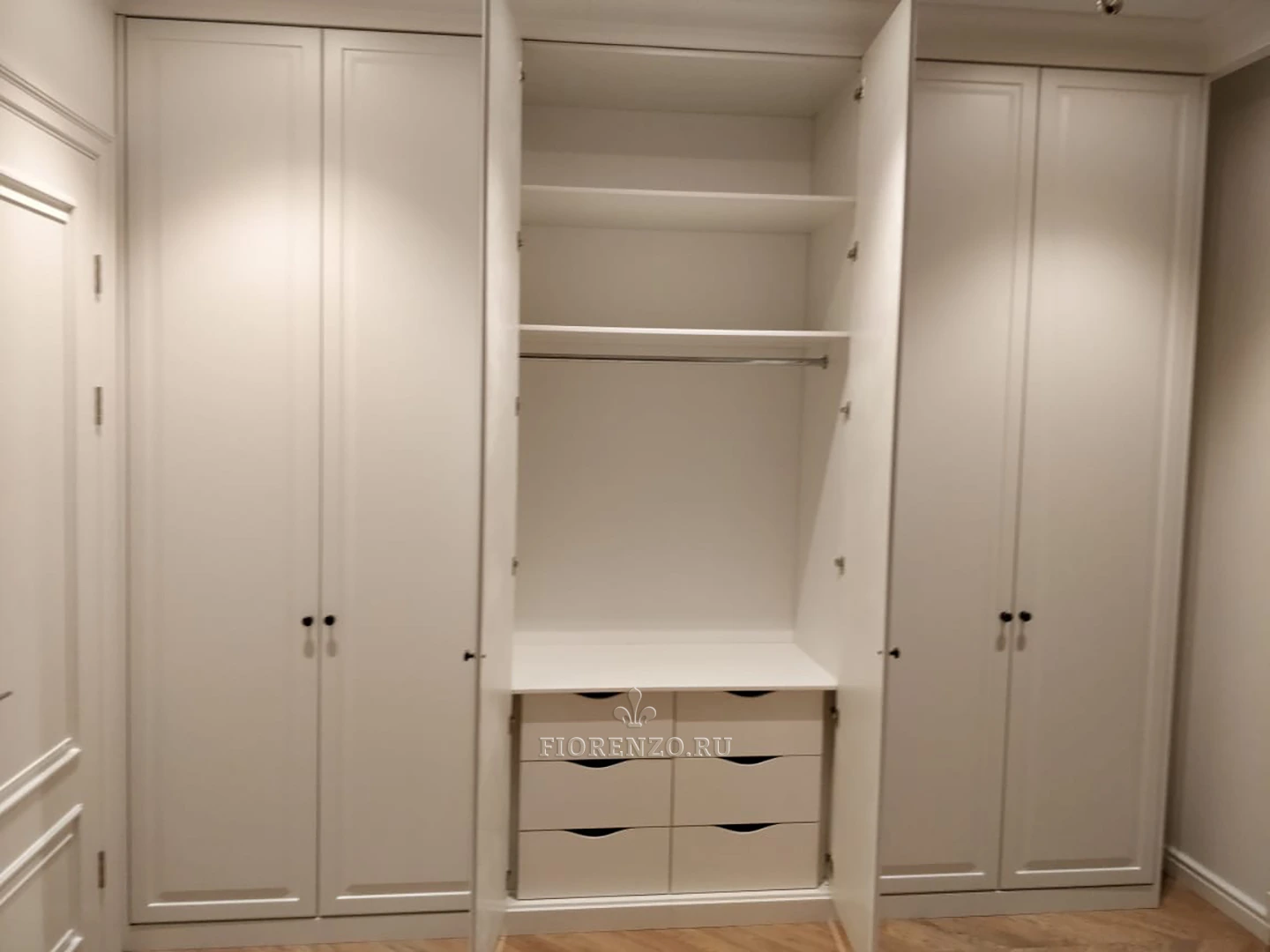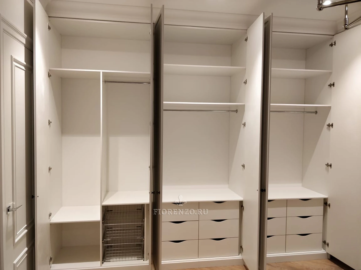 Компания Фиорензо предлагает уникальные, индивидуальные решения для современных интерьеров. Классический встроенный шкаф «Эрвин» с белыми фасадами подойдет для комфортной спальни, займет минимум места, позволит разместить необходимые вещи. Изготовление осуществляется по замерам помещения.