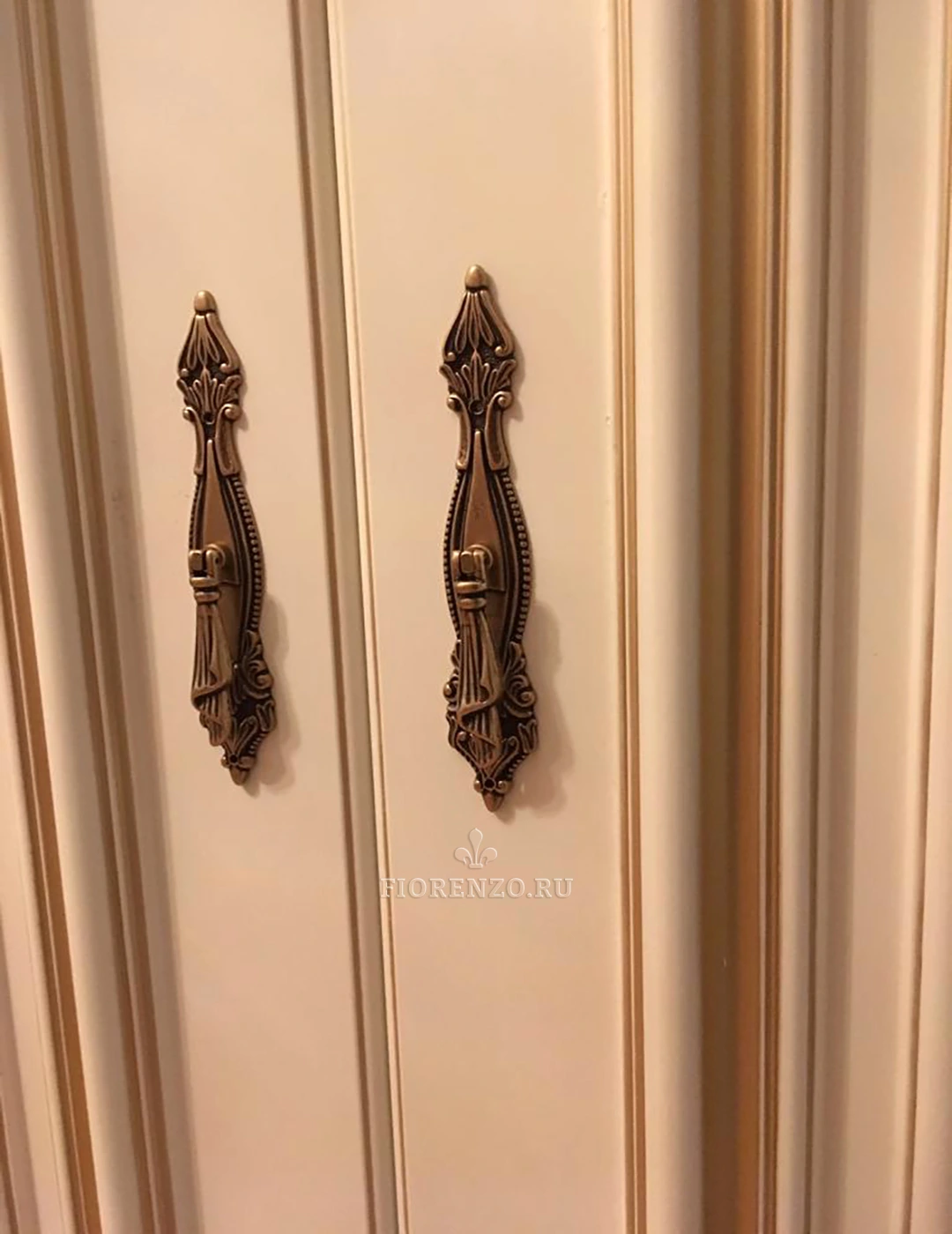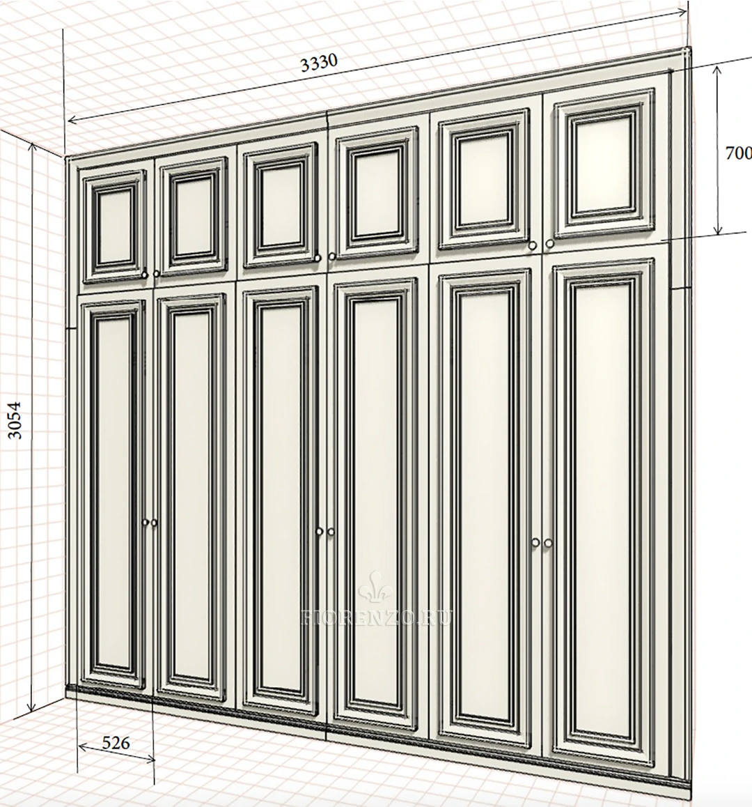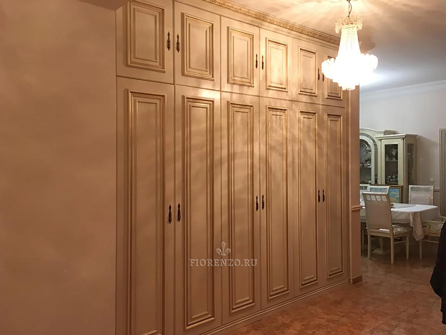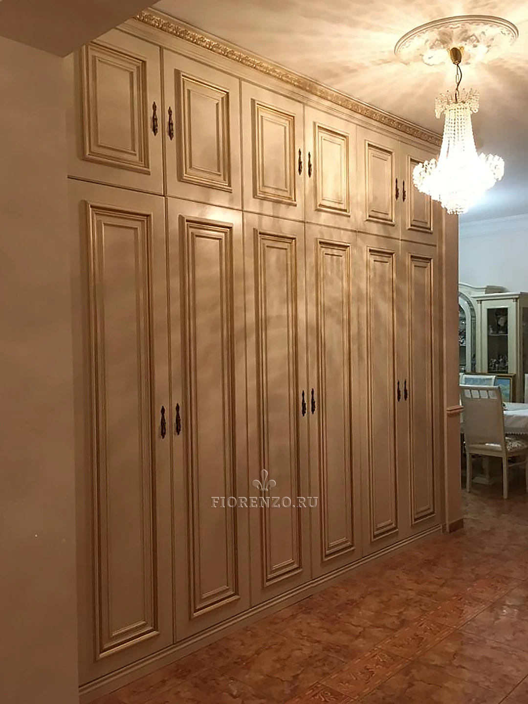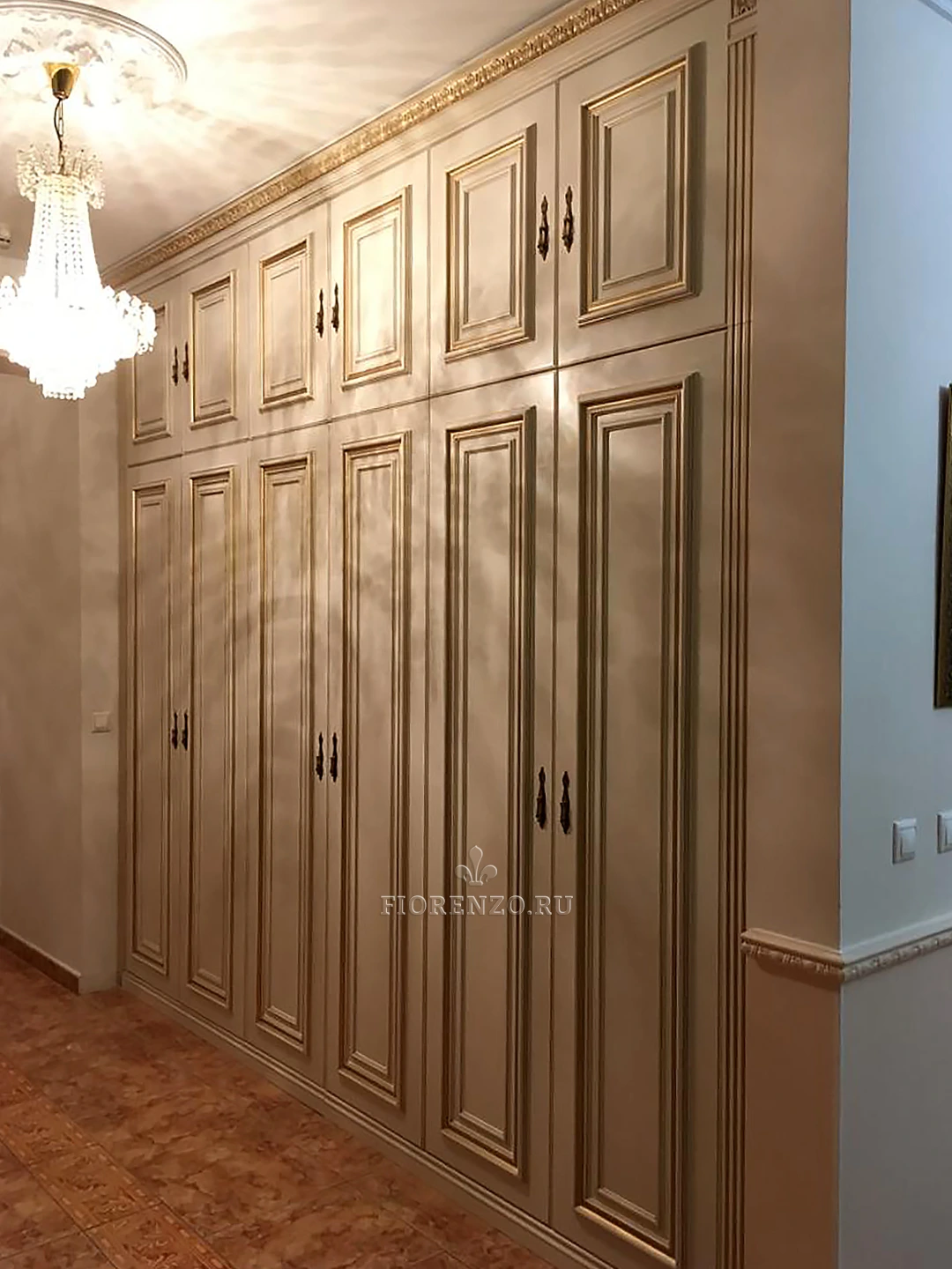 Специалисты фабрики «Фиорензо Мебель» спроектировали встроенный распашной шкаф «Бродус» для прихожей из МДФ под заказ. Изделие выполнено в классическом стиле «под старину» с применением эффектов патирования «бронзой», что делает его солидным и роскошным. Уникальная раскладка на фасадах, резной карниз, массивный цоколь, оригинальные ручки – все это отлично вписывается в окружающую обстановку комнаты.