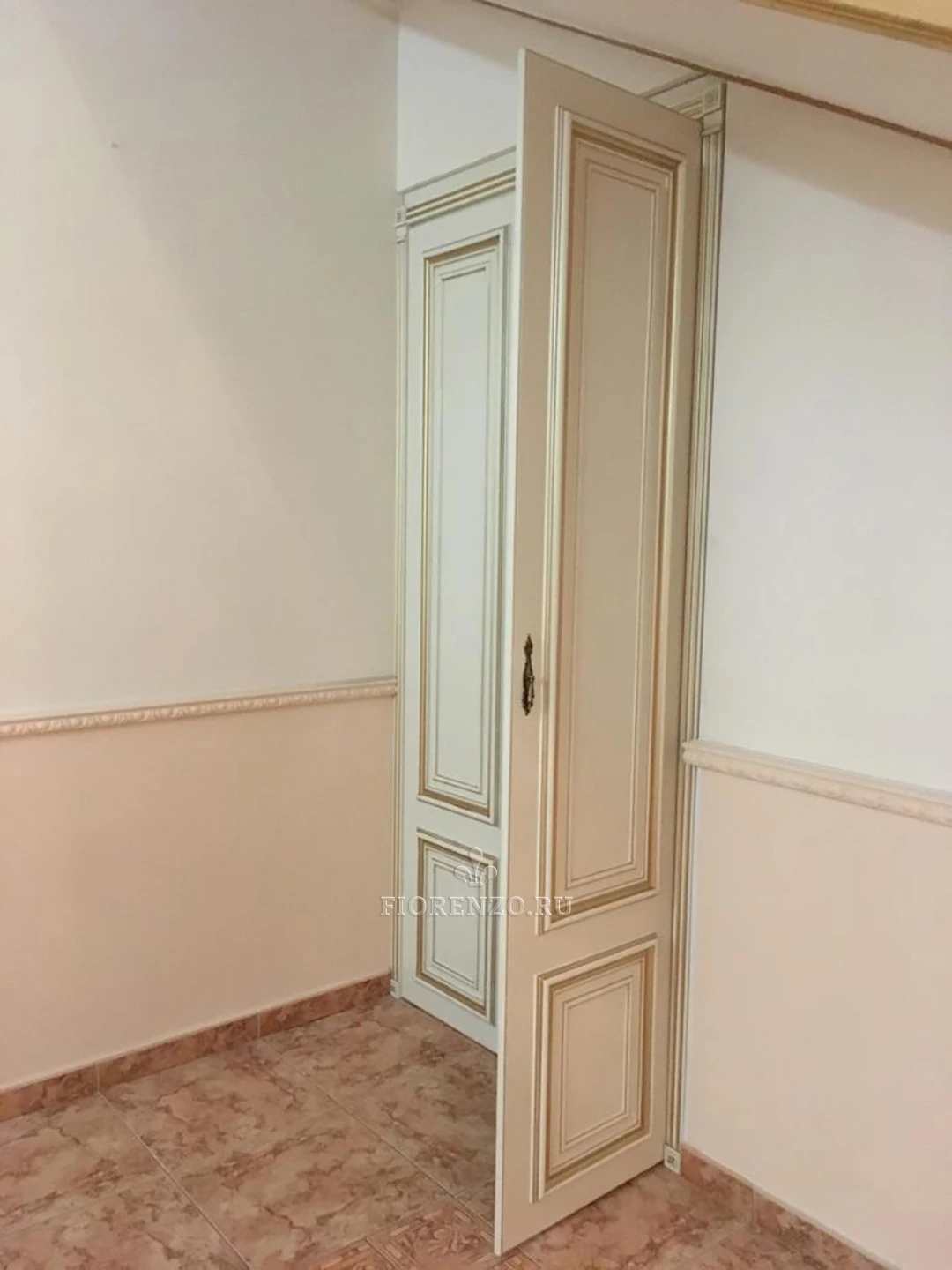 Фасады и декор распашного шкафа встроенного типа – крашеное МДФ с эффектом «бронзового» патирования. Корпус и внутренние детали – ламинированная плита «Эггер». Фурнитура – австрийский бренд BLUM.