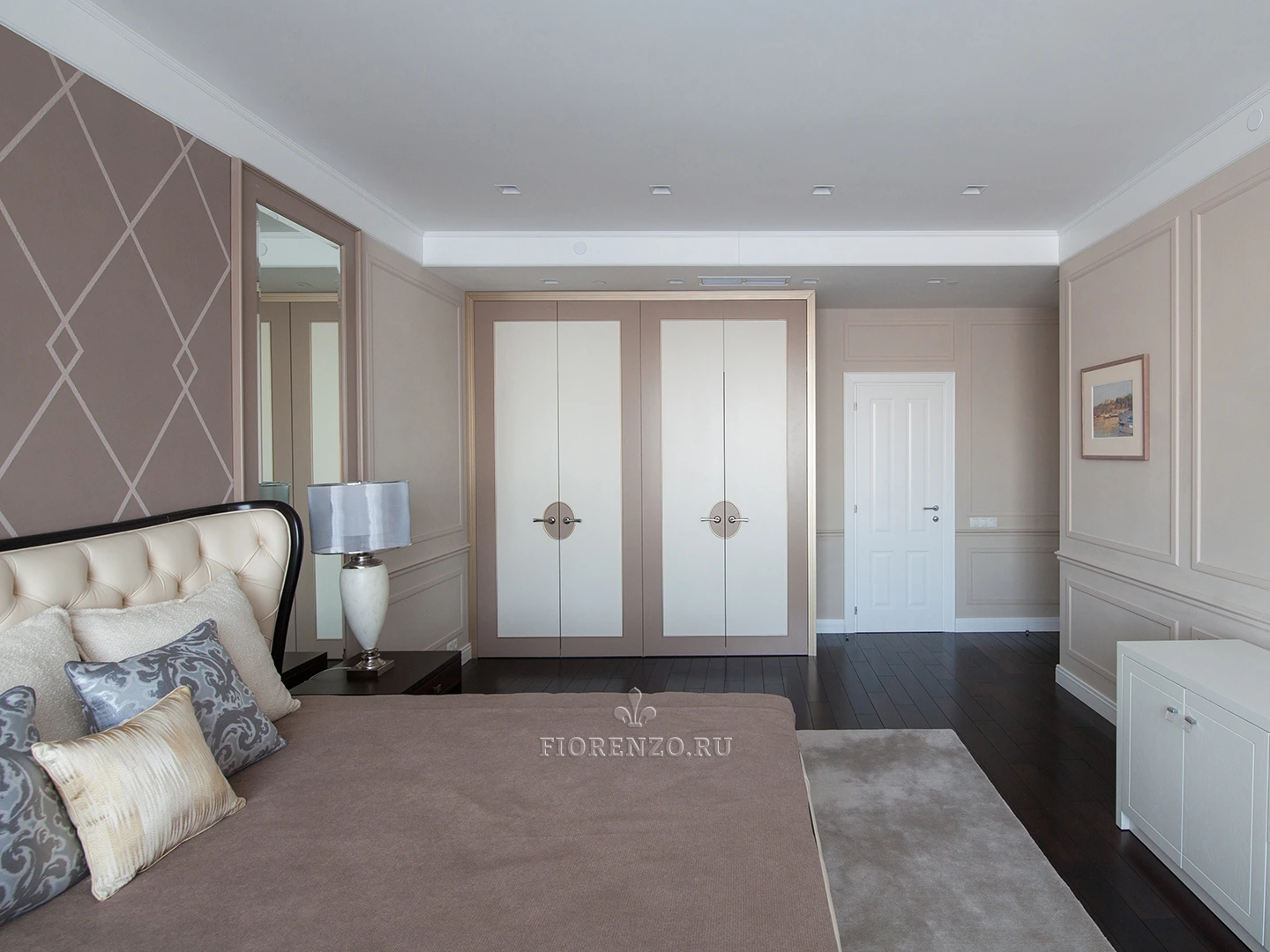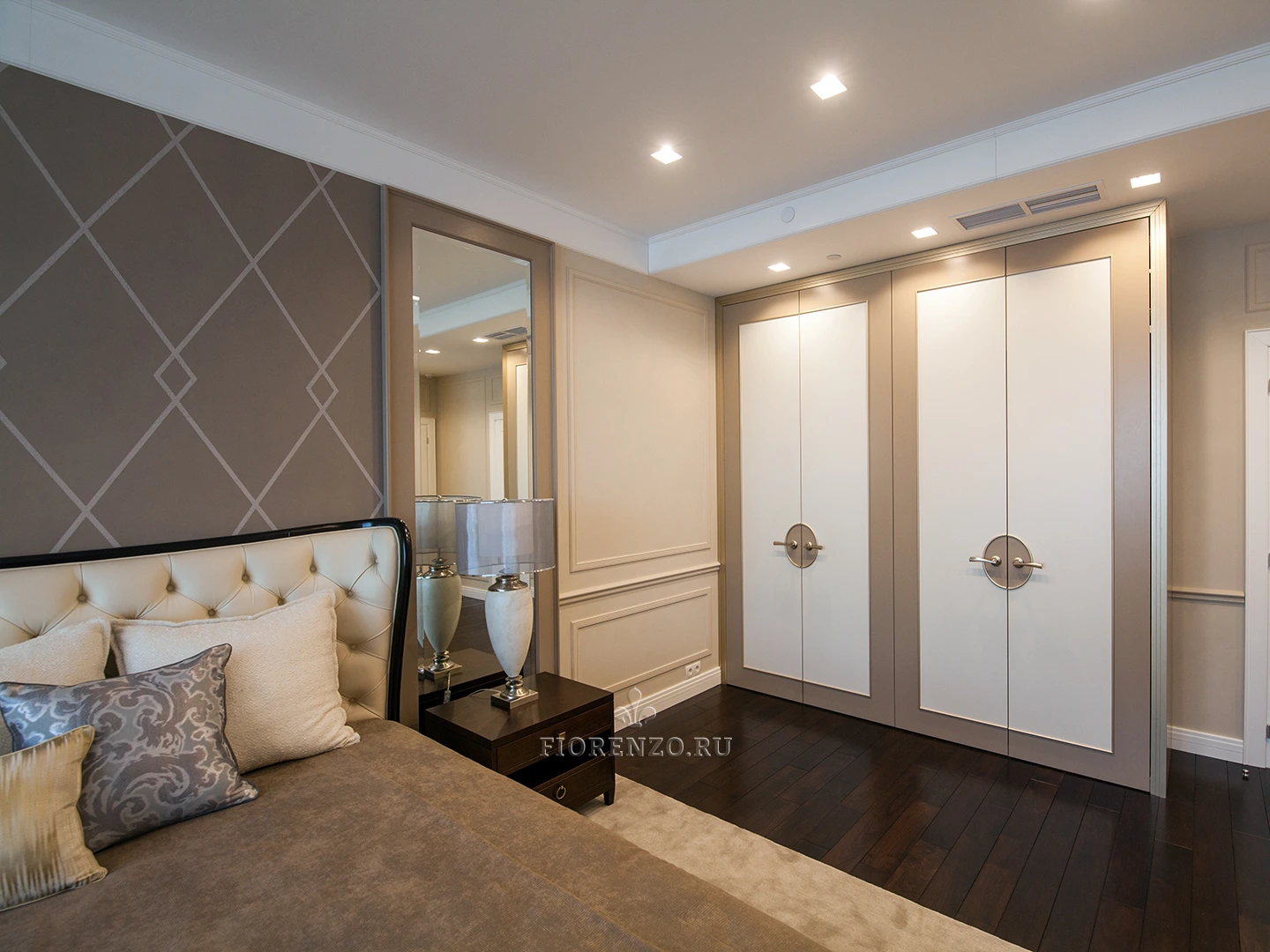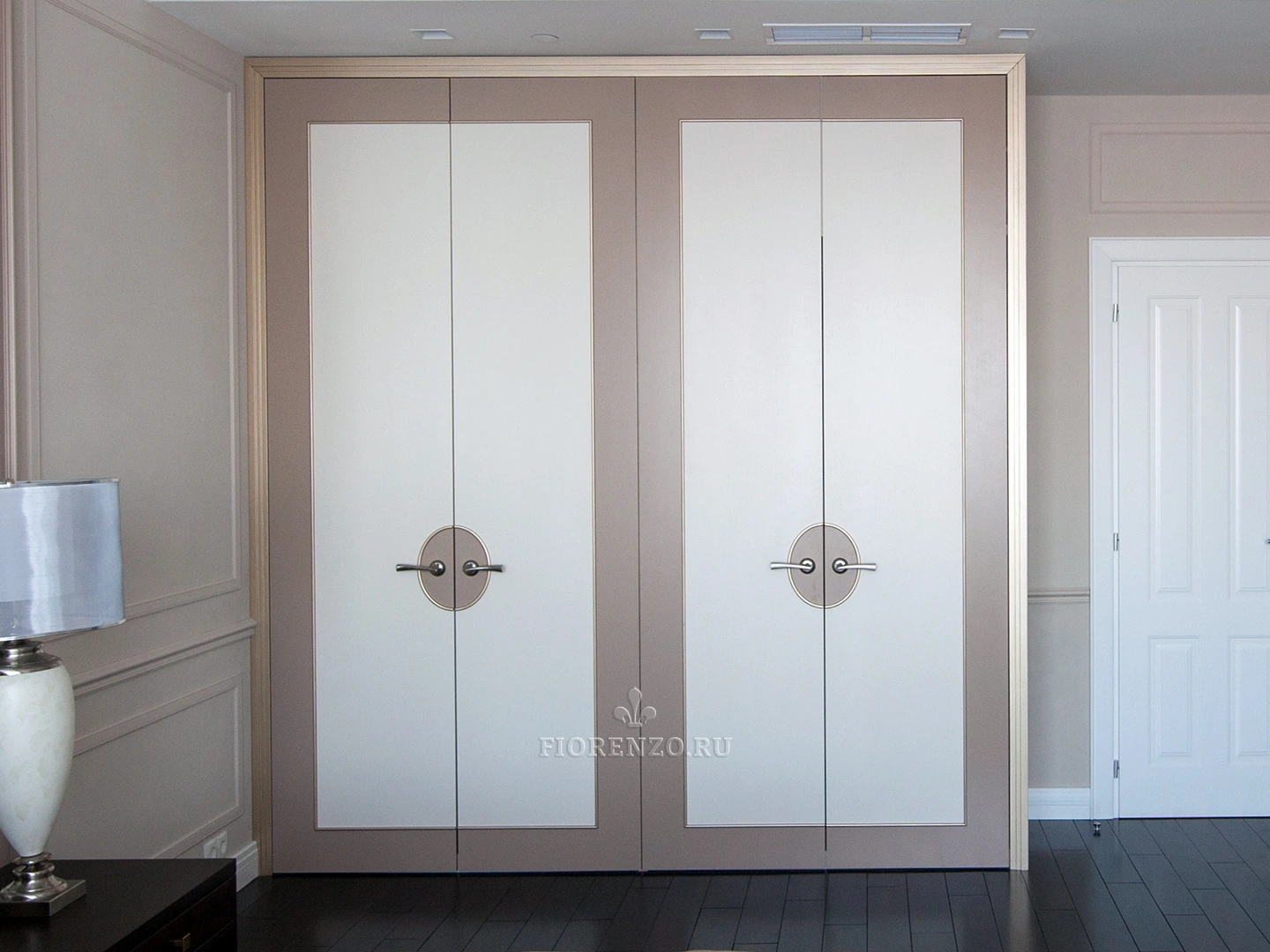 Внутренности и каркас классической встроенной мебели под заказ изготовлены из ЛДСП Egger, имеющего экологические сертификаты. Фасадная часть и декоративные накладки – из крашеного МДФ по палитре RAL. Установлены петли и направляющие для ящиков с газовыми доводчиками от австрийской компании Blum.