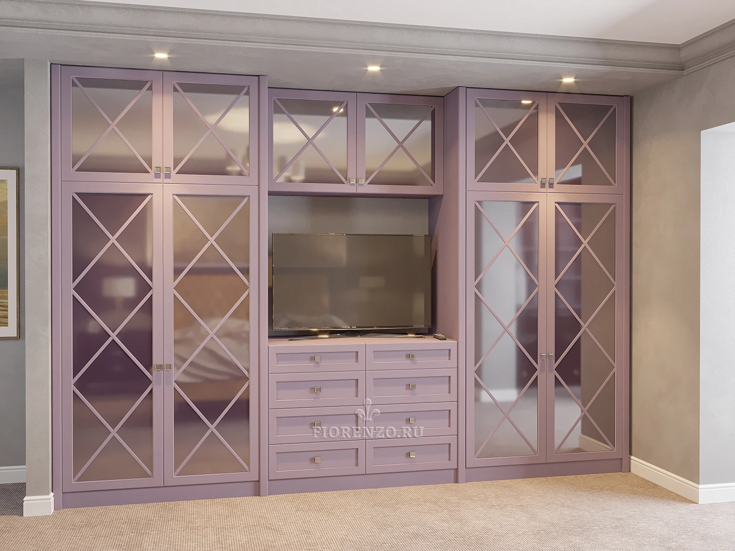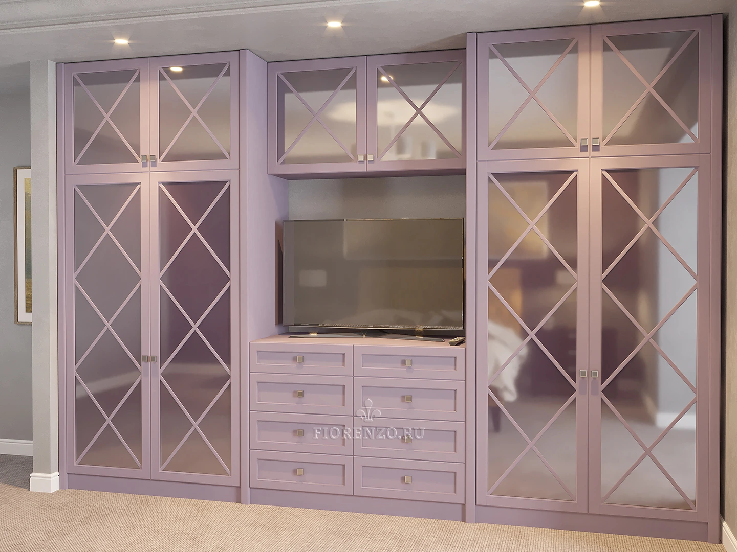 Встроенный шкаф разделен на три отдельных секции, каждая из которых выполняет конкретные функции. Боковые отсеки предназначены для хранения одежды, личных вещей, сумок, обуви и различных аксессуаров. В центральном отделе организована ТВ–консоль, навесная антресоль и элемент с выдвижными ящиками в форме комода. Эргономика мебели максимально продумана для удобства пользования в помещениях различного назначения (гостиная или спальня).