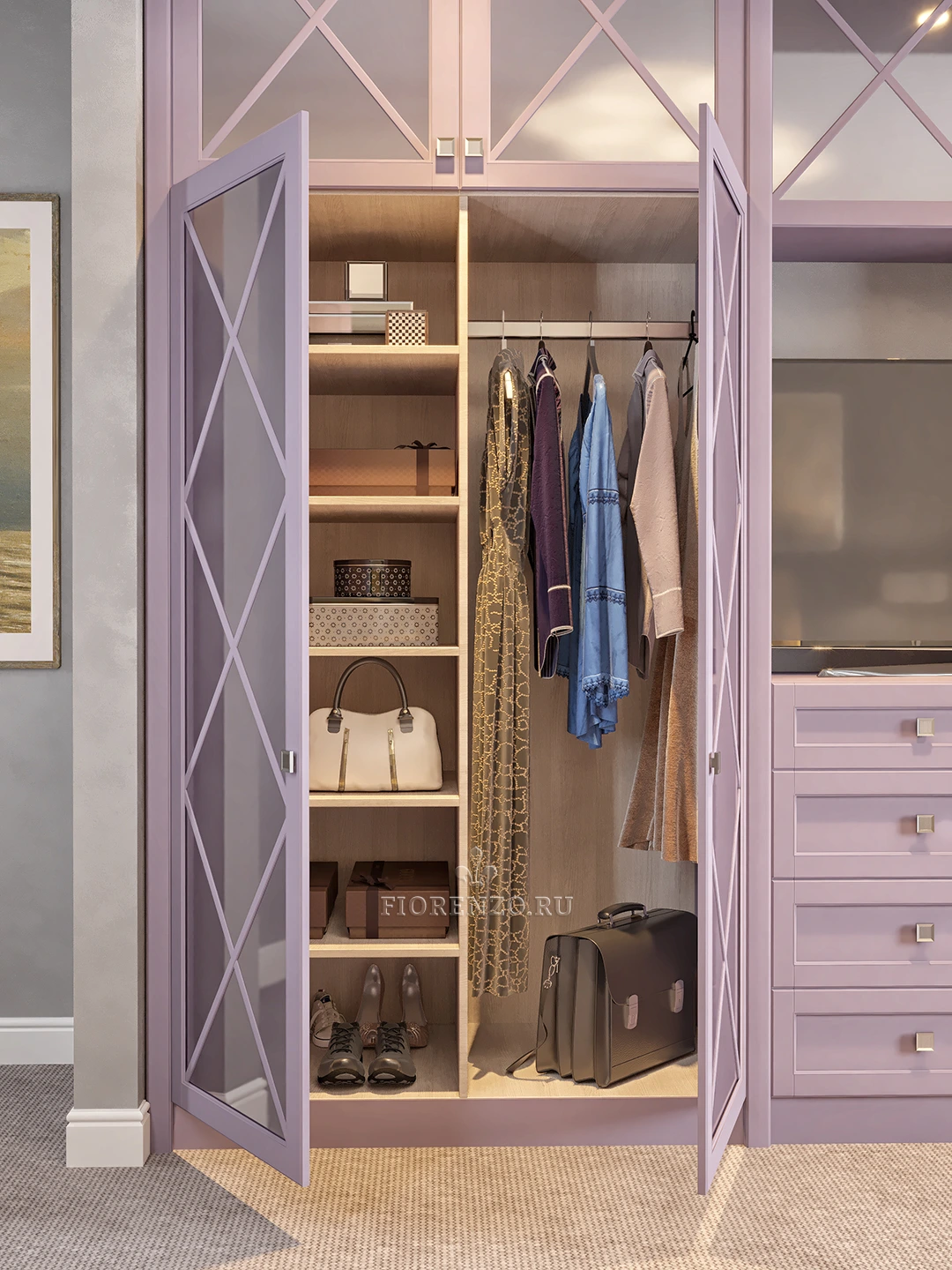 Обустройство в нише и изготовление под заказ позволило избежать острых углов в комнате, а точечная подсветка над каждой секцией позволяет без проблем отыскать в шкафу необходимую деталь гардероба или вещь.