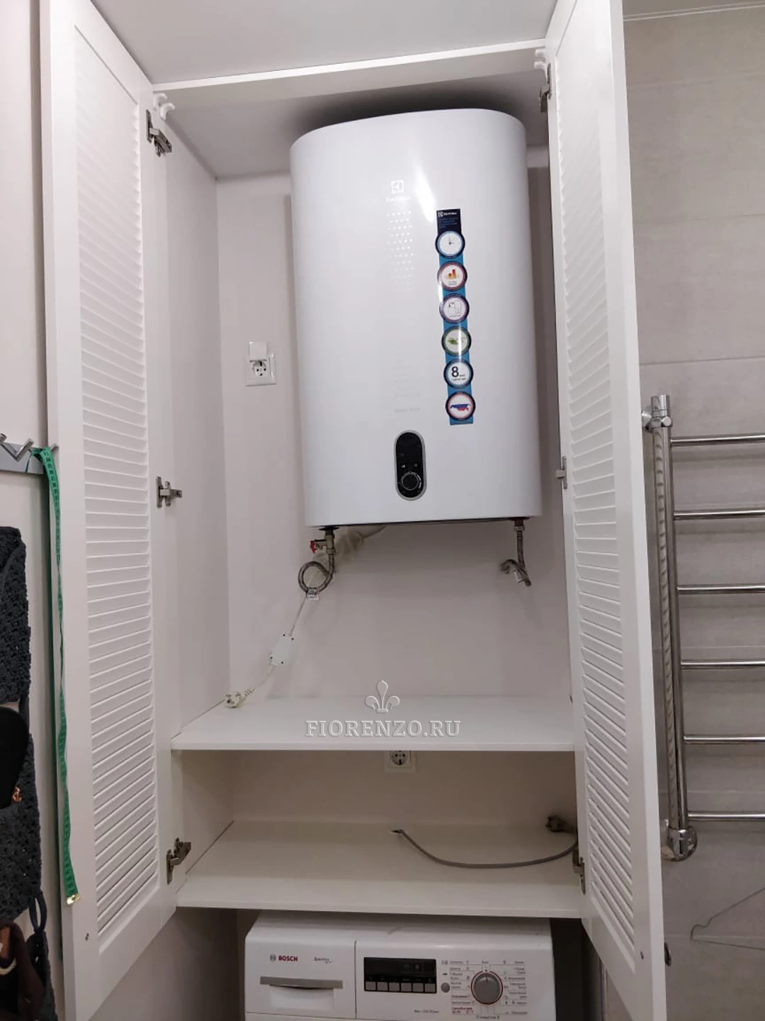 Технические шкафы во влажных помещениях, таких как санузлы и ванную комнаты обычно закрывают фасадами с вентиляцией. Так и в данном проекте был изготовлен встроенный распашной шкаф над стиральной машиной с жалюзийными фасадами из МДФ. Внутри шкафа «Кант» был смонтировал водонагреватель (бойлер) на случай отключения горячего водоснабжения.