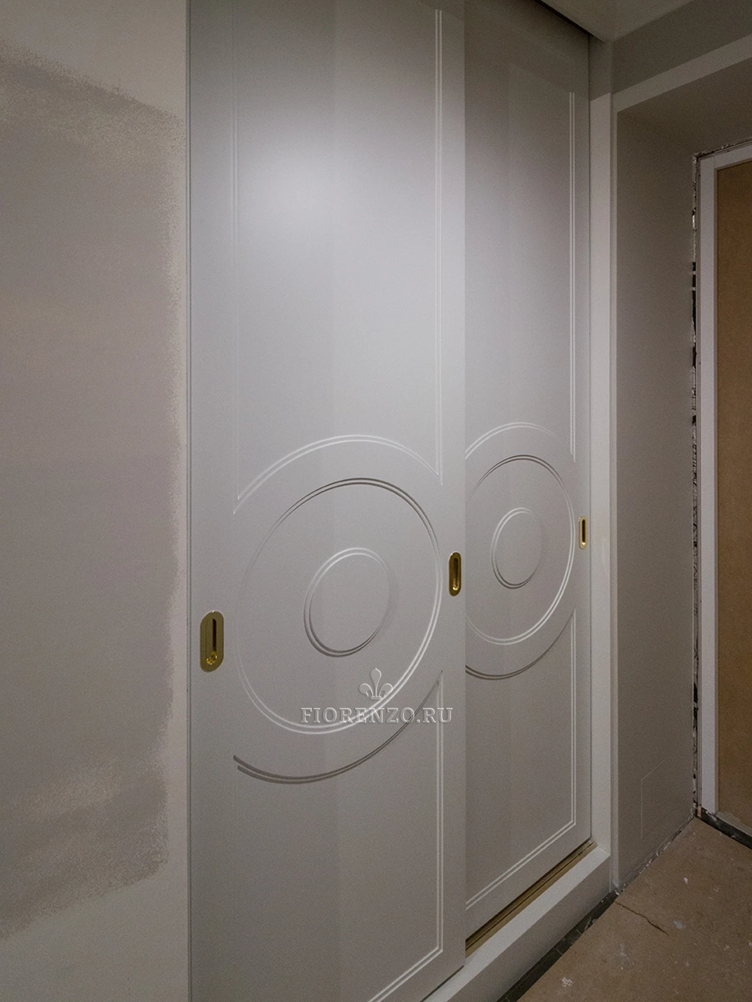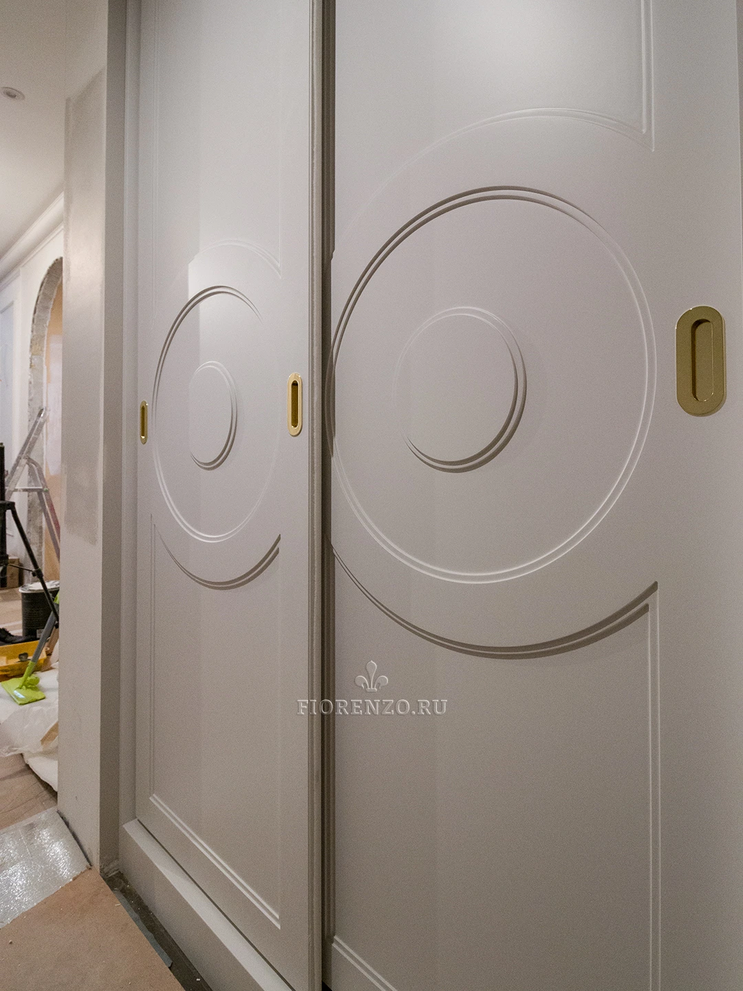 Для изготовления конструкции использован прочный МДФ. На фасадах материал покрыт эмалью по каталогу RAL. При необходимости цвет окрашивания меняется с учетом потребностей проекта. Много внимания уделено фурнитуре: «Фиорензо Мебель» использует в работе два бренда — австрийский BLUM и HARN. Прочная, надежная фурнитура существенно продлевает срок службы шкафа-купе.