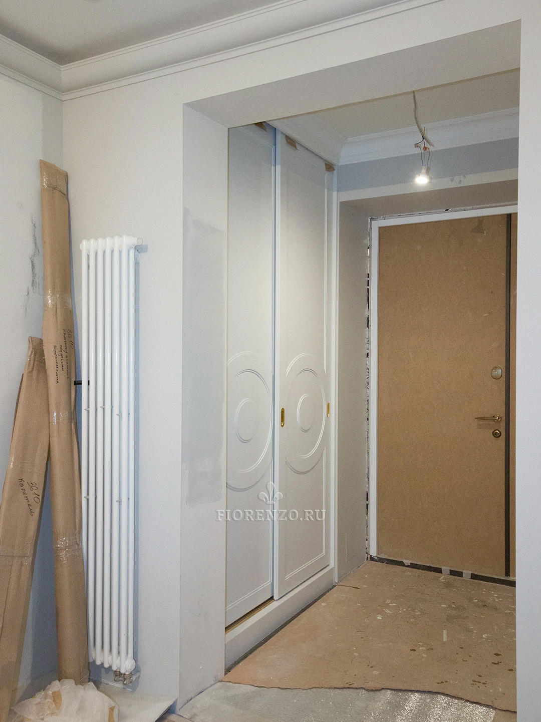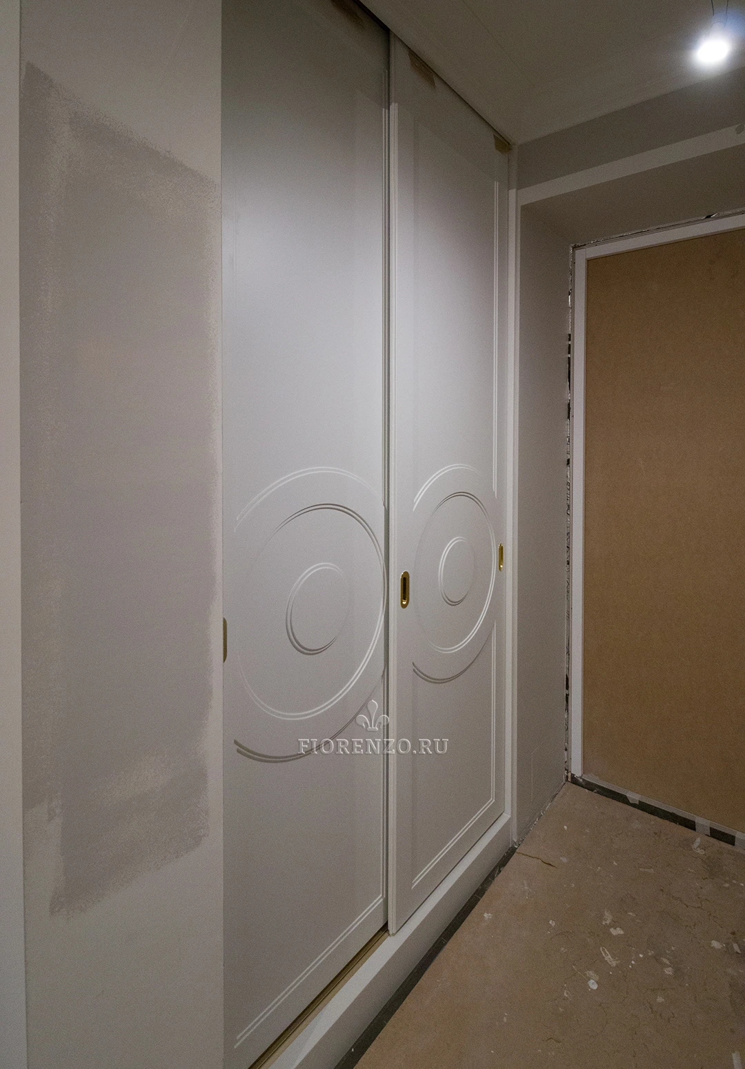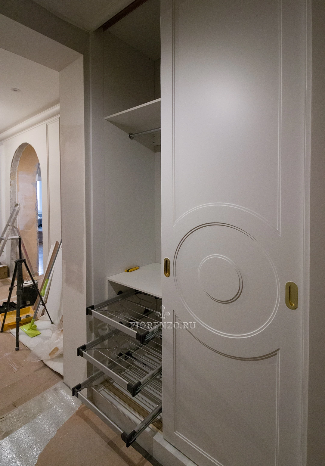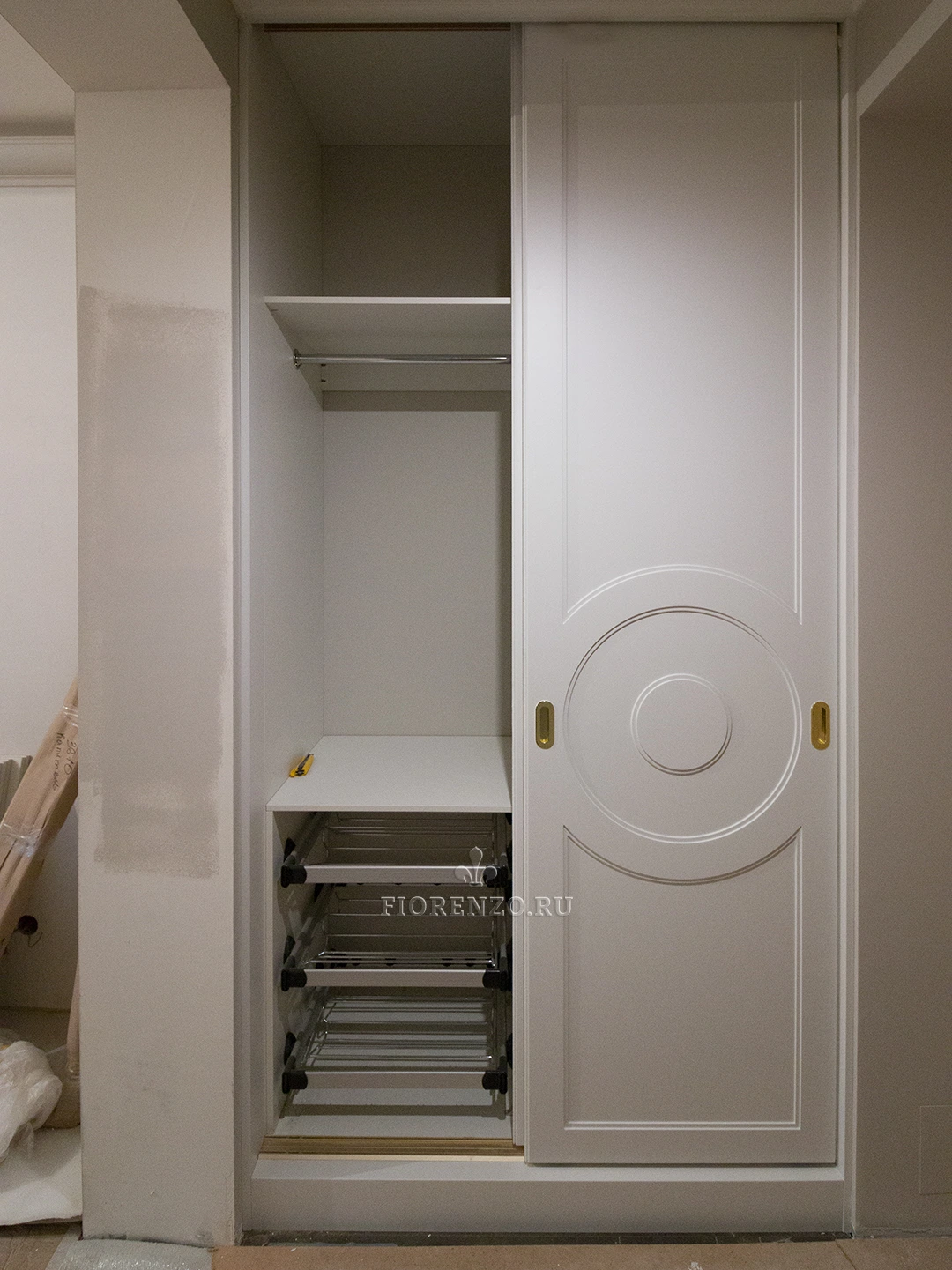 Компактный, но вместительный шкаф-купе в неоклассическом стиле оснащен полками, штангами для развешивания одежды, специальными механизмами для хранения обуви. Встраиваемая конструкция позволяет занять свободную нишу, сохранив ценные метры прихожей для комфорта жильцов.