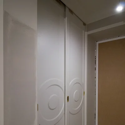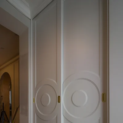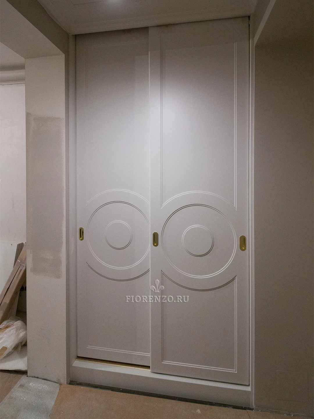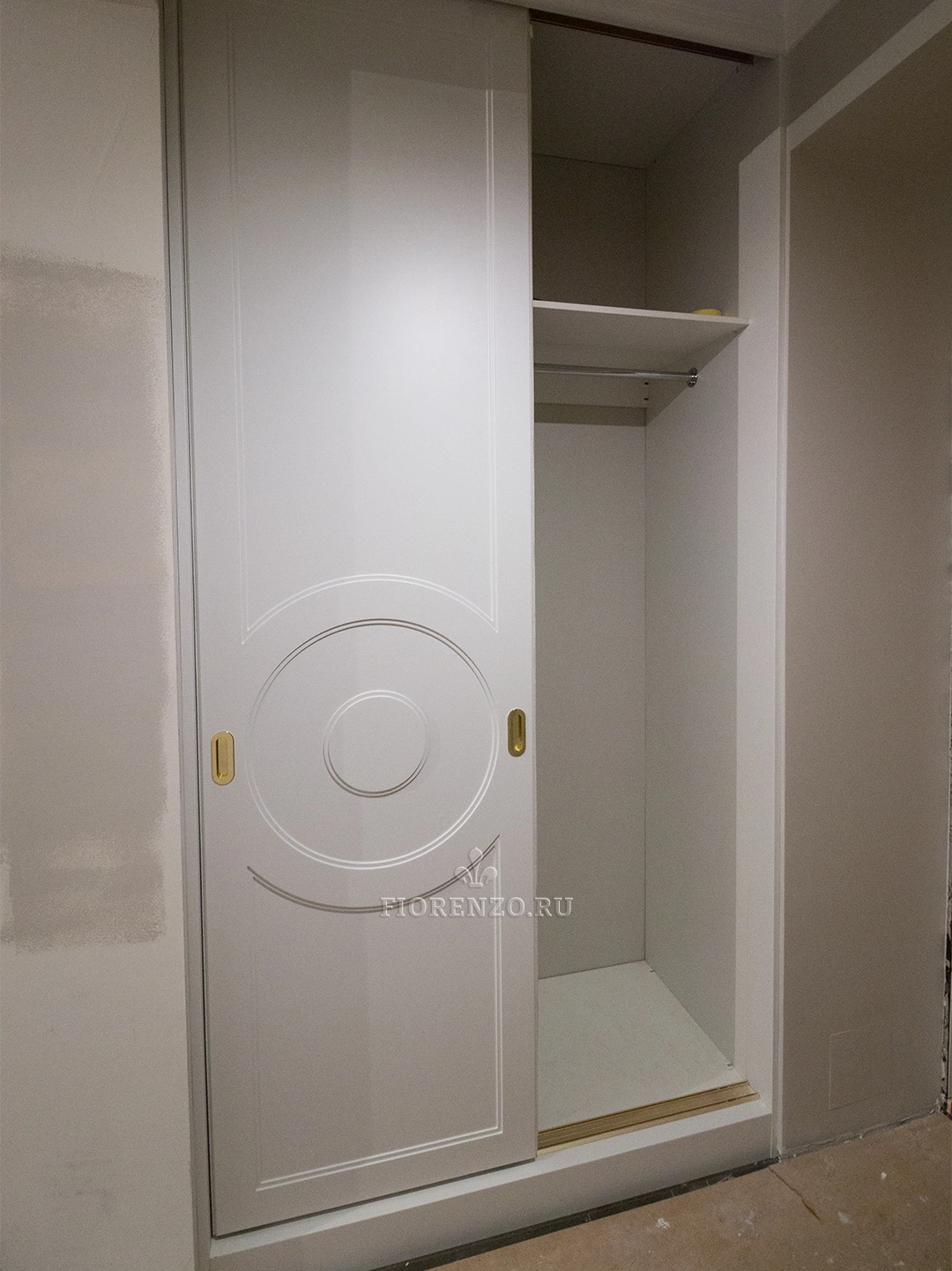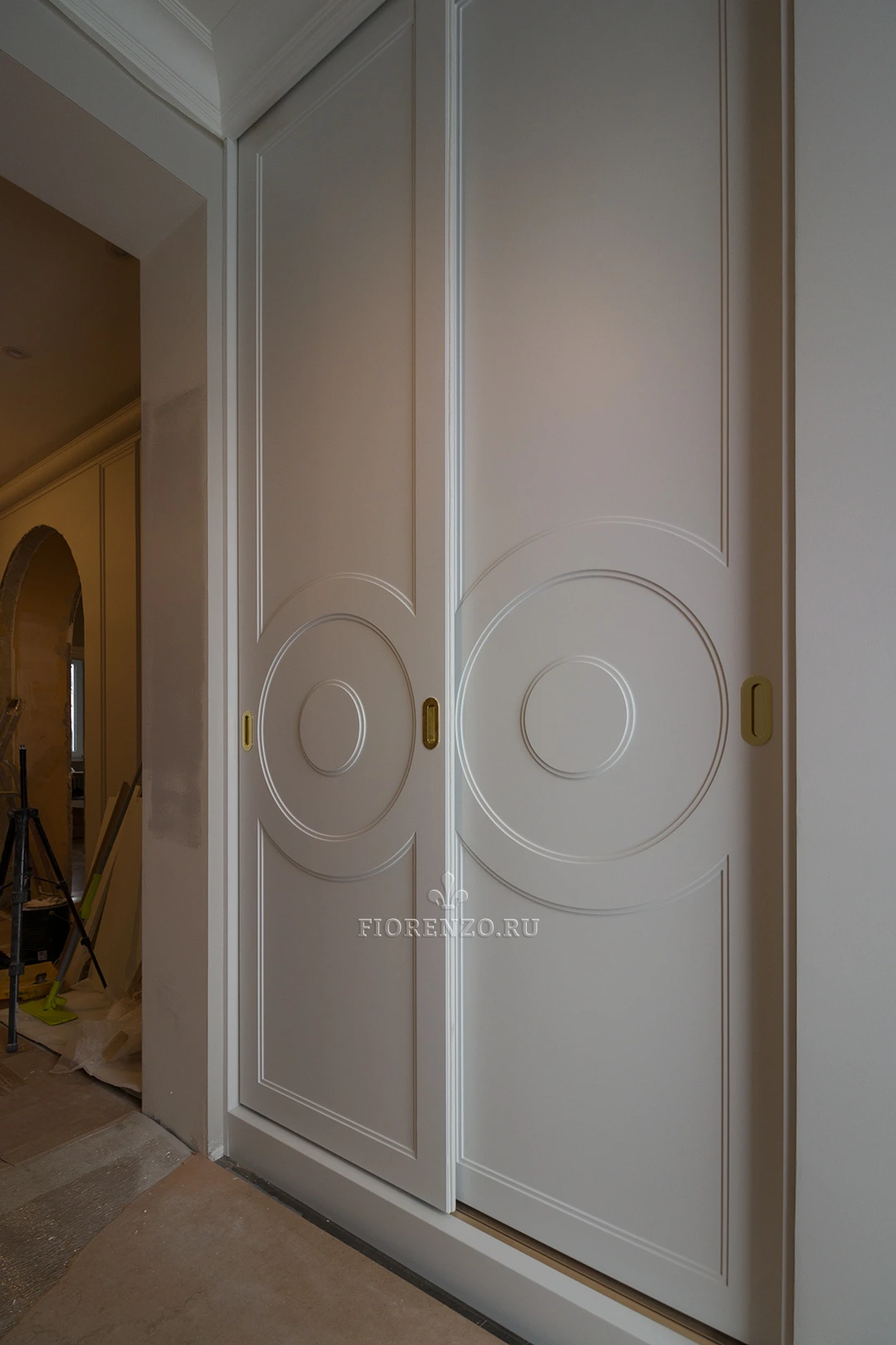 Компактный, но вместительный шкаф-купе в неоклассическом стиле оснащен полками, штангами для развешивания одежды, специальными механизмами для хранения обуви. Встраиваемая конструкция позволяет занять свободную нишу, сохранив ценные метры прихожей для комфорта жильцов.