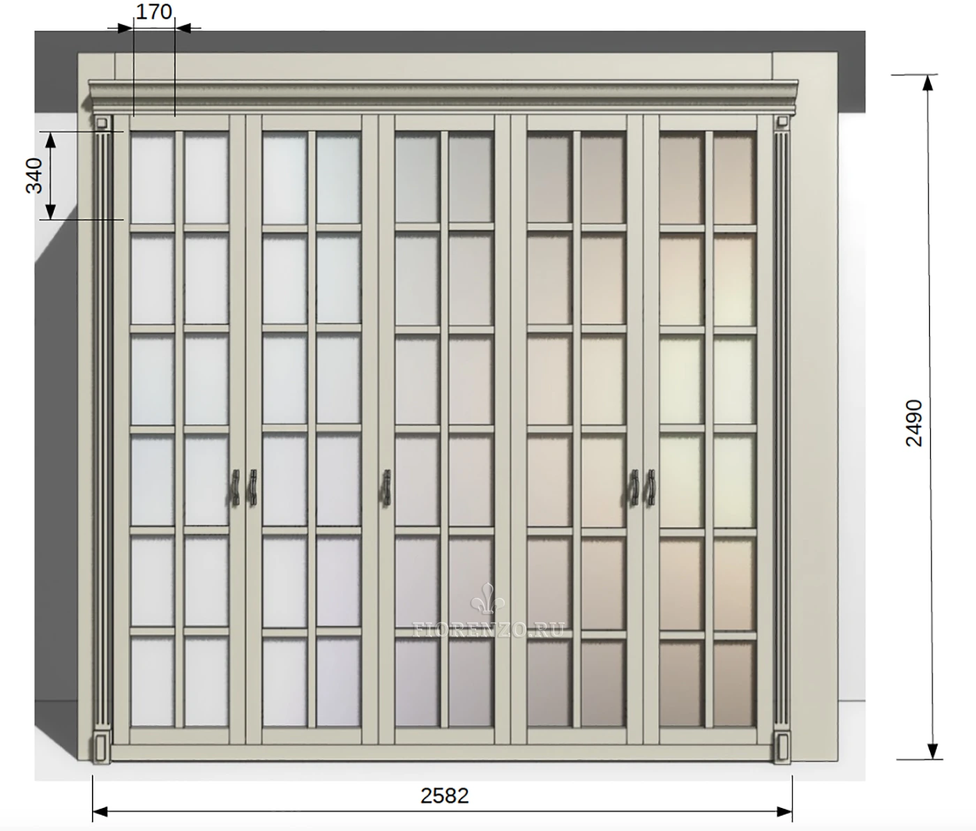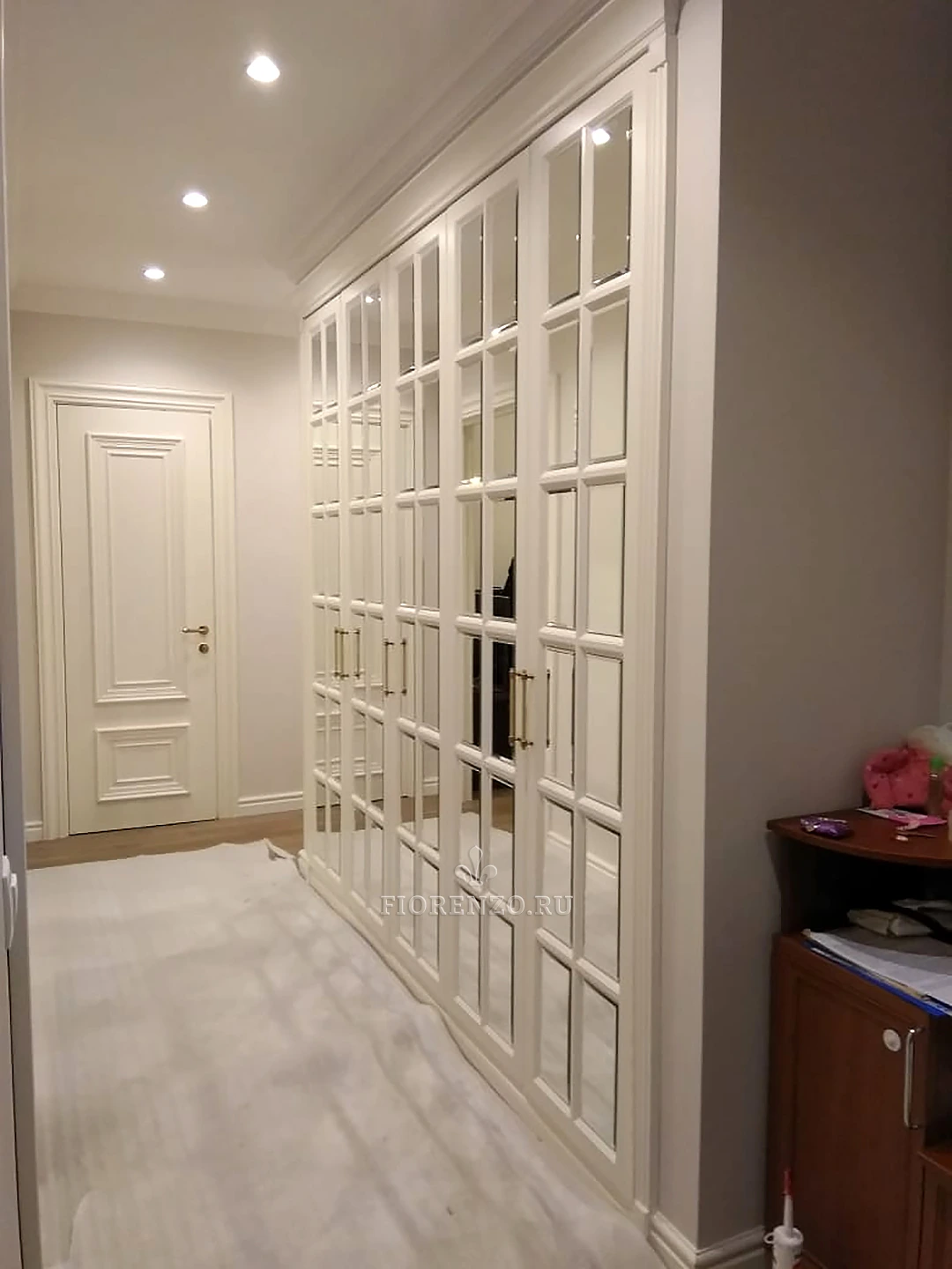 Специалисты мебельной компании «Fiorenzo Мебель» спроектировали встроенный шкаф «Вирден» для ниши в классическом стиле. Изделие органично вписывается в интерьер, смотрится привлекательно, а зеркала с фацетами визуально расширяют относительно узкое пространство. Для декора использовали фасады с филенками, массивный карниз и пилястры, оригинальные ручки «под старину».