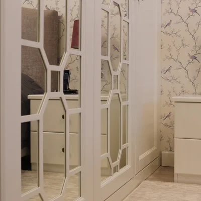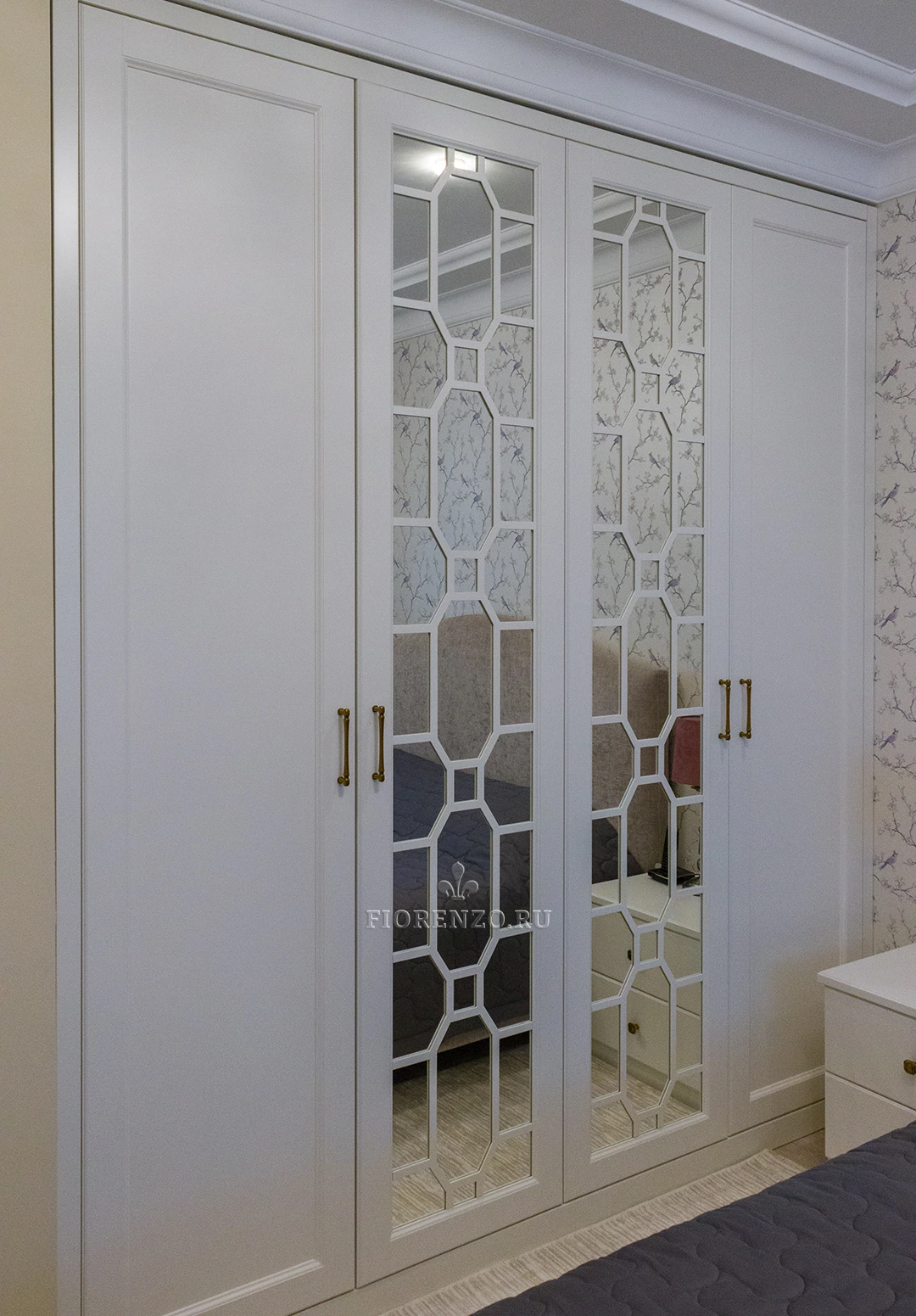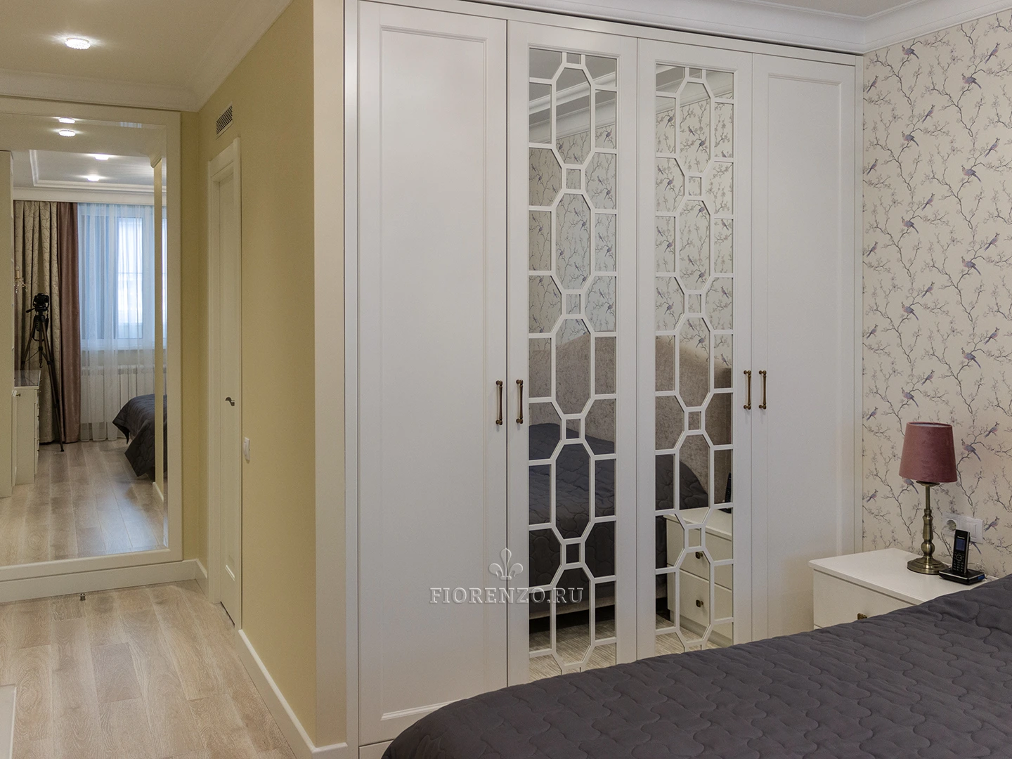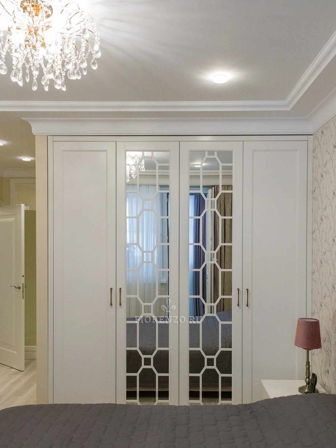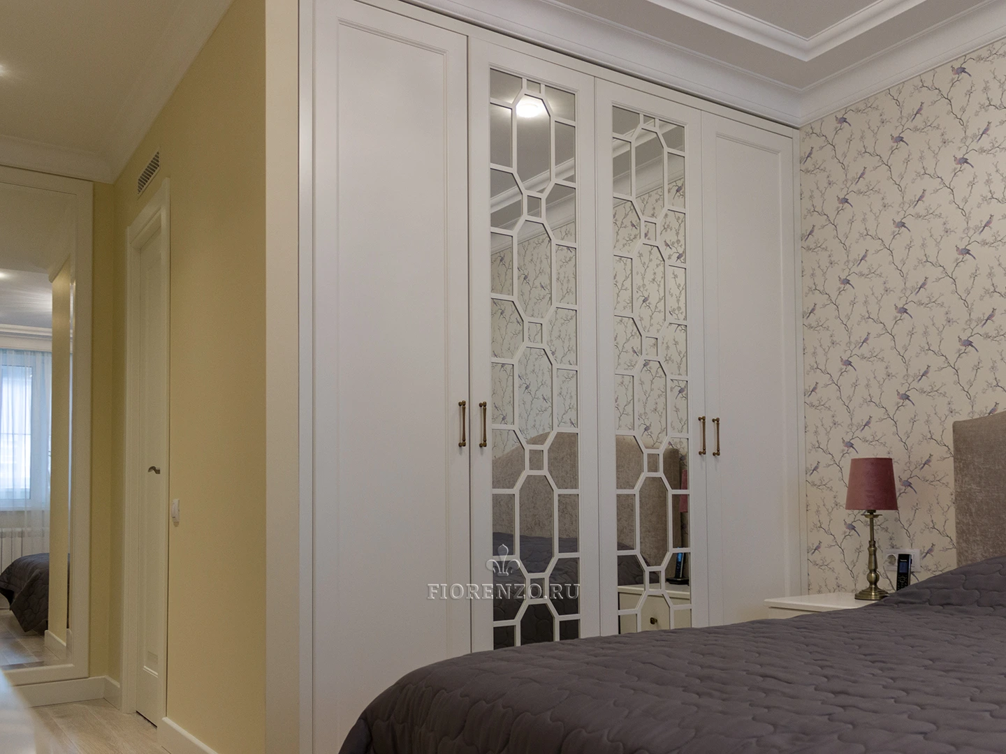 Мастера «Фиорензо» создали встроенный зеркальный шкаф «Ален» для спальни с раскладкой под заказ. Мебель изготовлена по эскизам клиента, поэтому полностью удовлетворяет его требования относительно наполнения и дизайна. В качестве декора использовались фасады с филенкой и раскладкой на зеркале – они смотрятся стильно и оригинально. Дизайн и комплектация подбирались в 3D-программах при плотном взаимодействии с заказчиком.
