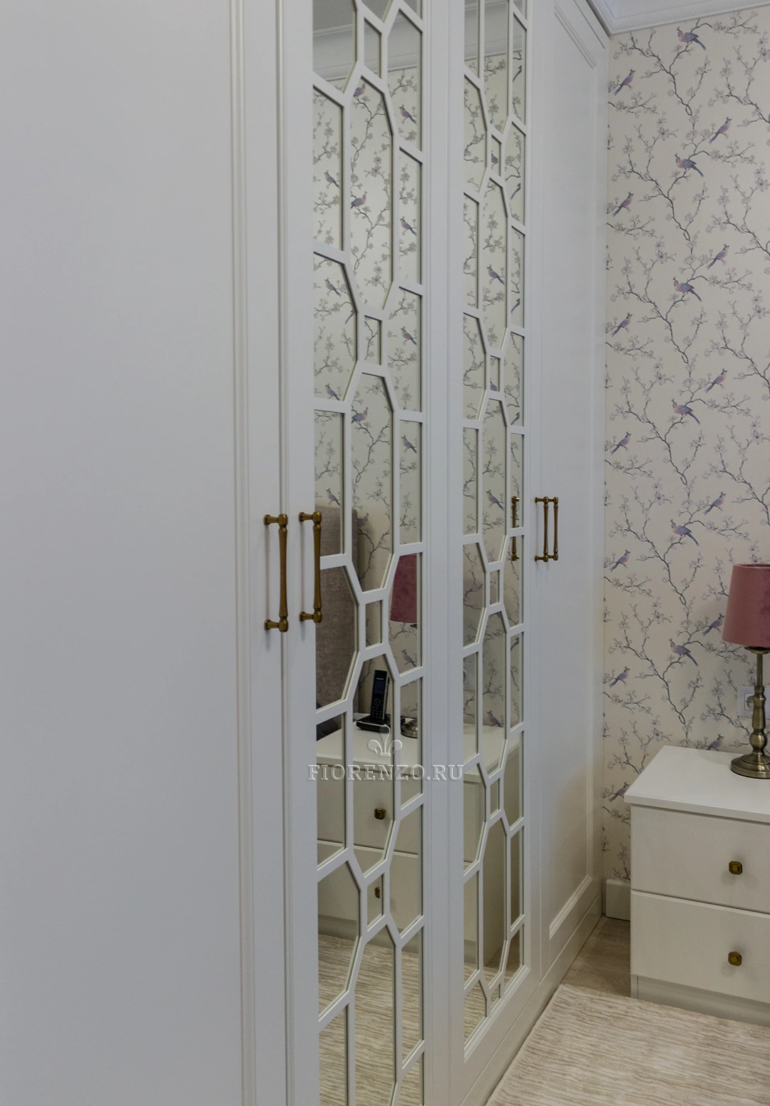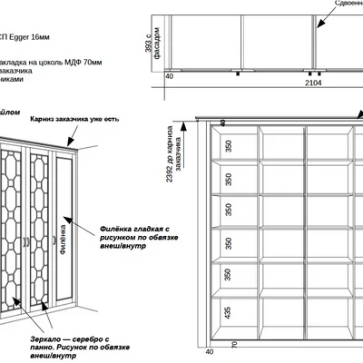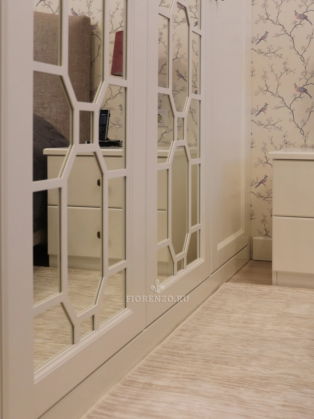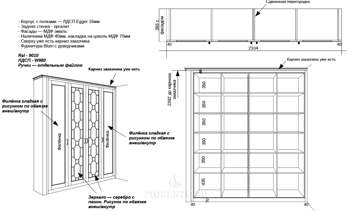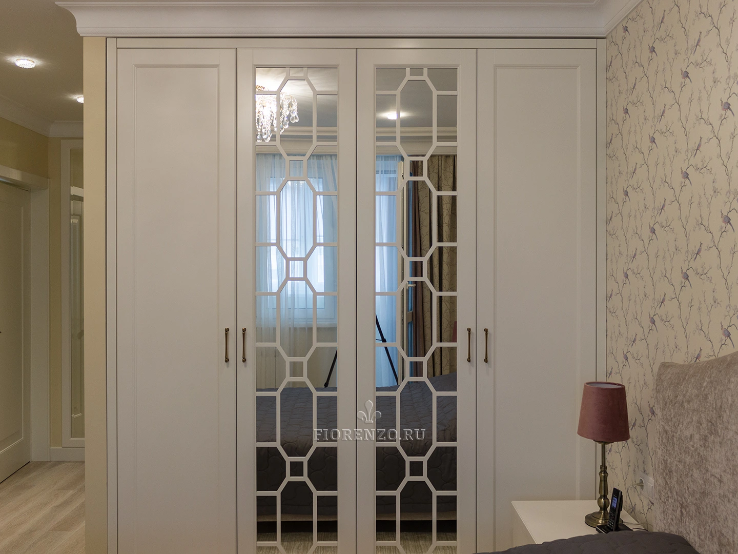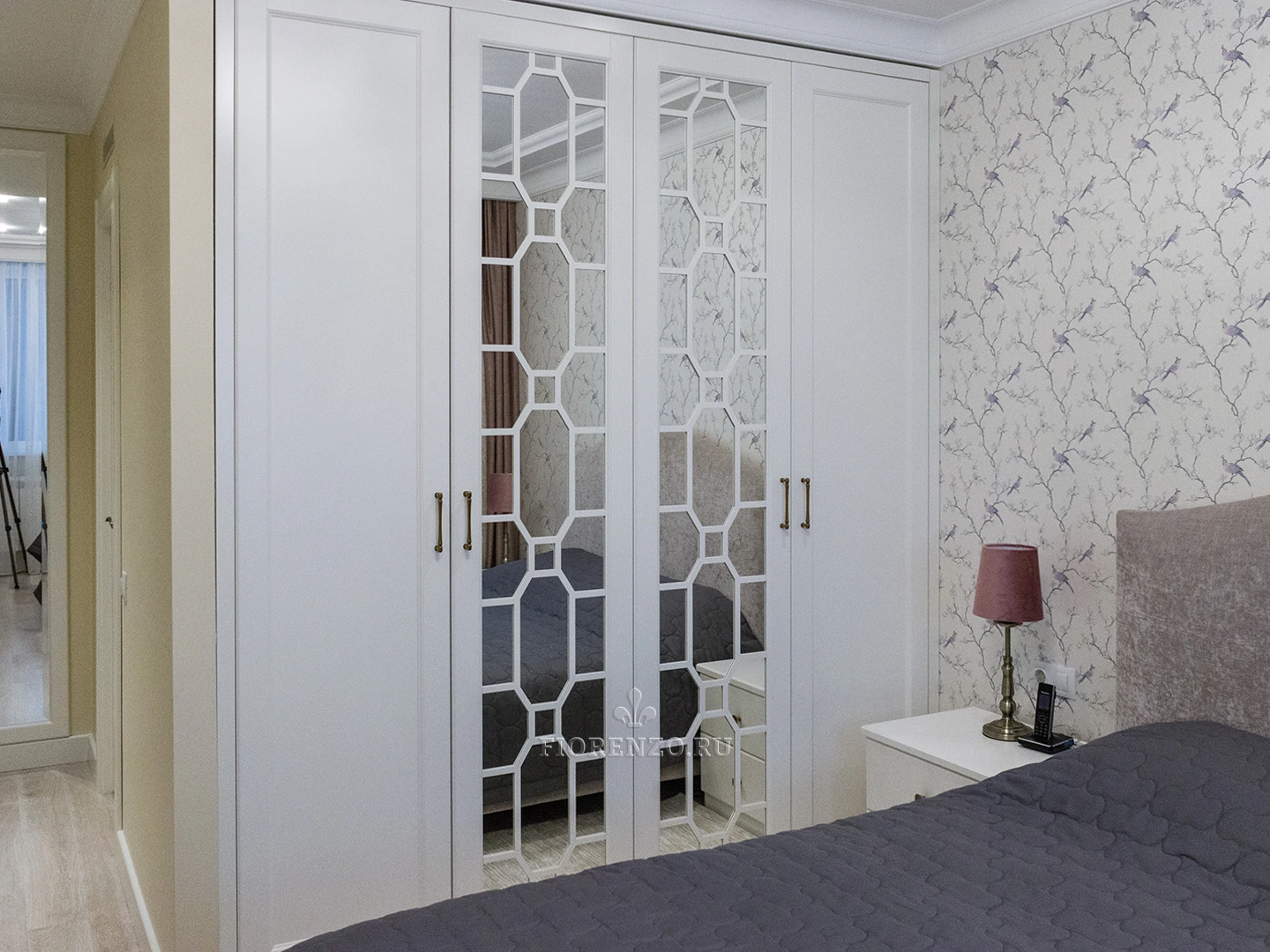 Мастера «Фиорензо» создали встроенный зеркальный шкаф «Ален» для спальни с раскладкой под заказ. Мебель изготовлена по эскизам клиента, поэтому полностью удовлетворяет его требования относительно наполнения и дизайна. В качестве декора использовались фасады с филенкой и раскладкой на зеркале – они смотрятся стильно и оригинально. Дизайн и комплектация подбирались в 3D-программах при плотном взаимодействии с заказчиком.
