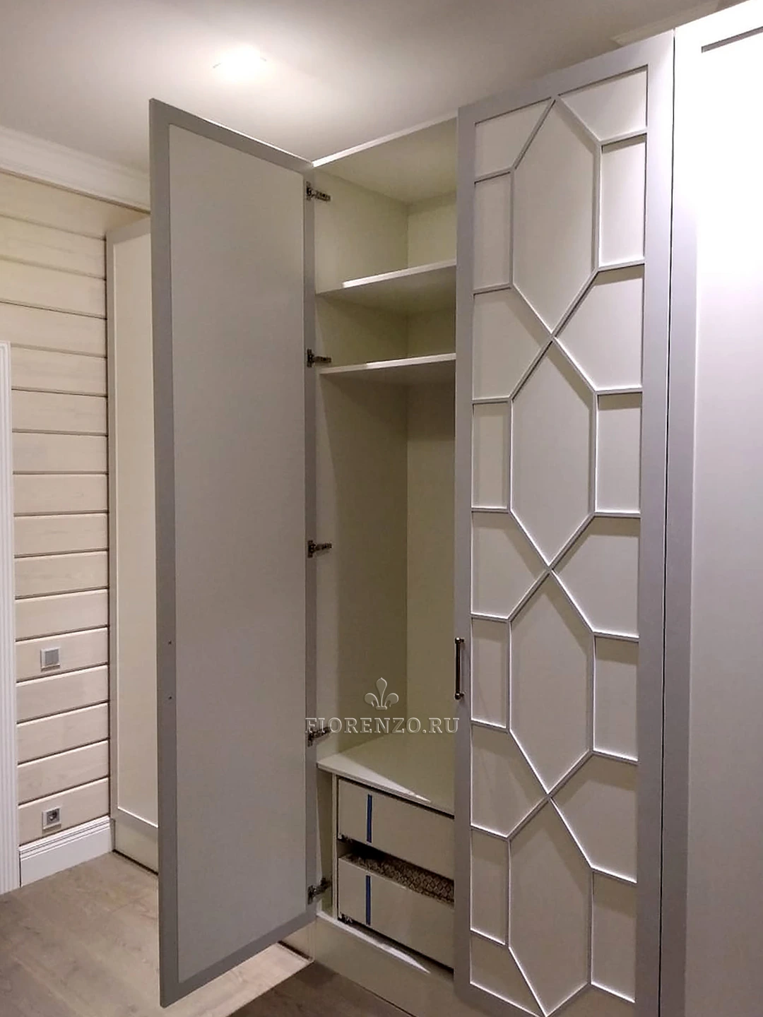 Фасады шкафа в стиле «неоклассика» – крашеное МДФ по раскладке RAL. Корпус и внутренние детали – ламинированная плита «Эггер» бренда из Австрии. Фурнитура и крепеж мебели – европейский производитель компания HARN.