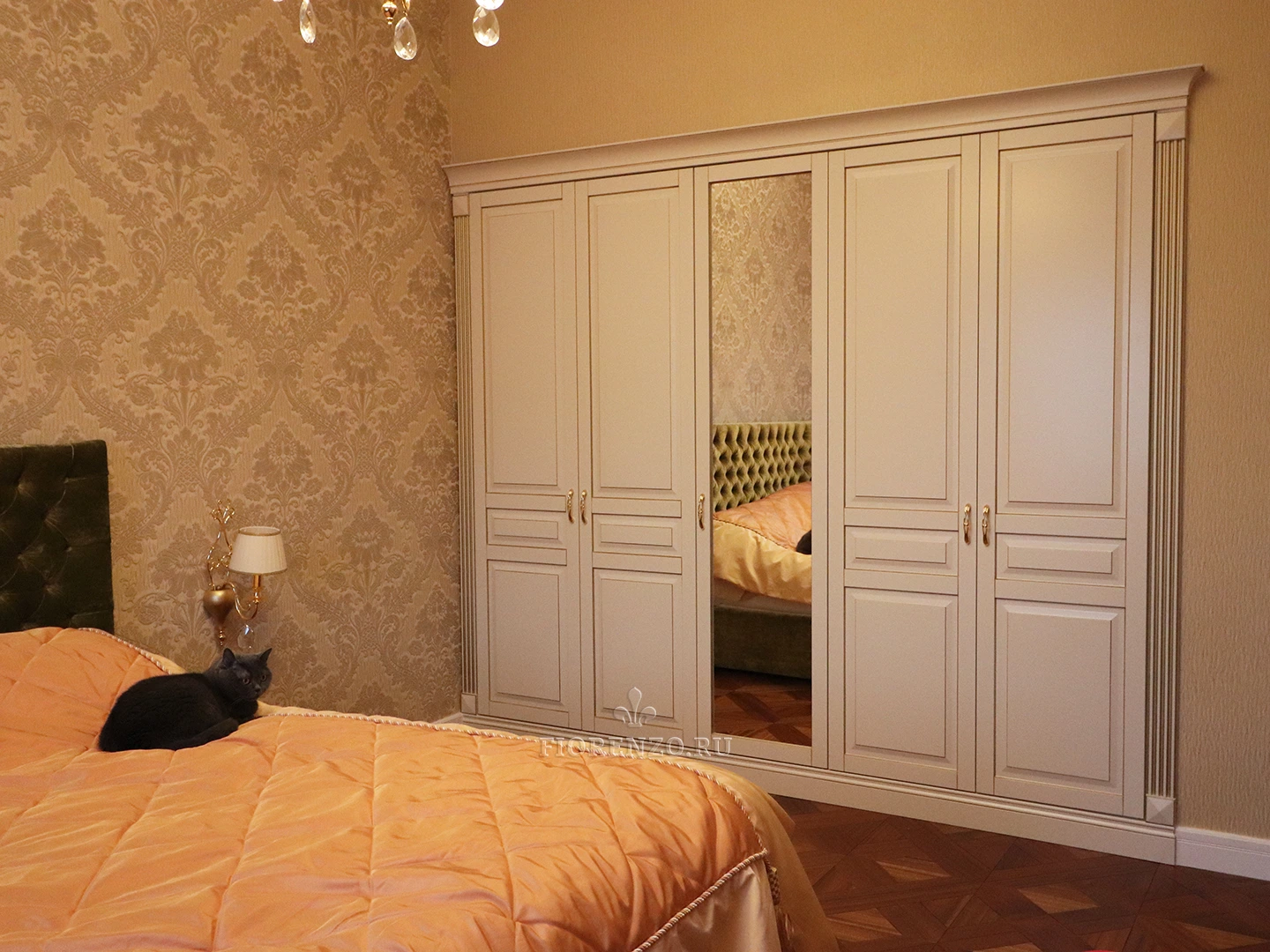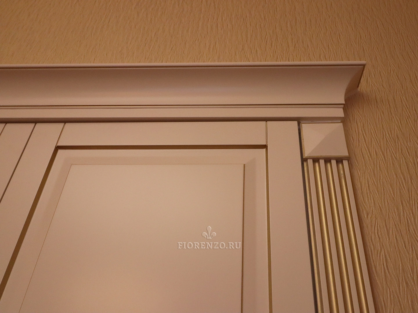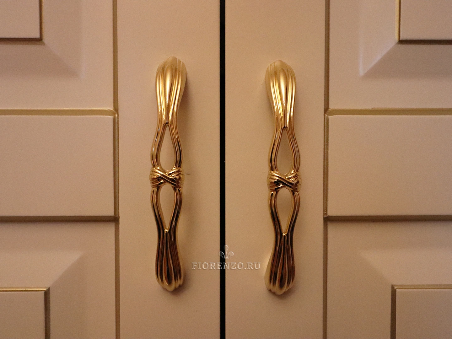 Фасадная часть и декоративные элементы изготовлены из крашеного МДФ эмалью Sayerlack с нанесением золотой патины. Внутренние детали – из австрийского ЛДСП торговой марки Egger, обладающего экологическими сертификатами. Фурнитура – от компании Blum с доводчиками и газовыми амортизаторами.
