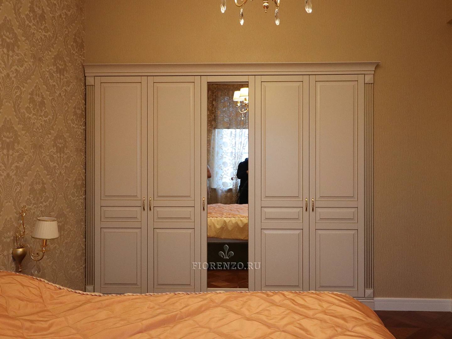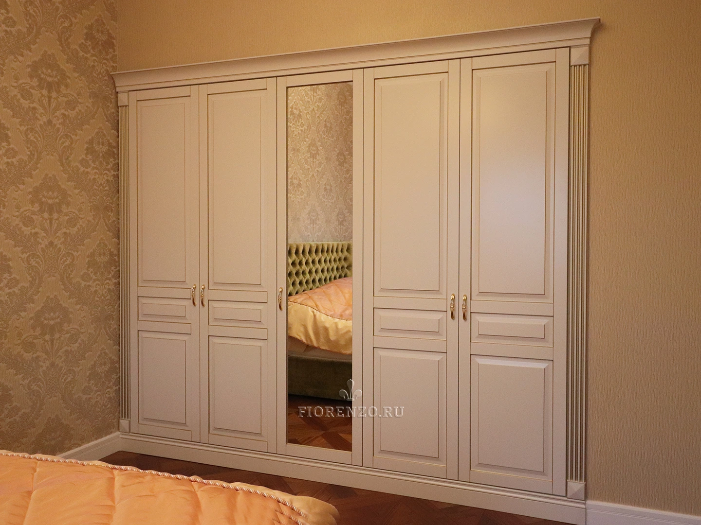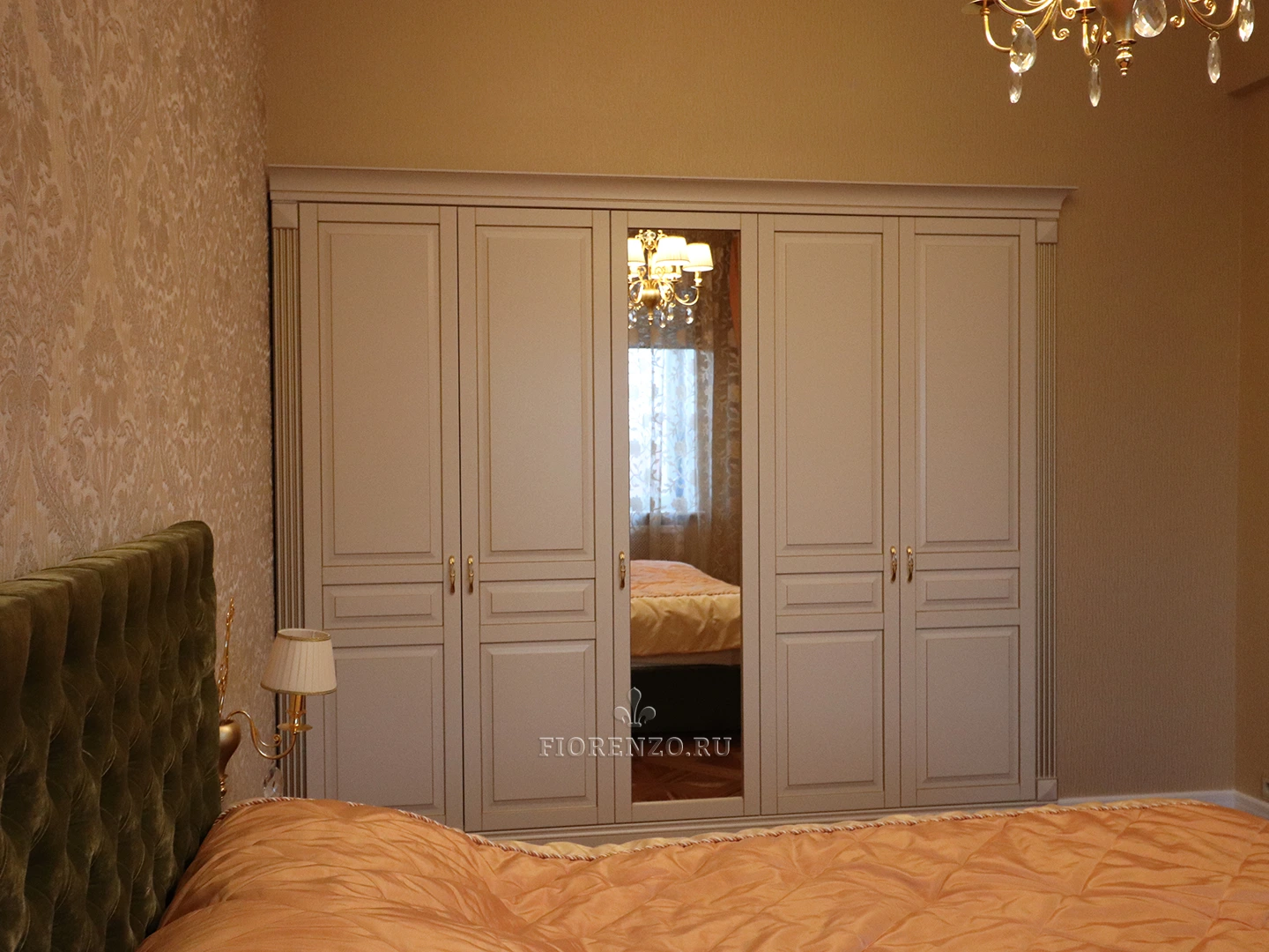 Фасадная часть и декоративные элементы изготовлены из крашеного МДФ эмалью Sayerlack с нанесением золотой патины. Внутренние детали – из австрийского ЛДСП торговой марки Egger, обладающего экологическими сертификатами. Фурнитура – от компании Blum с доводчиками и газовыми амортизаторами.