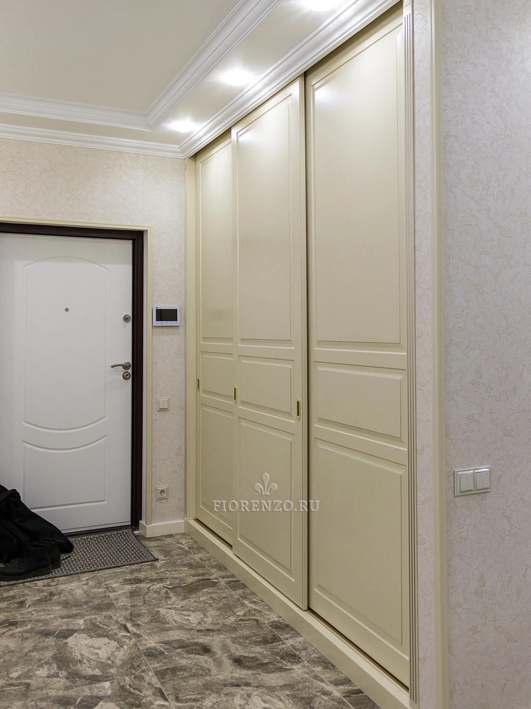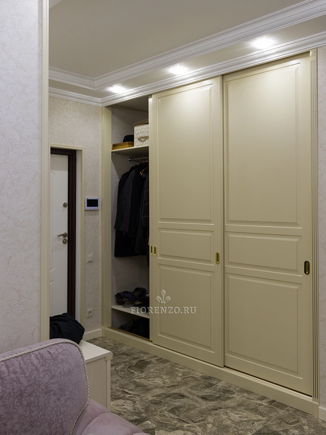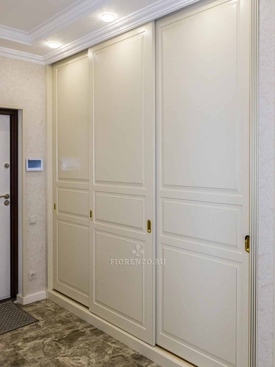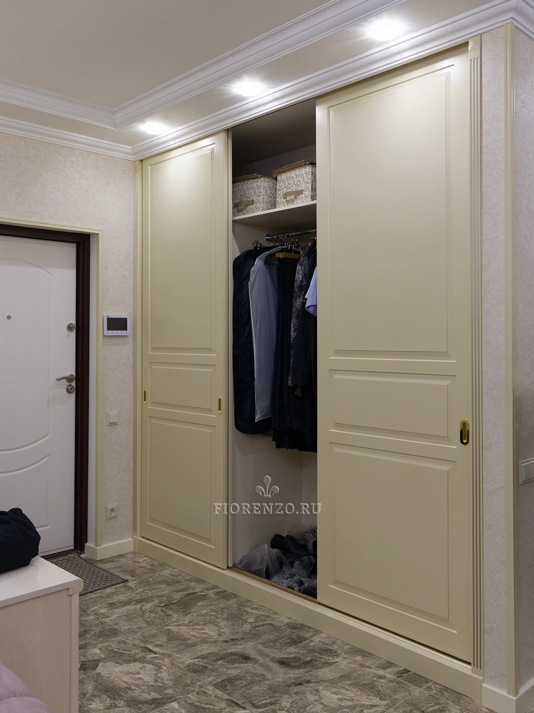 FIORENZO изготавливает мебель по типовым и индивидуальным проектам, работает по замерам и гарантирует – тот шкаф, который вы получите, идеально впишется именно в ваше помещение. Модель типа купе для прихожей очень вместительная, но монументально или громоздко не выглядит. Она станет идеальным выбором для квартиры-студии или просто небольшой прихожей. Тип установки – встраиваемый. Для открывания дверей не нужно место – они перемещаются по направляющим в стороны.