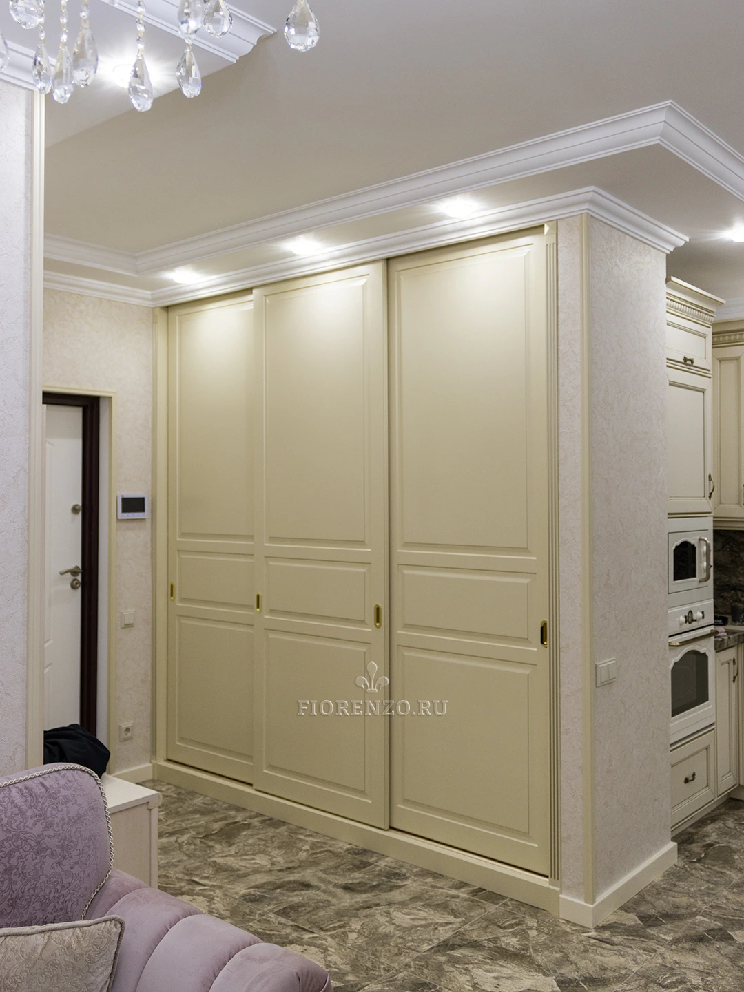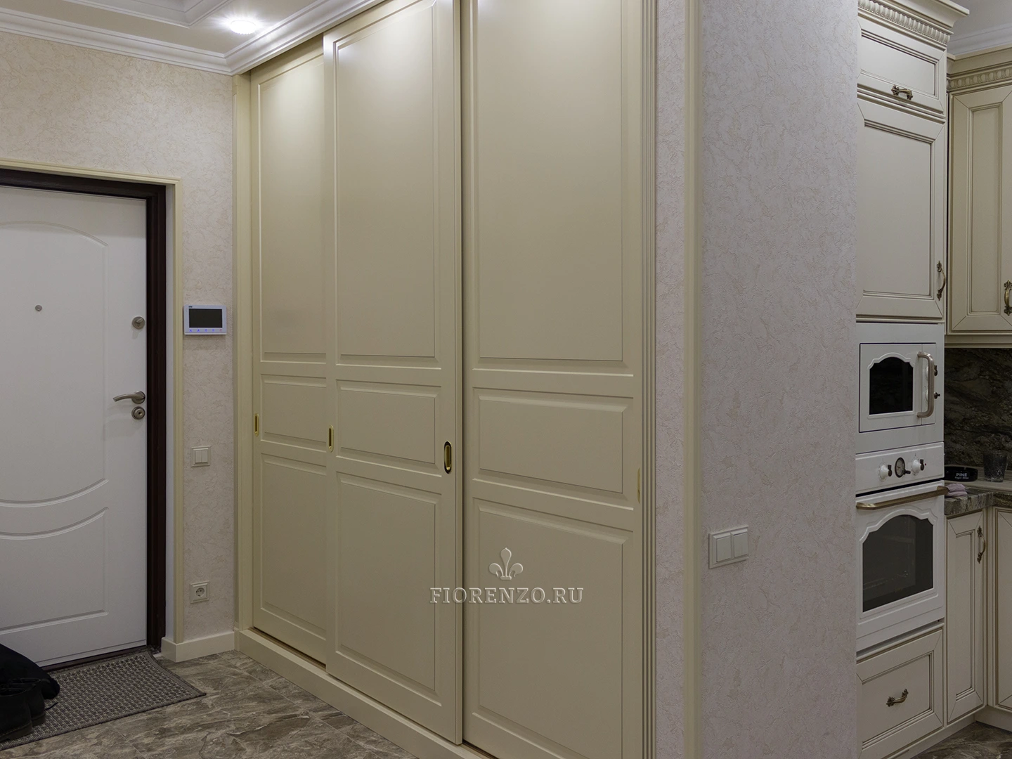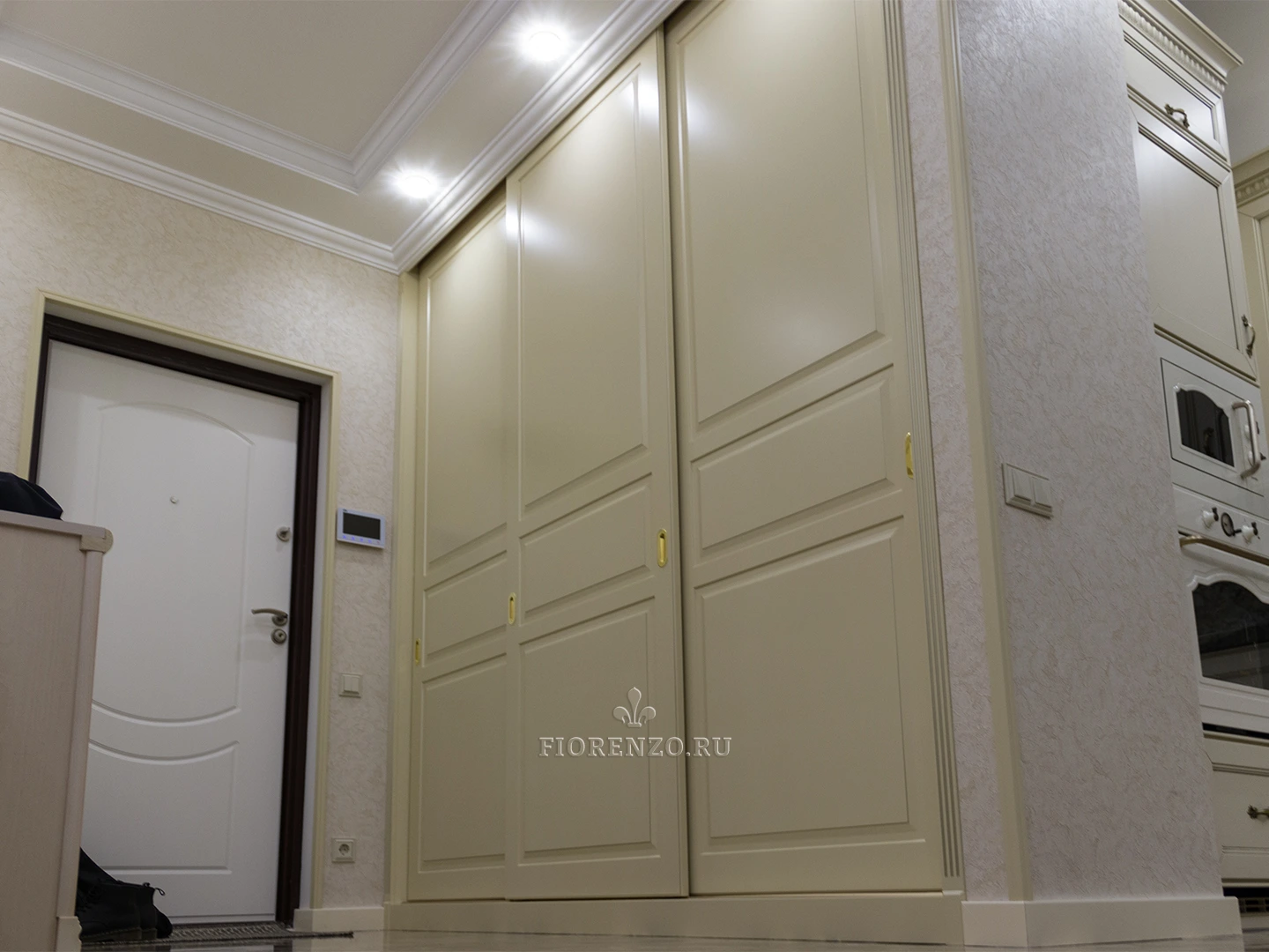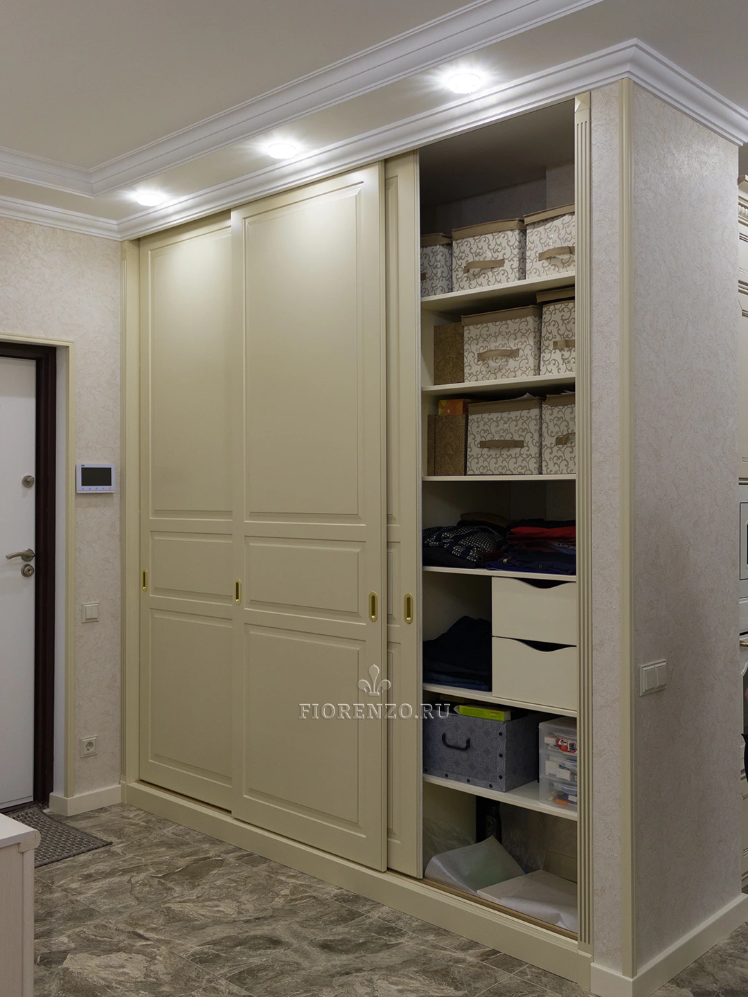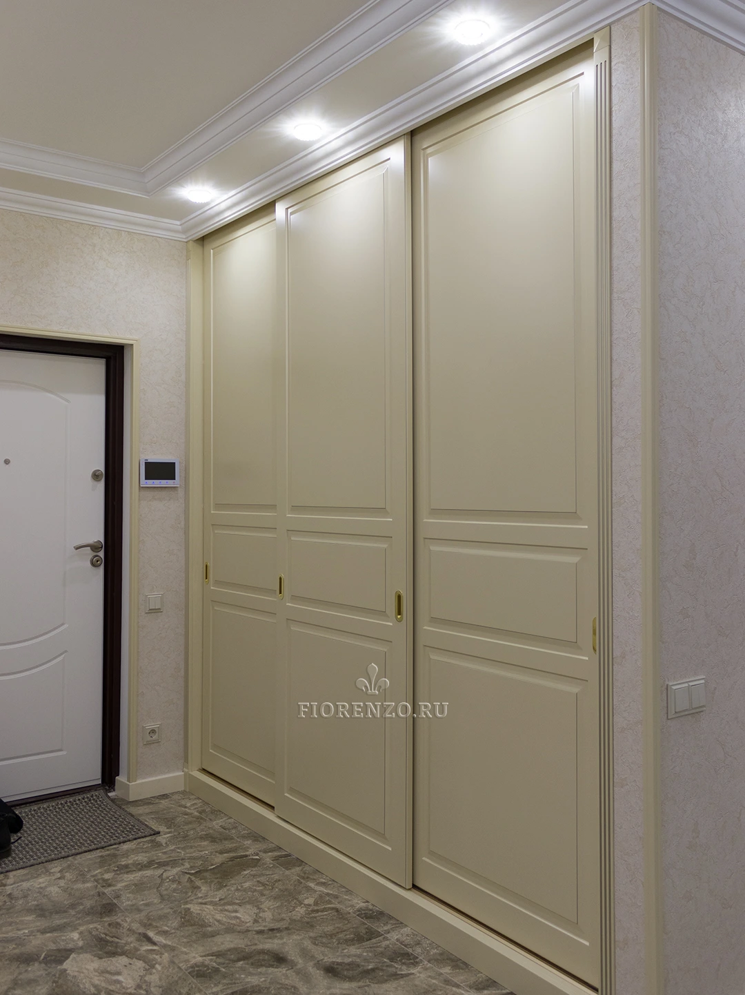FIORENZO изготавливает мебель по типовым и индивидуальным проектам, работает по замерам и гарантирует – тот шкаф, который вы получите, идеально впишется именно в ваше помещение. Модель типа купе для прихожей очень вместительная, но монументально или громоздко не выглядит. Она станет идеальным выбором для квартиры-студии или просто небольшой прихожей. Тип установки – встраиваемый. Для открывания дверей не нужно место – они перемещаются по направляющим в стороны.