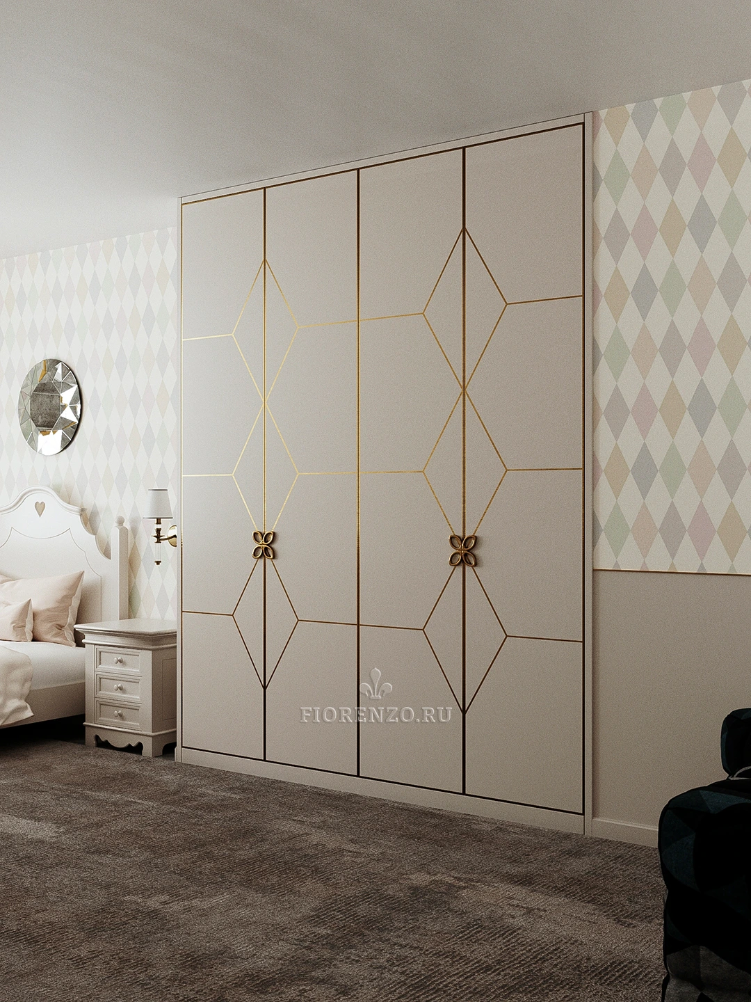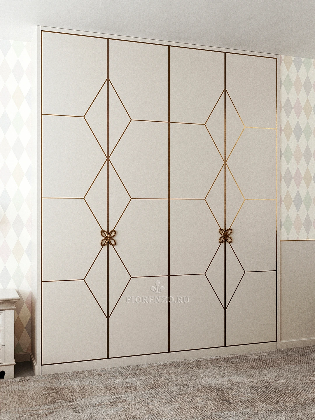 Шкаф в современном стиле в детскую комнату, встроен в нишу и изготовлен по индивидуальным размерам. Название изделия «Геометрия» подчеркивают фрезерованные фасады на ЧПУ оборудовании, декорированные патиной.