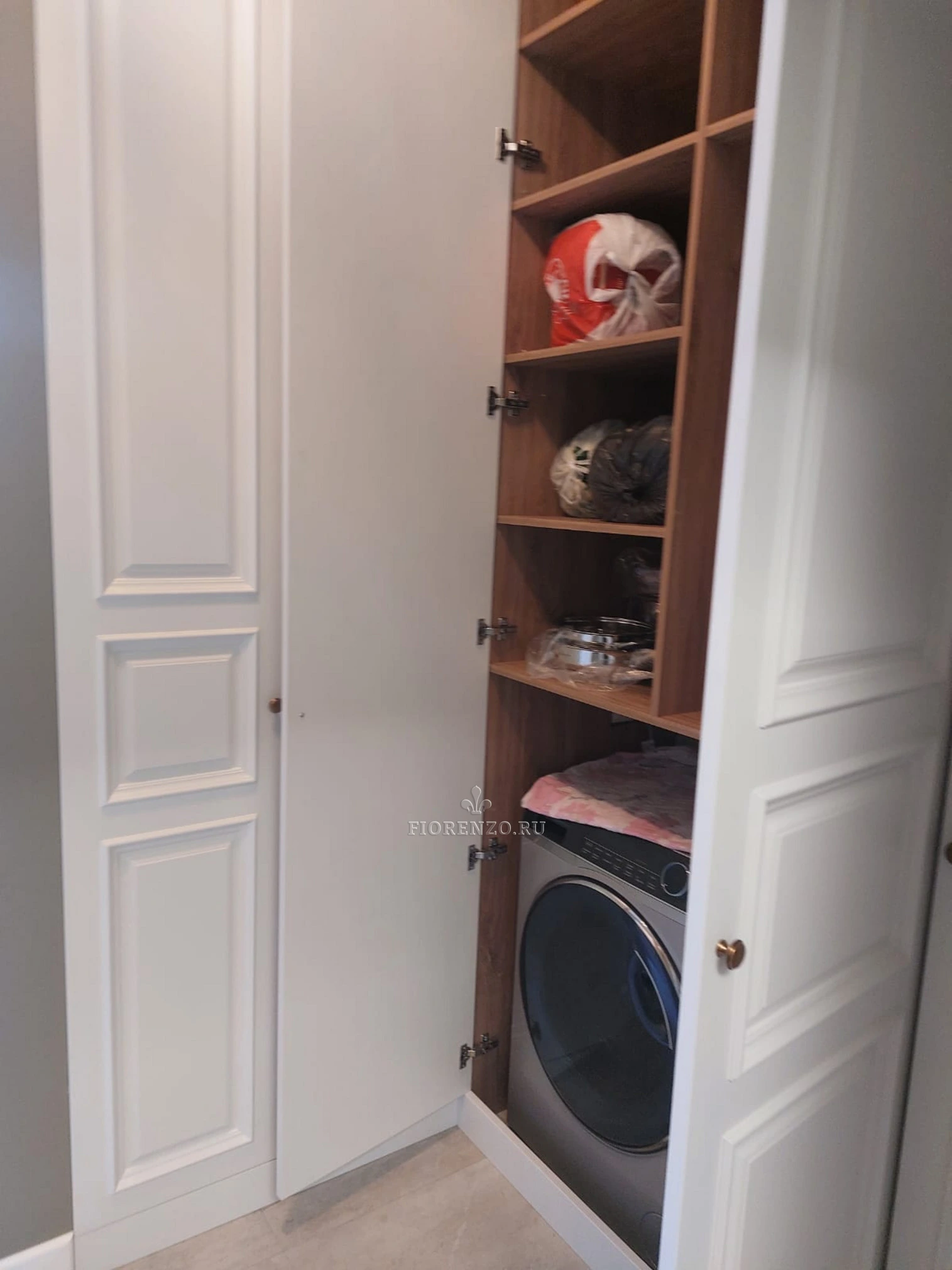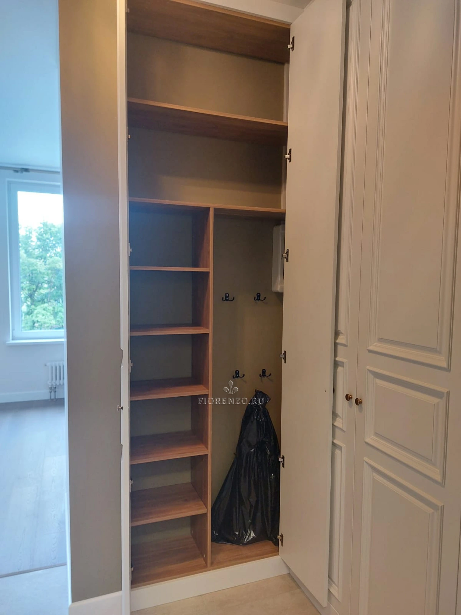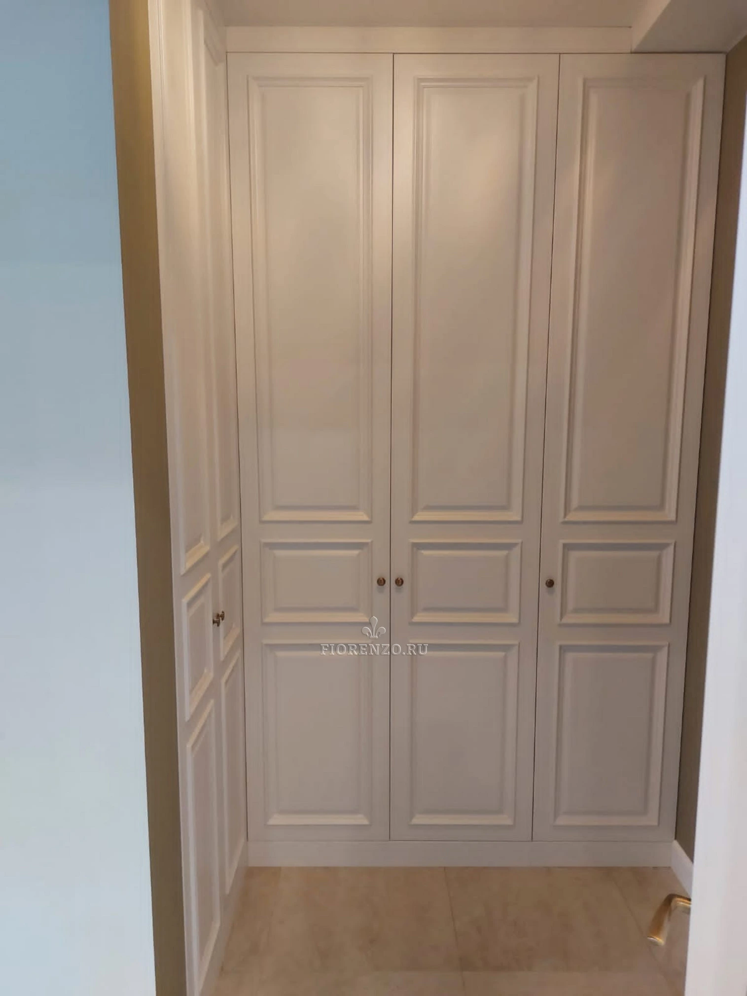Элегантный встроенный угловой шкаф в классическом стиле. Выполнен с фрезерованными рамочными фасадами и аккуратными латунными ручками — гармонично вписывается в прихожую или гардеробную комнату.