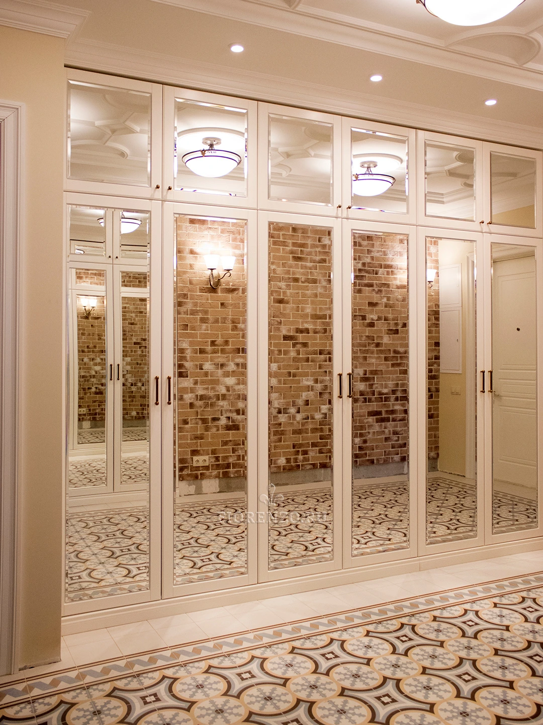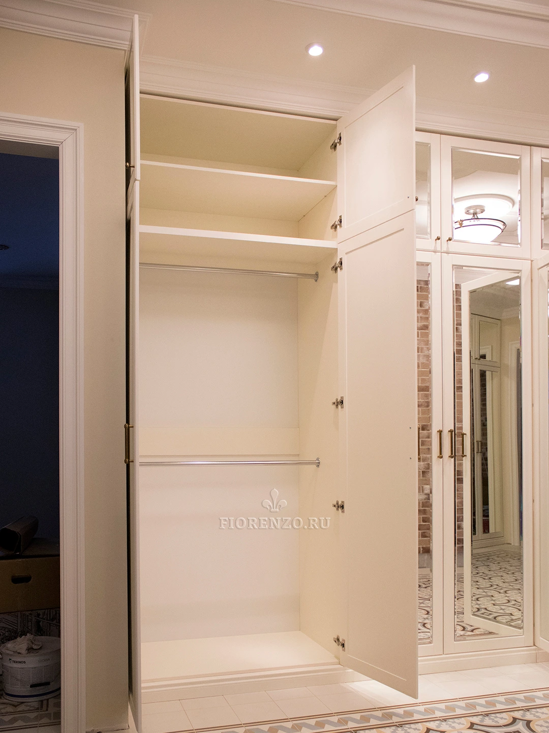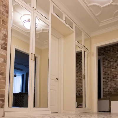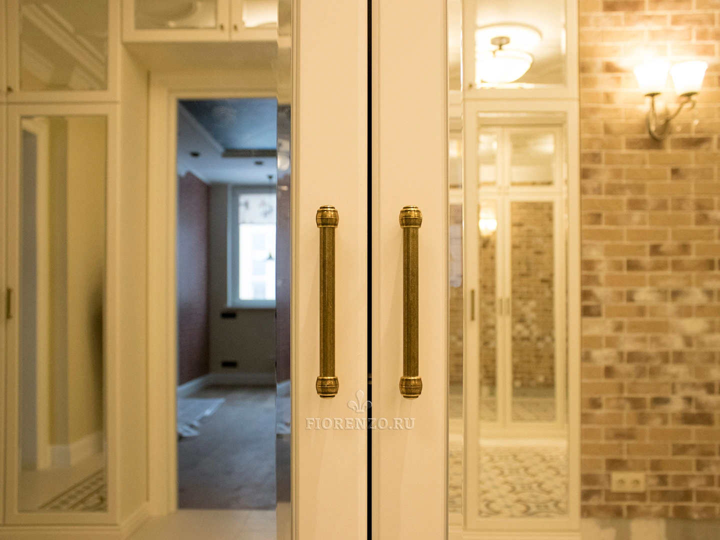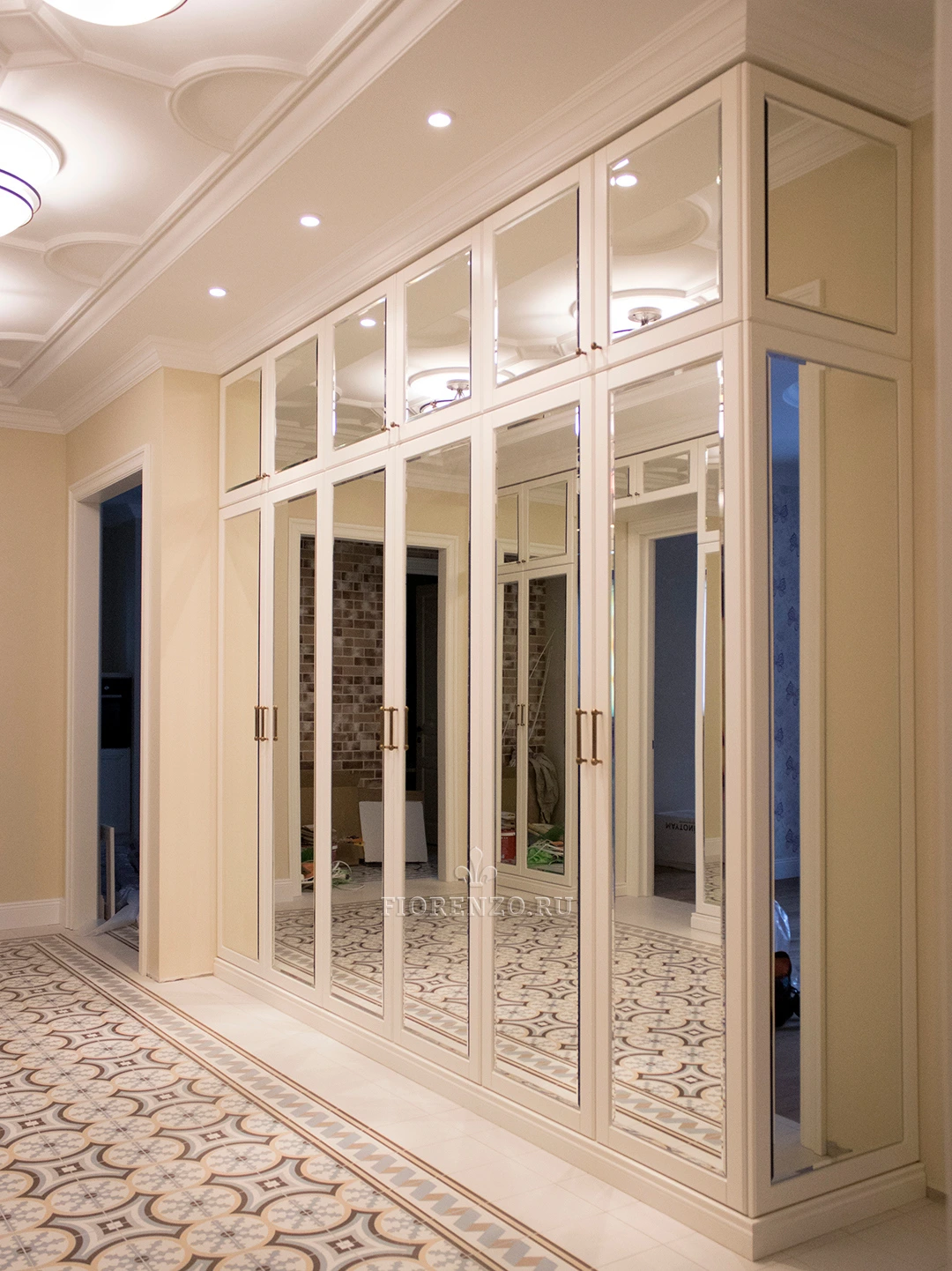 Дизайнеры «Фиорензо Мебель» изготовили шикарную прихожую под заказ «Эберн», состоящую из зеркальных шкафов встроенного типа, благодаря которым просторное помещение визуально становится еще шире и светлее. Мебель установлена друг напротив друга и выполнена в едином классическом стиле, особенности которого – филенчатые фасады с фацетами и стильные металлические ручки «под бронзу». При входе в комнату шкафы образуют своеобразную арку, смотрящуюся невероятно привлекательно.