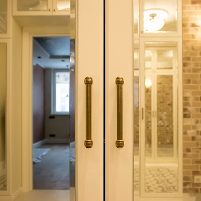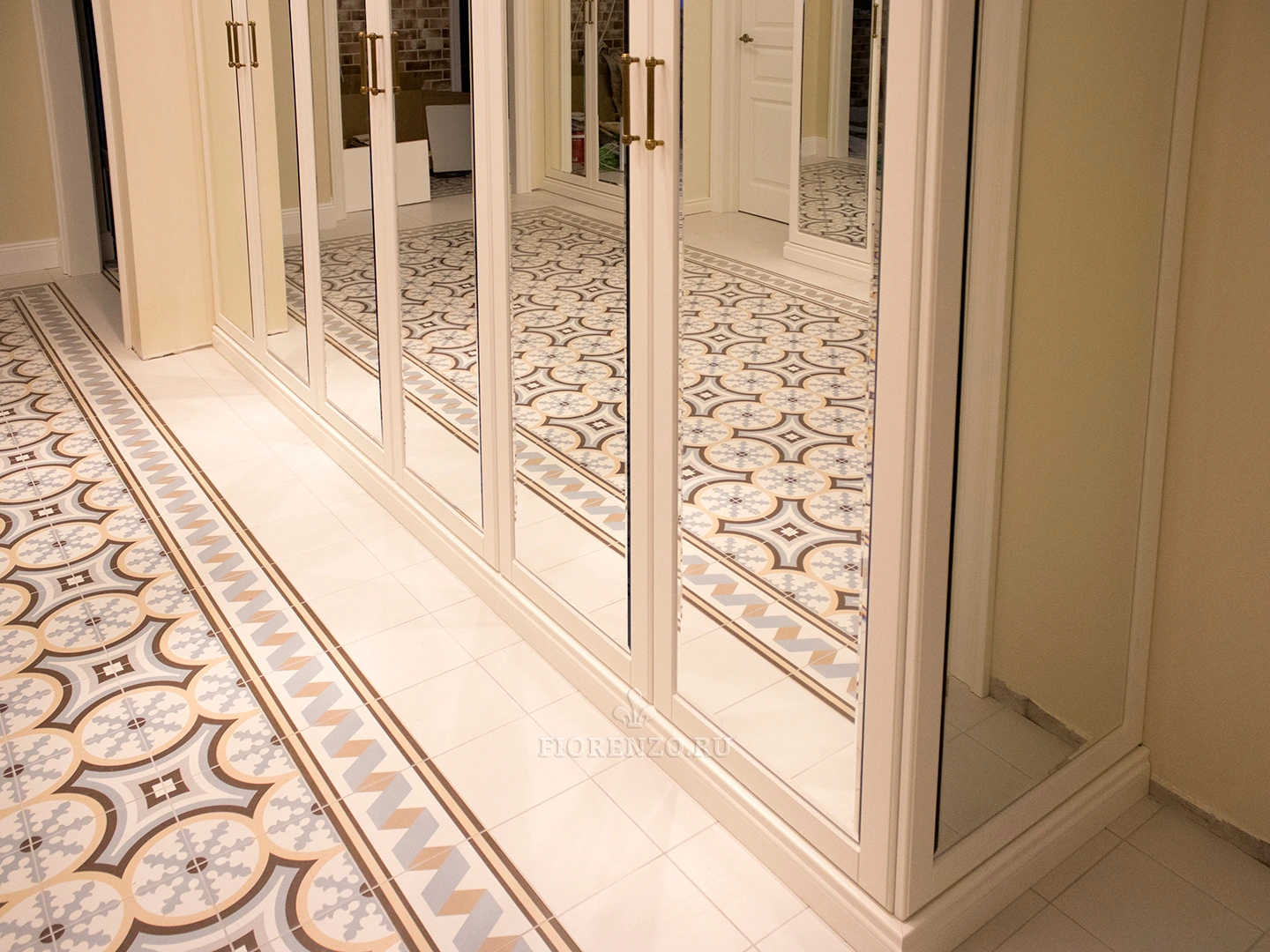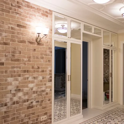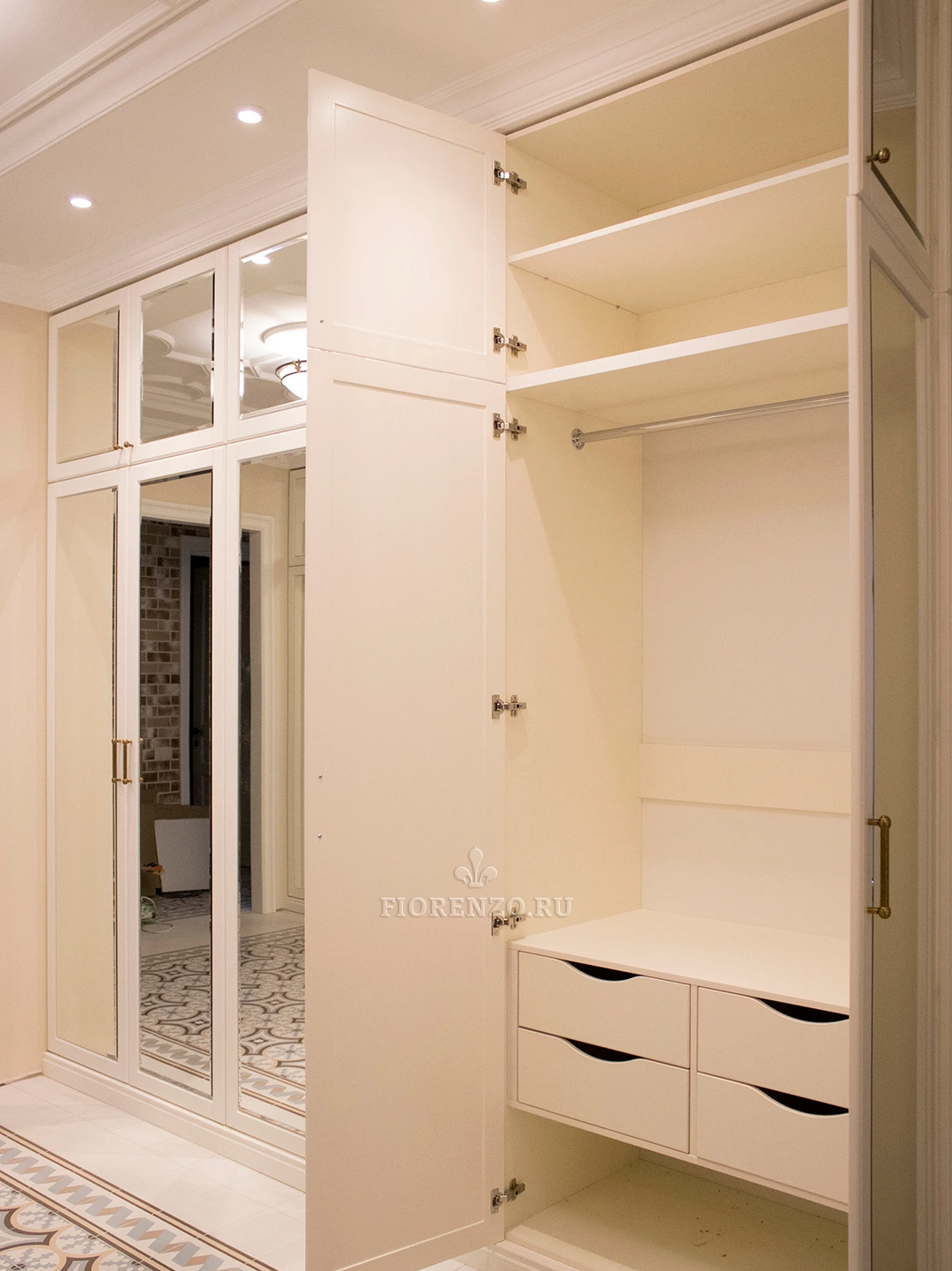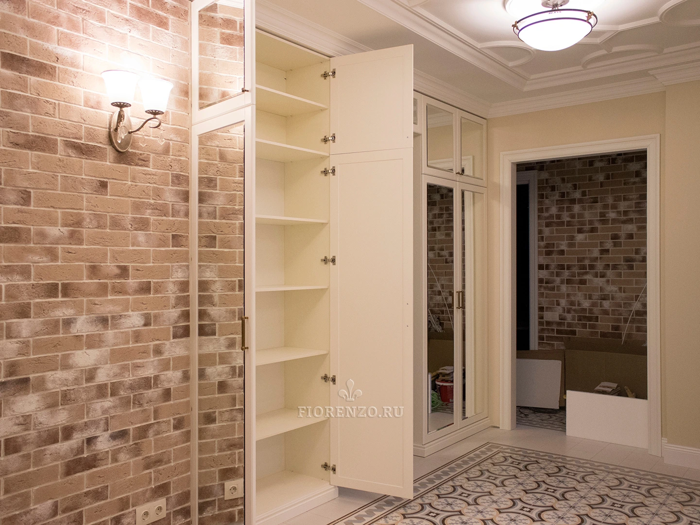 Дизайнеры «Фиорензо Мебель» изготовили шикарную прихожую под заказ «Эберн», состоящую из зеркальных шкафов встроенного типа, благодаря которым просторное помещение визуально становится еще шире и светлее. Мебель установлена друг напротив друга и выполнена в едином классическом стиле, особенности которого – филенчатые фасады с фацетами и стильные металлические ручки «под бронзу». При входе в комнату шкафы образуют своеобразную арку, смотрящуюся невероятно привлекательно.