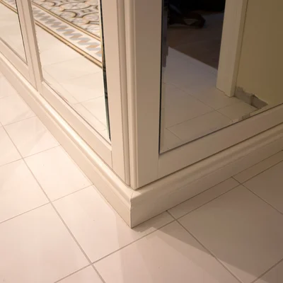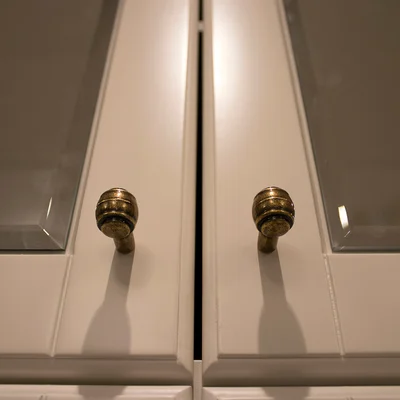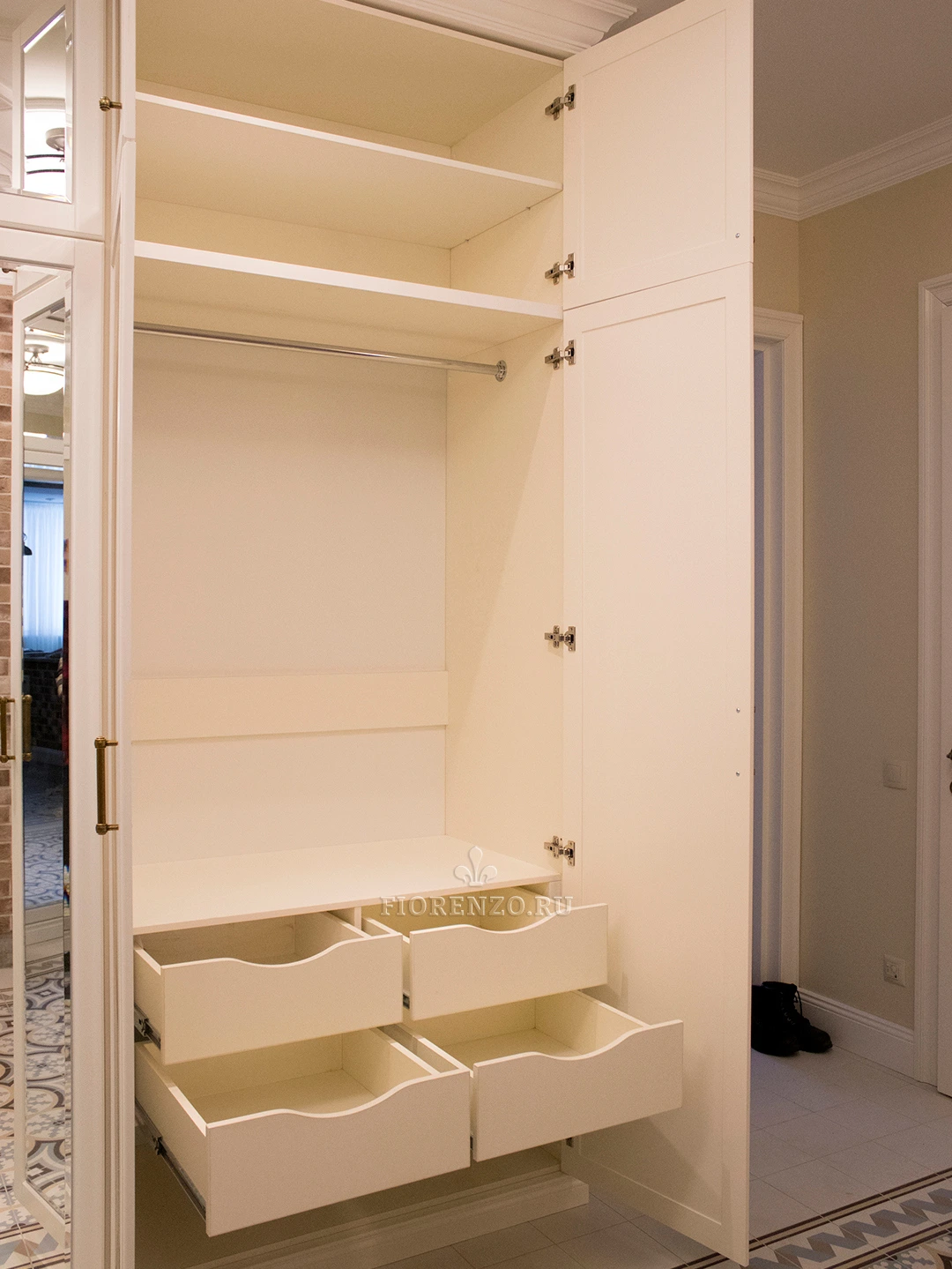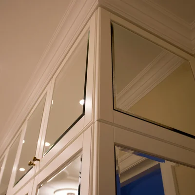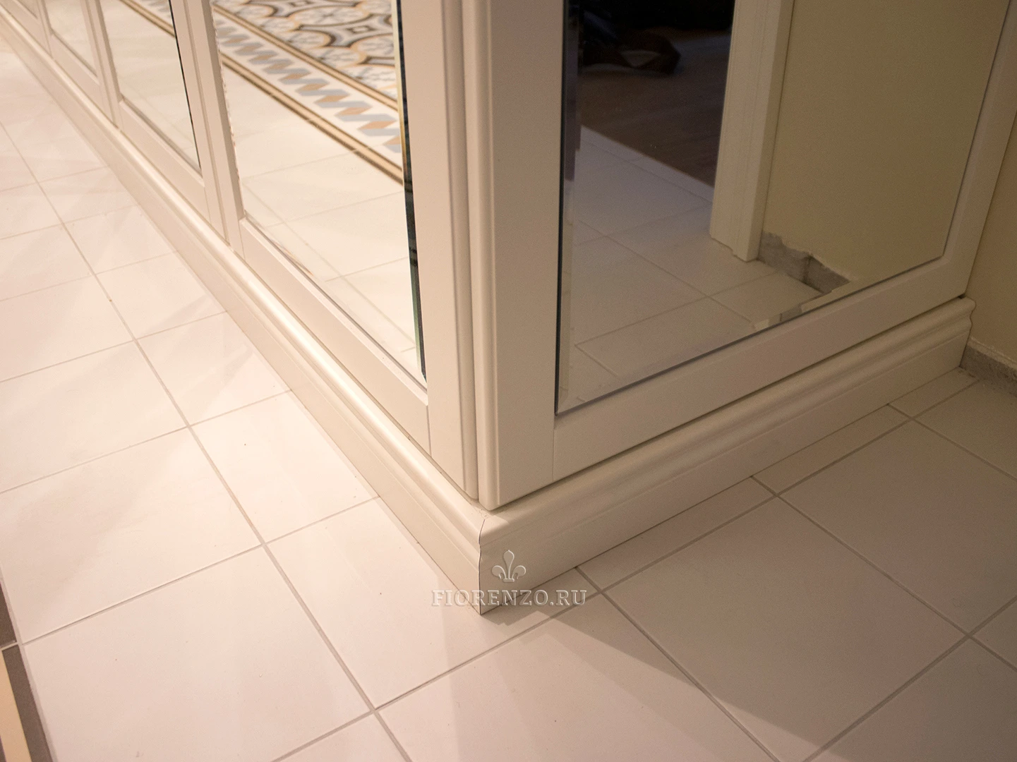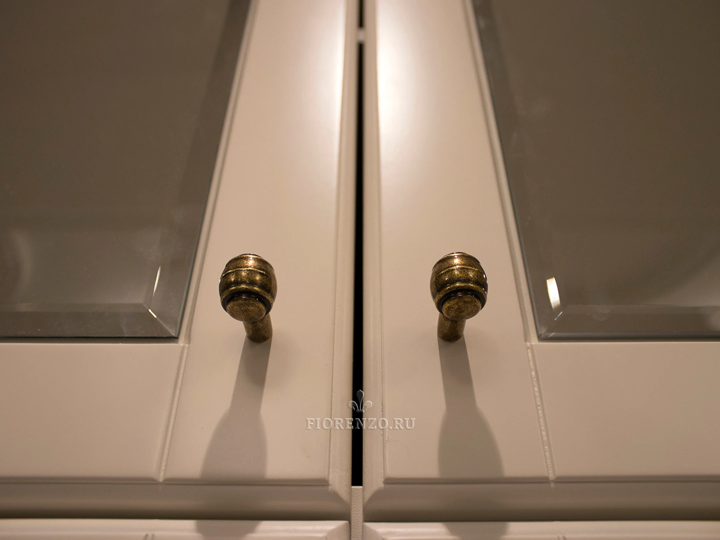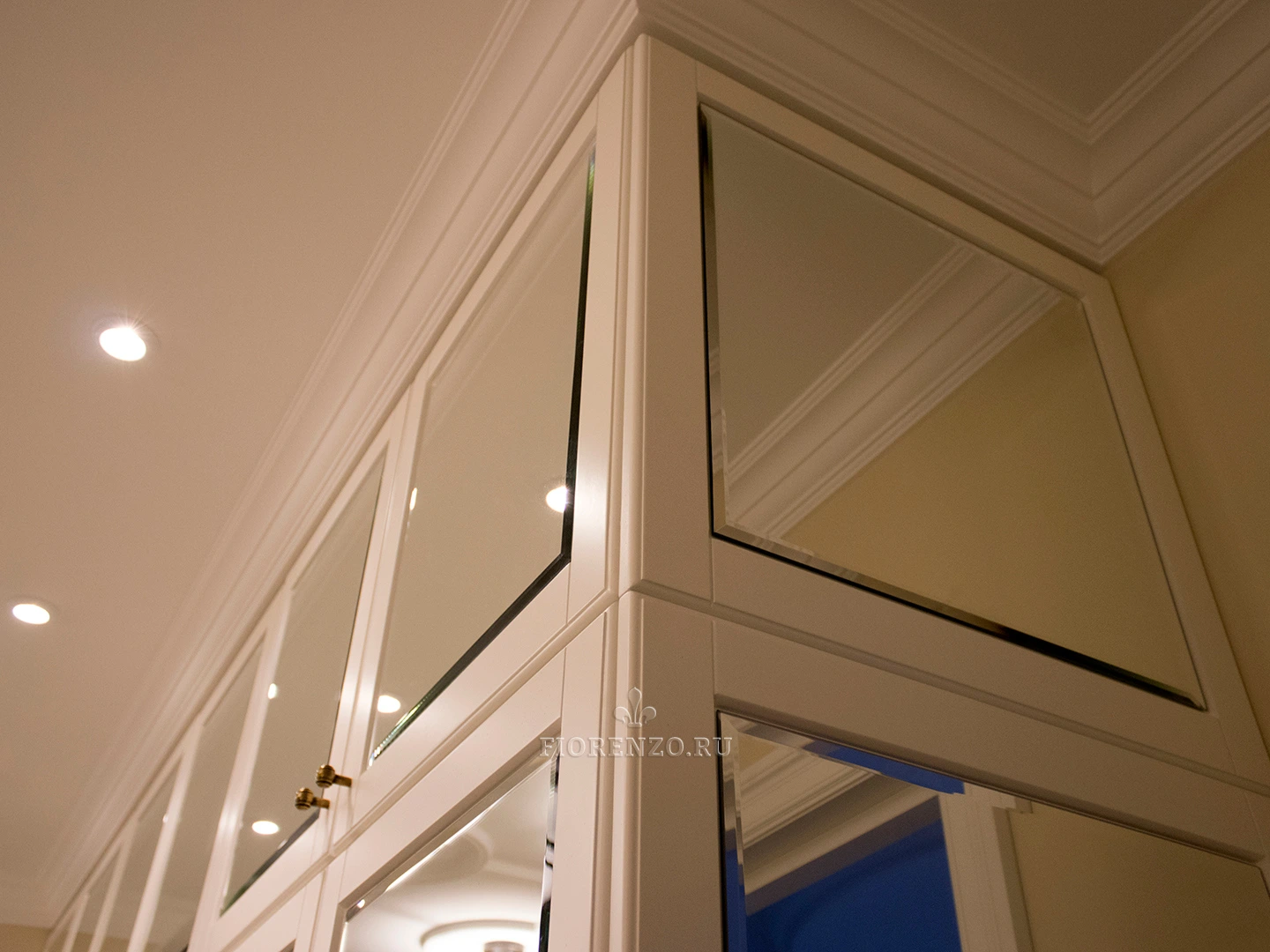 Фасадная часть и декоративные элементы (цоколя и карнизы) изготовлены из МДФ, покрытого акриловым лаком Sayerlack. В каждый фасадаы вставлено зеркало с фацетом. Внутренние детали и корпуса мебели – из ЛДСП Egger австрийского производителя. Фурнитура и комплектующие – от компании HARN. Видимая боковая стенка шкафа также закрыта фасадом из МДФ.