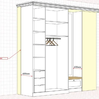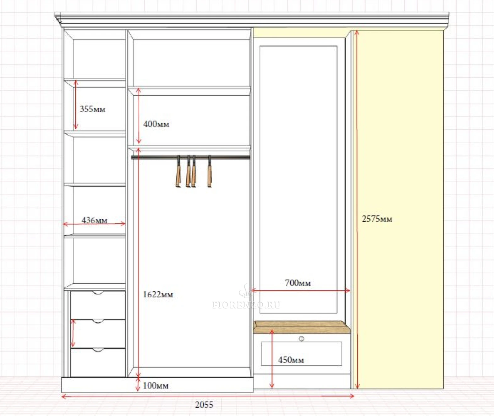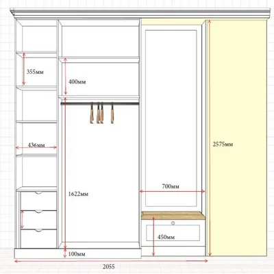 В состав прихожей входит не только шкаф, но и открытая вешалка, тумба для обуви. Если не устраивает базовый цвет, присмотрите другие варианты согласно палитре RAL и NCS.